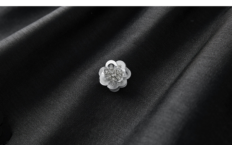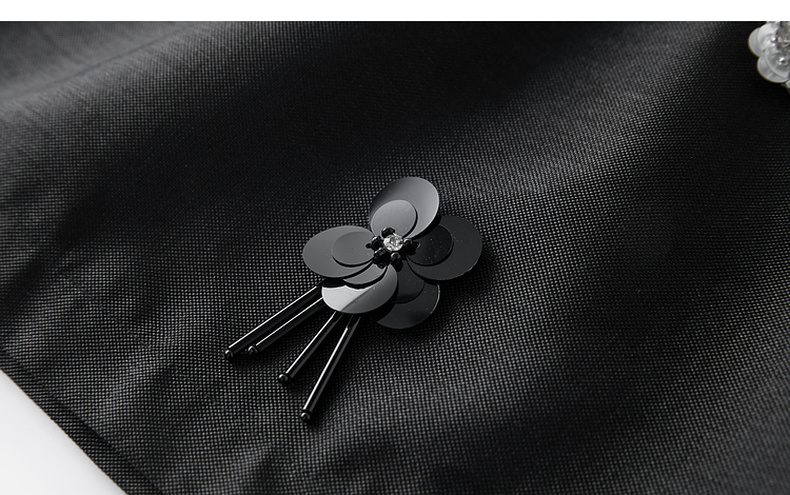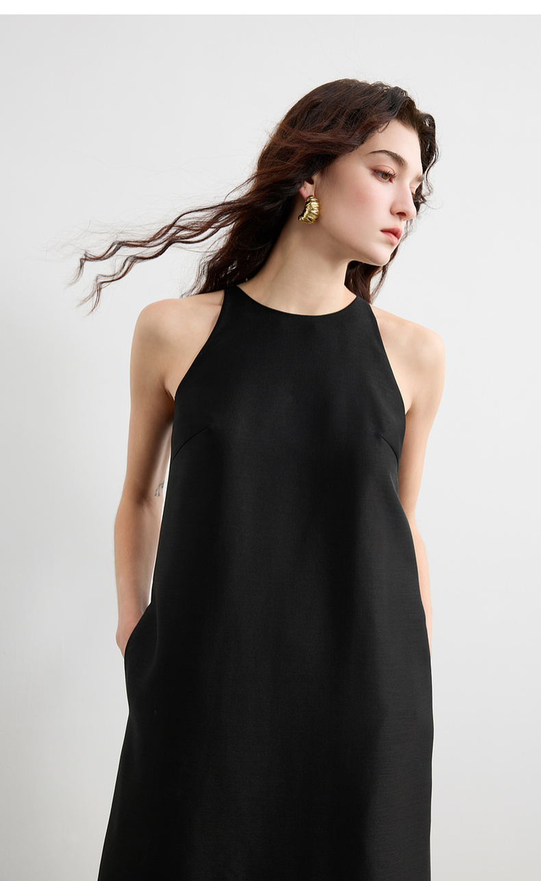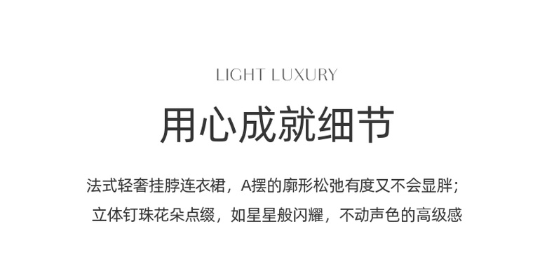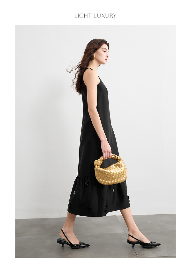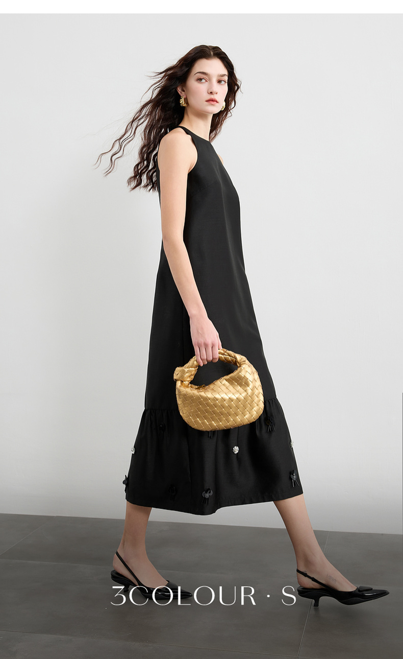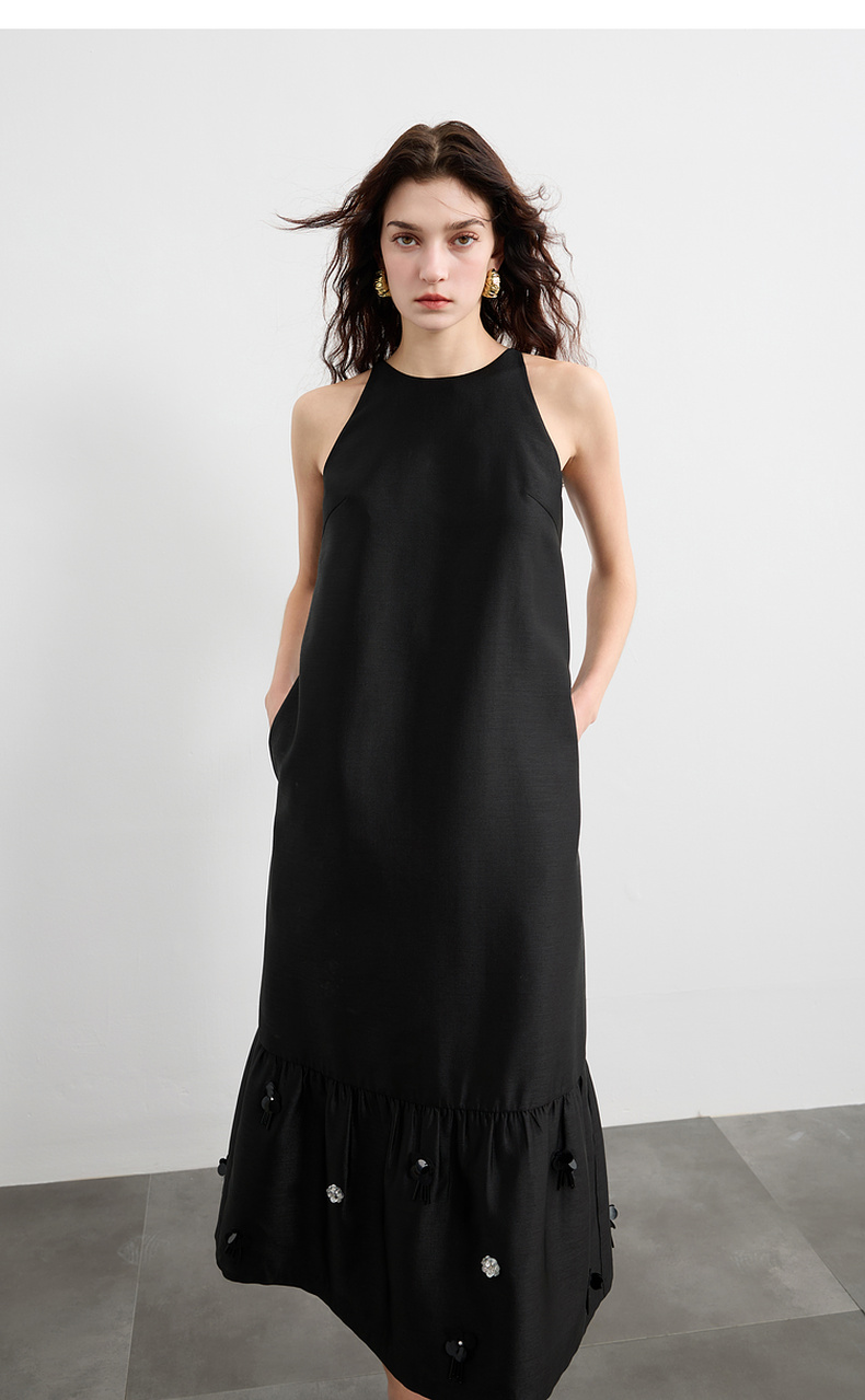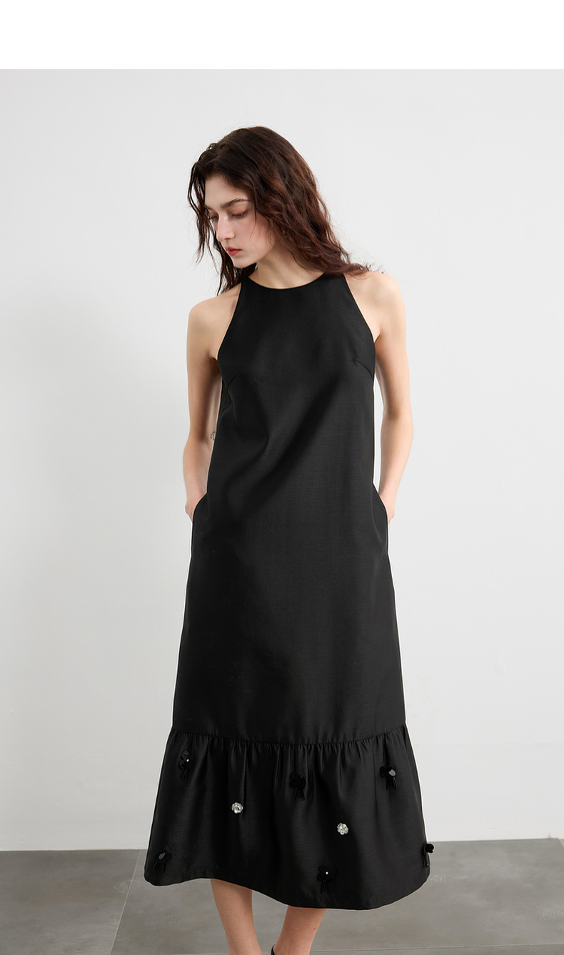 三彩2025春季新款法式轻奢无袖圆领挂脖连衣裙钉珠花朵长裙S