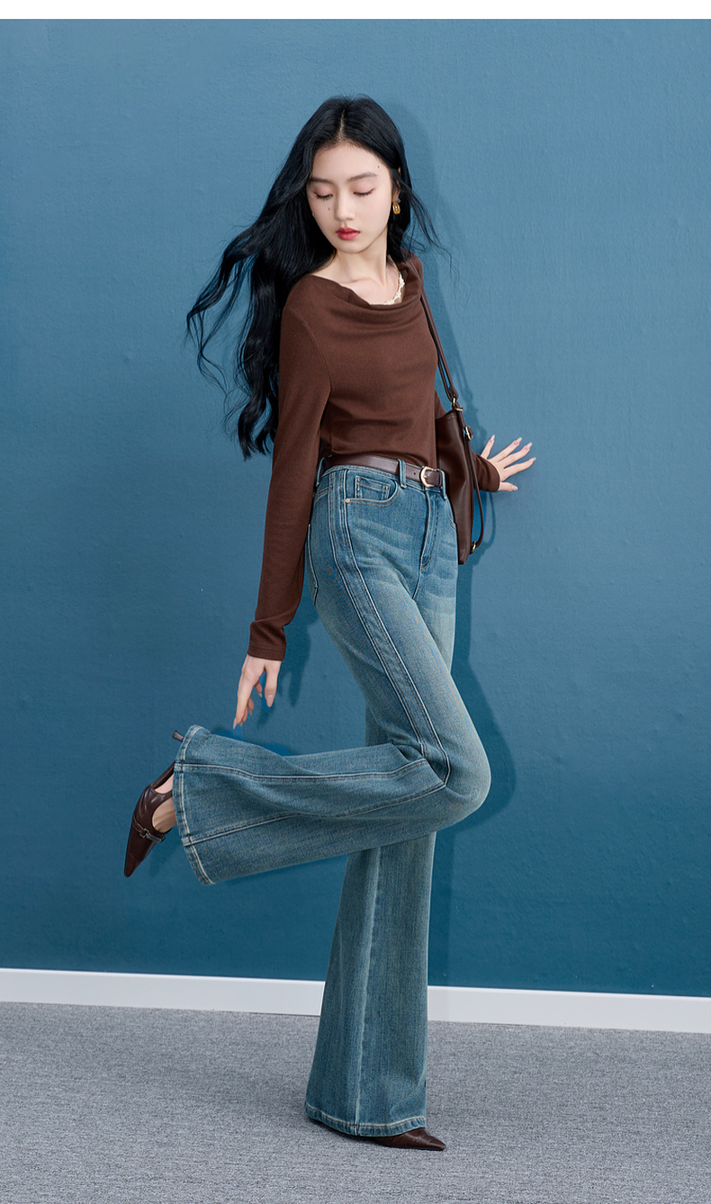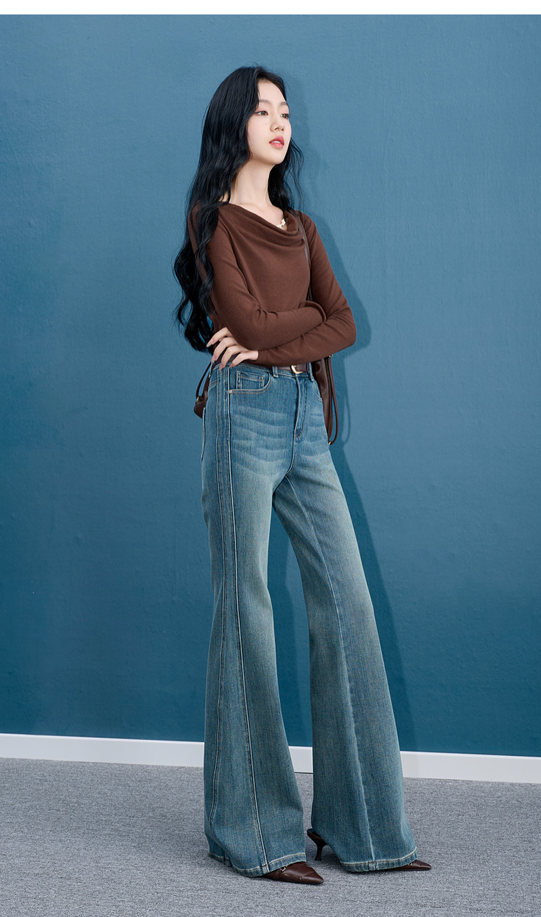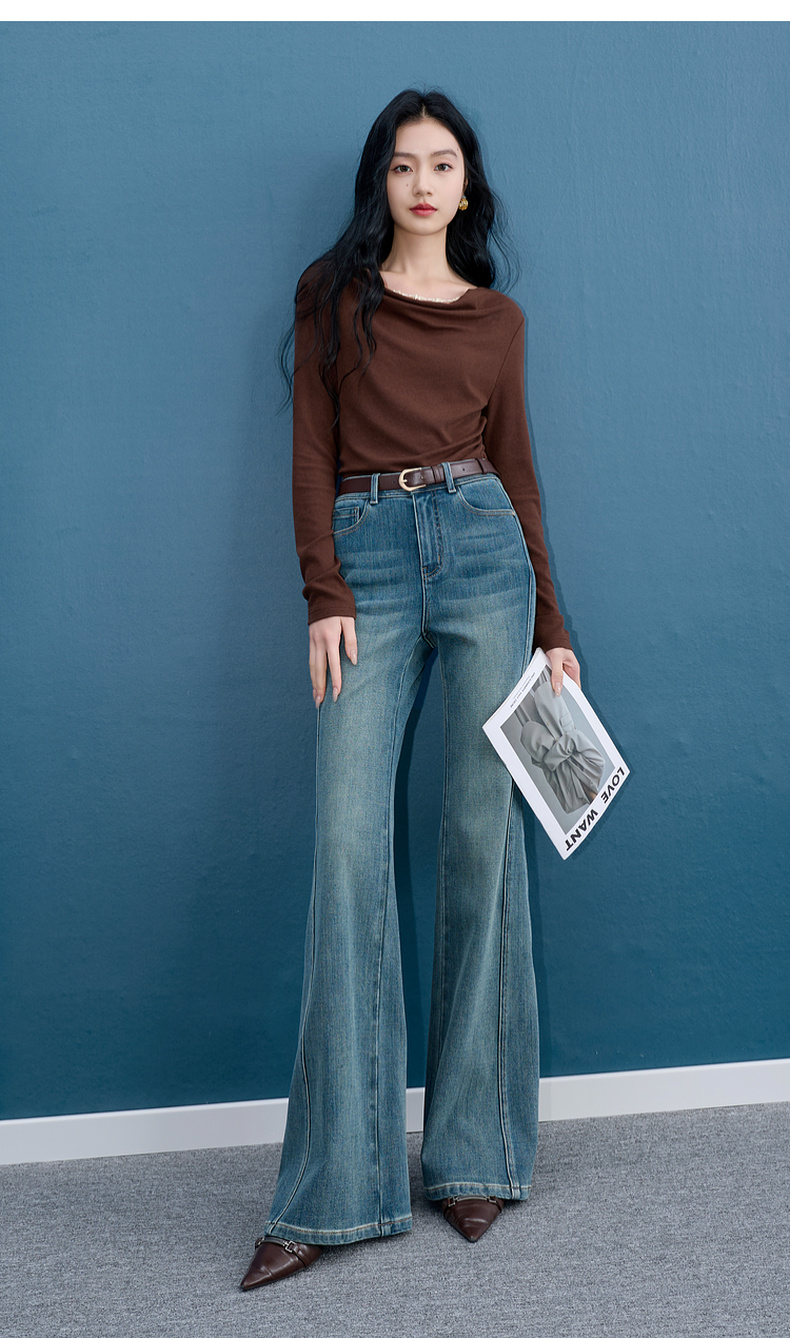 三彩2026春季新款高腰微喇牛仔裤水洗喇叭裤休闲长裤修身复古S