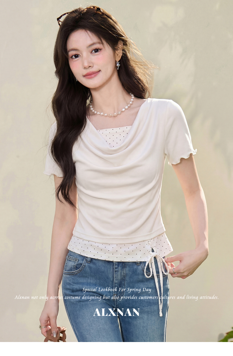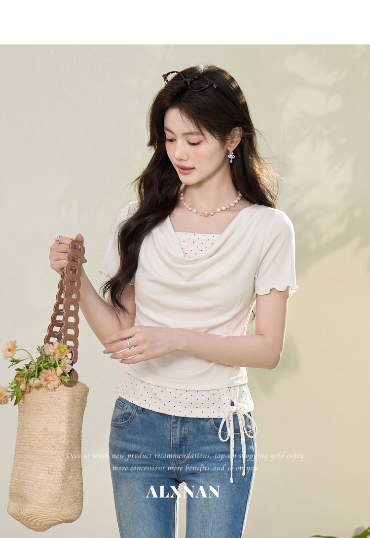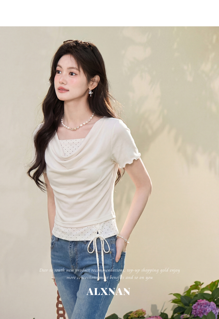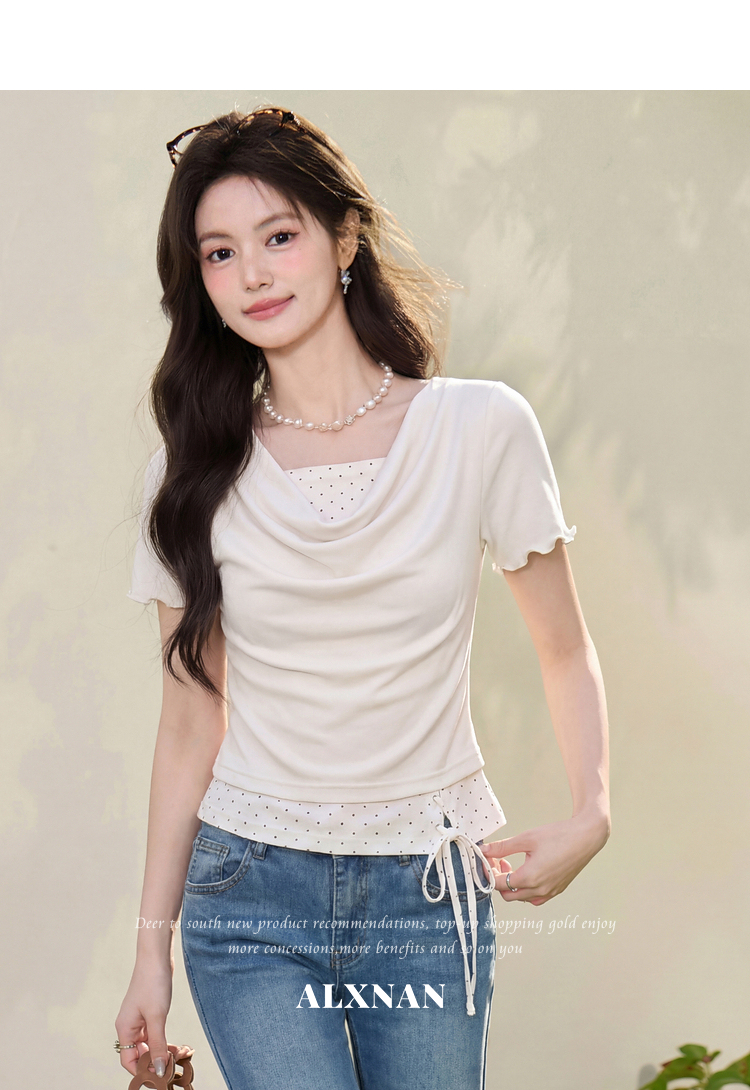 鹿向南「微风情书」杏色假两件短袖T恤女夏季新款减龄设计感上衣