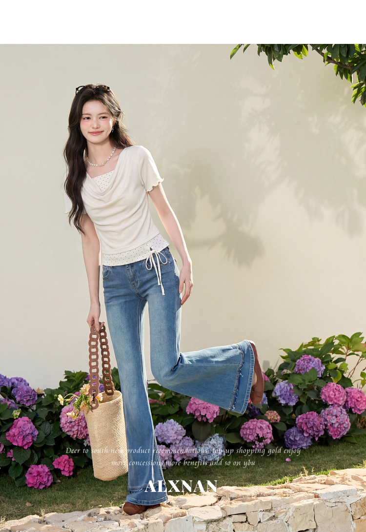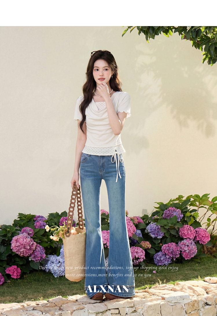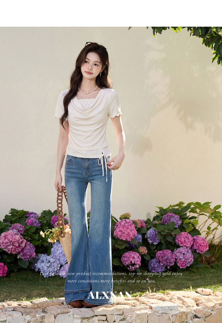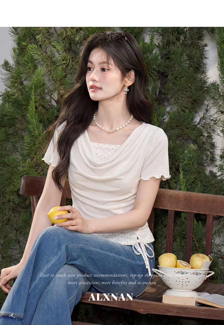 鹿向南「微风情书」杏色假两件短袖T恤女夏季新款减龄设计感上衣