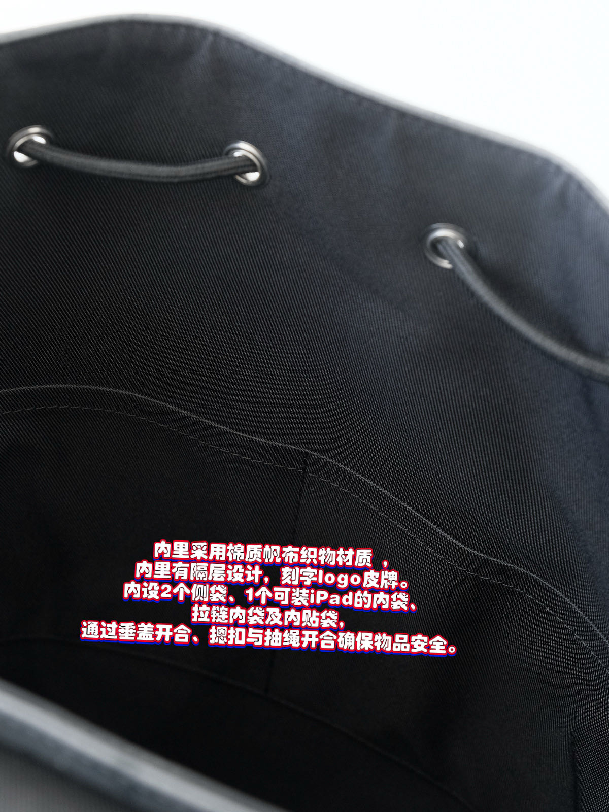 内里采用棉质帆布织物材质内里有隔层设计,刻字logo皮牌。内设2个侧袋、1个可装iPad的内袋、拉链内袋及内贴袋,通过垂盖开合、摁扣与抽绳开合确保物品安全。