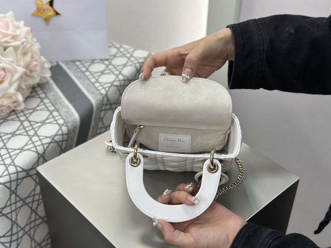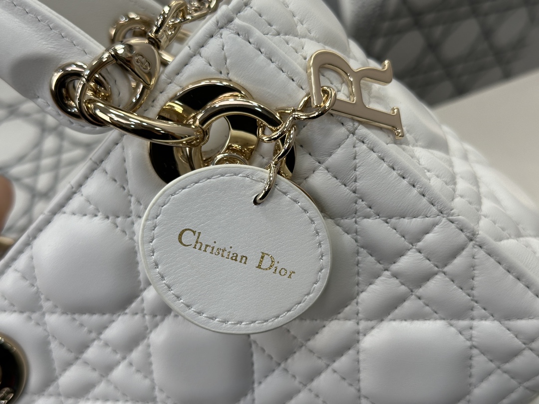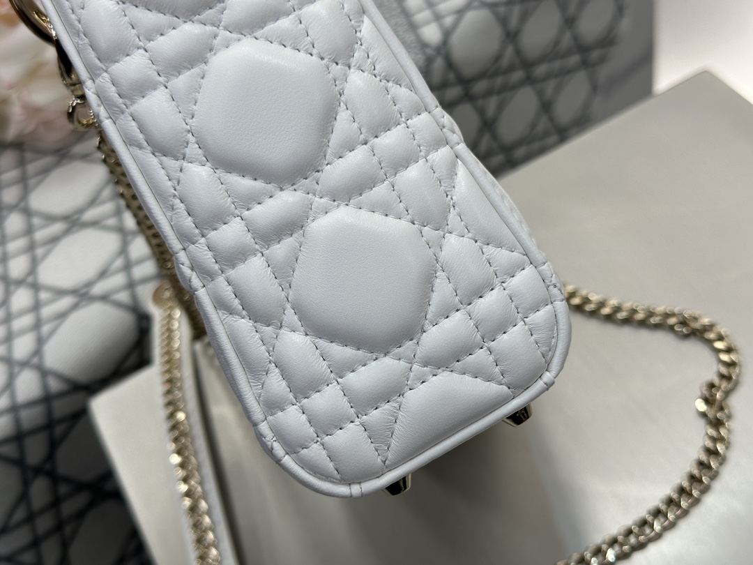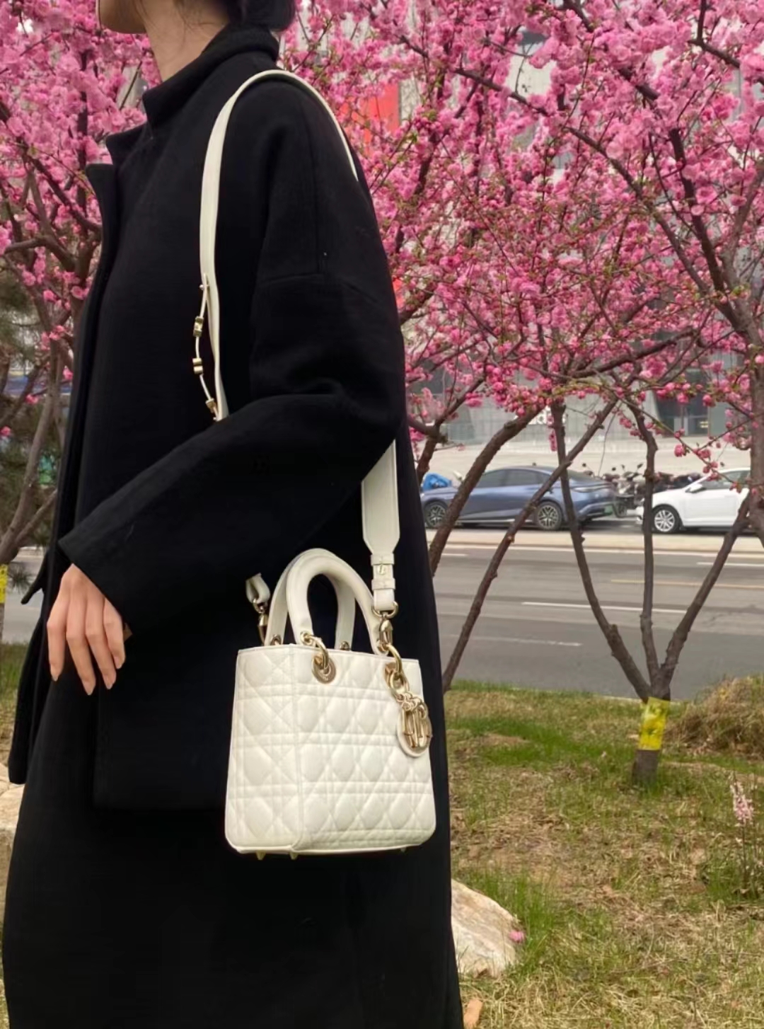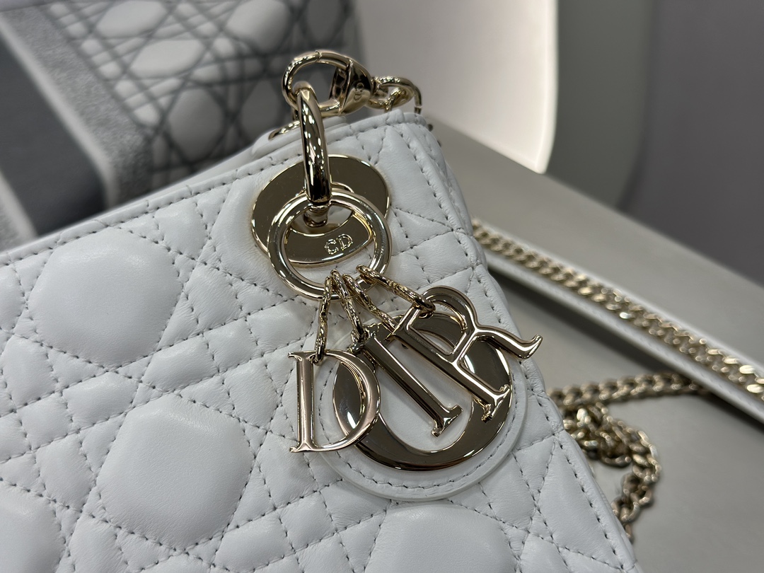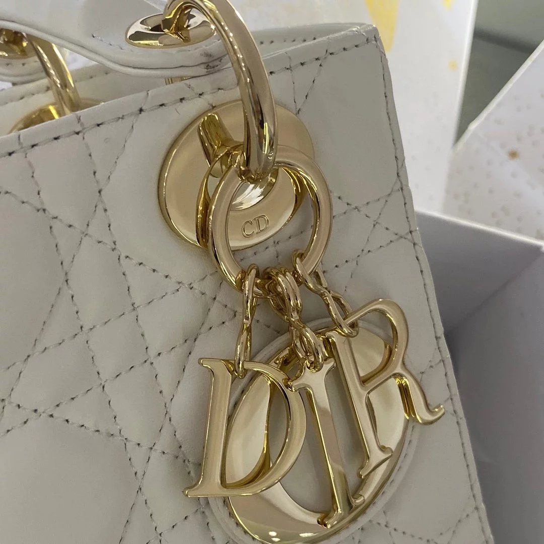 升级版Lady Dio.r My ABC20cm 这款手袋集中体现了Dio.r 对典雅和美丽的深刻洞见。采用小羊皮革精心制作,以标志性的藤格纹针脚打造绗缝细节,高雅经典的设计经久不衰。饰以同色调珐琅标志性“D.I.O.R.”吊饰,为精美的轮廓增添一分灵动。肩带多可添加六枚字母或符号徽章,满足个性化的需求。 宽肩带可搭配 6 枚徽章装饰 ,可打造个性造型。 内部拉链口袋和贴袋 可手提、肩背或斜挎 尺寸:20 厘米 x 16.5 厘米 x 8 厘米。配全套包装
