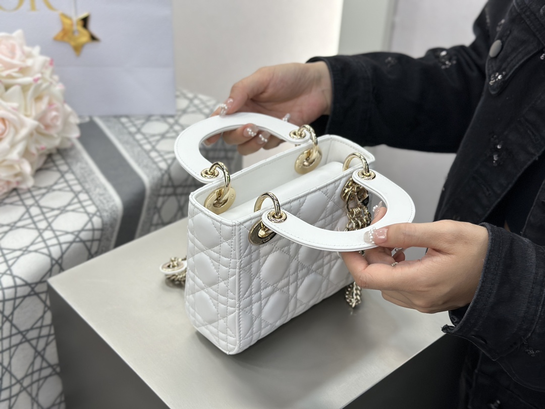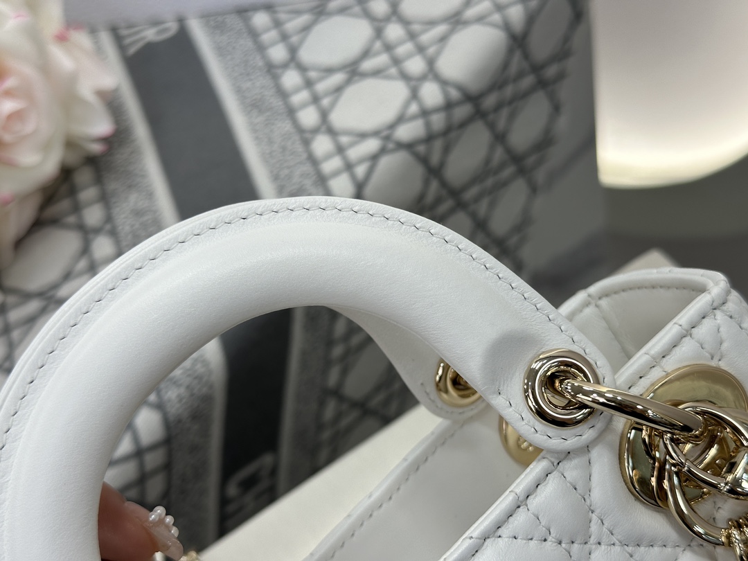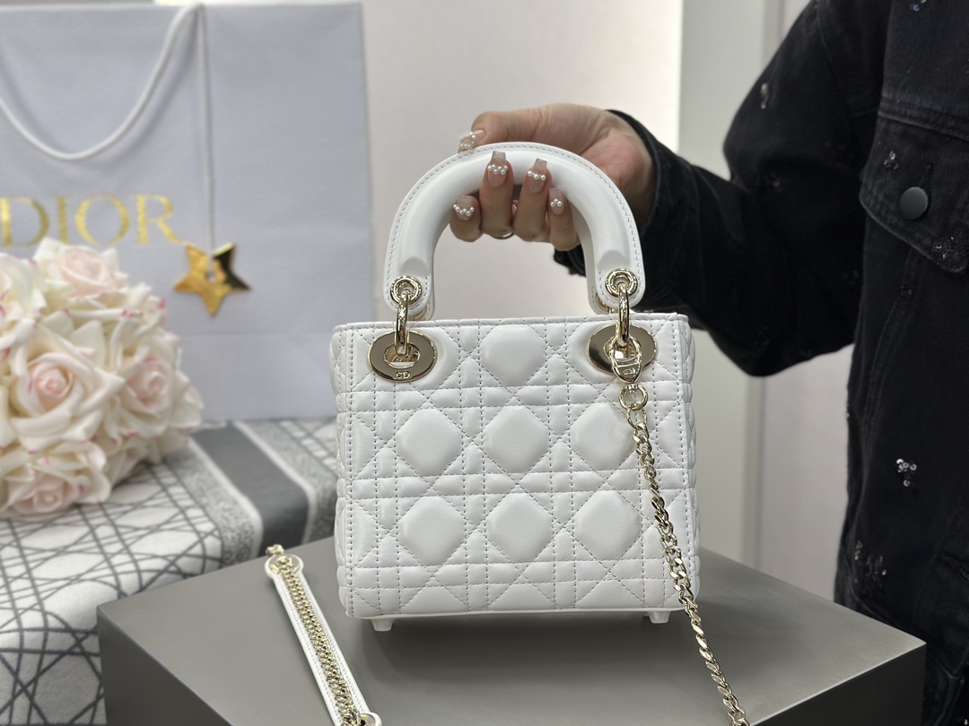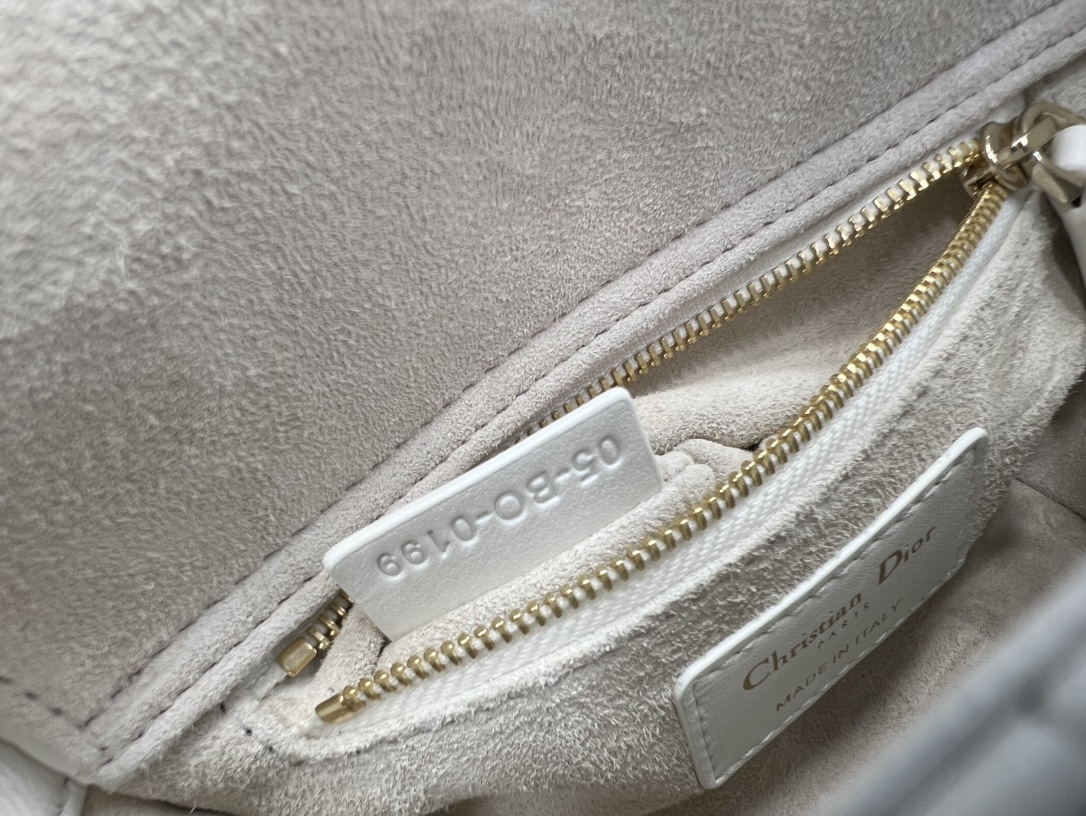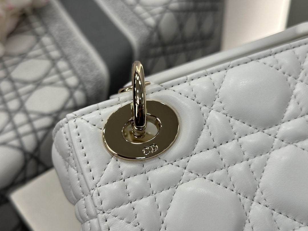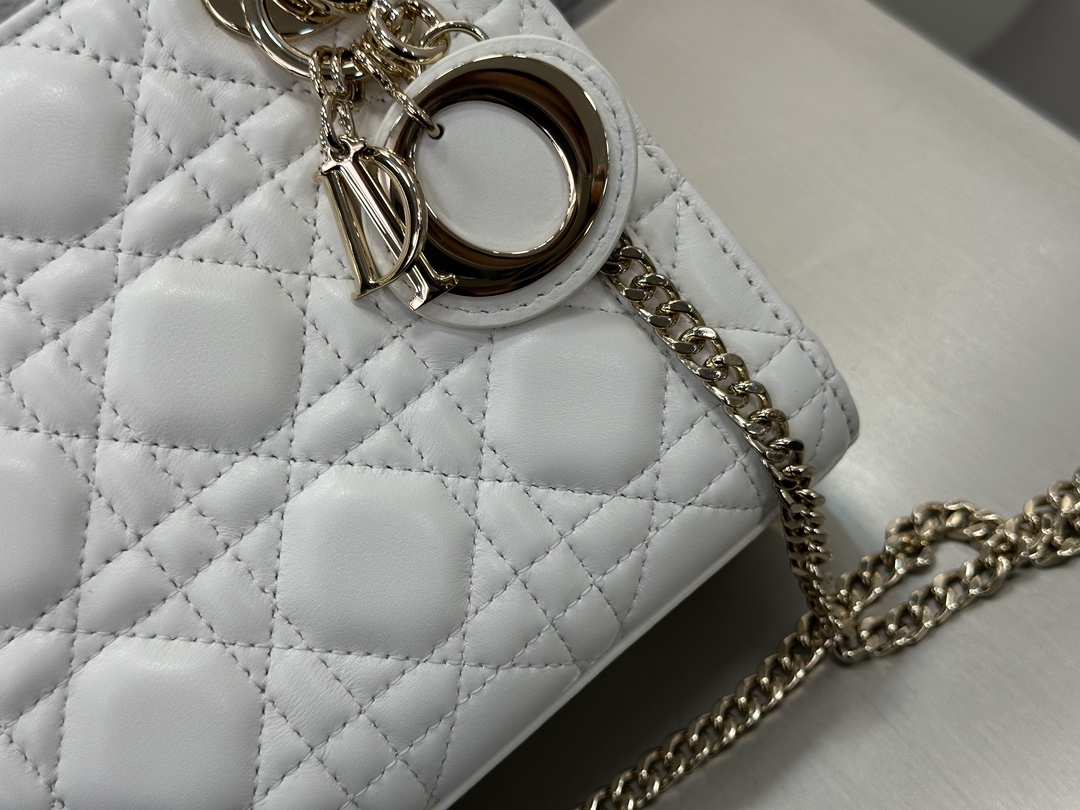 升级版Lady Dio.r My ABC20cm 这款手袋集中体现了Dio.r 对典雅和美丽的深刻洞见。采用小羊皮革精心制作,以标志性的藤格纹针脚打造绗缝细节,高雅经典的设计经久不衰。饰以同色调珐琅标志性“D.I.O.R.”吊饰,为精美的轮廓增添一分灵动。肩带多可添加六枚字母或符号徽章,满足个性化的需求。 宽肩带可搭配 6 枚徽章装饰 ,可打造个性造型。 内部拉链口袋和贴袋 可手提、肩背或斜挎 尺寸:20 厘米 x 16.5 厘米 x 8 厘米。配全套包装
