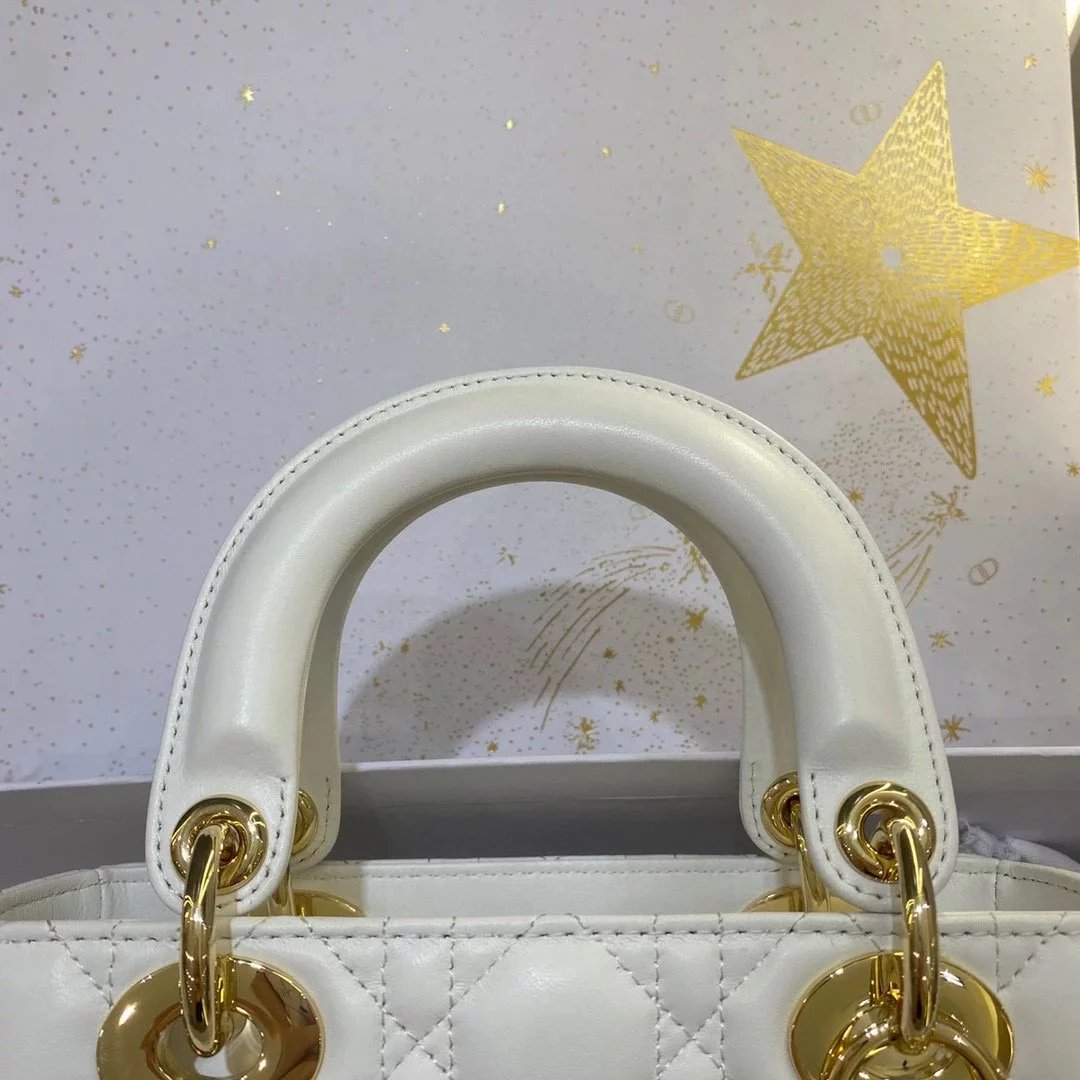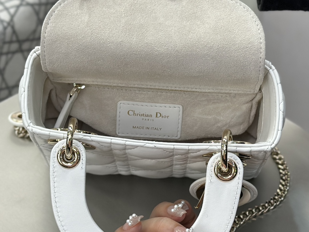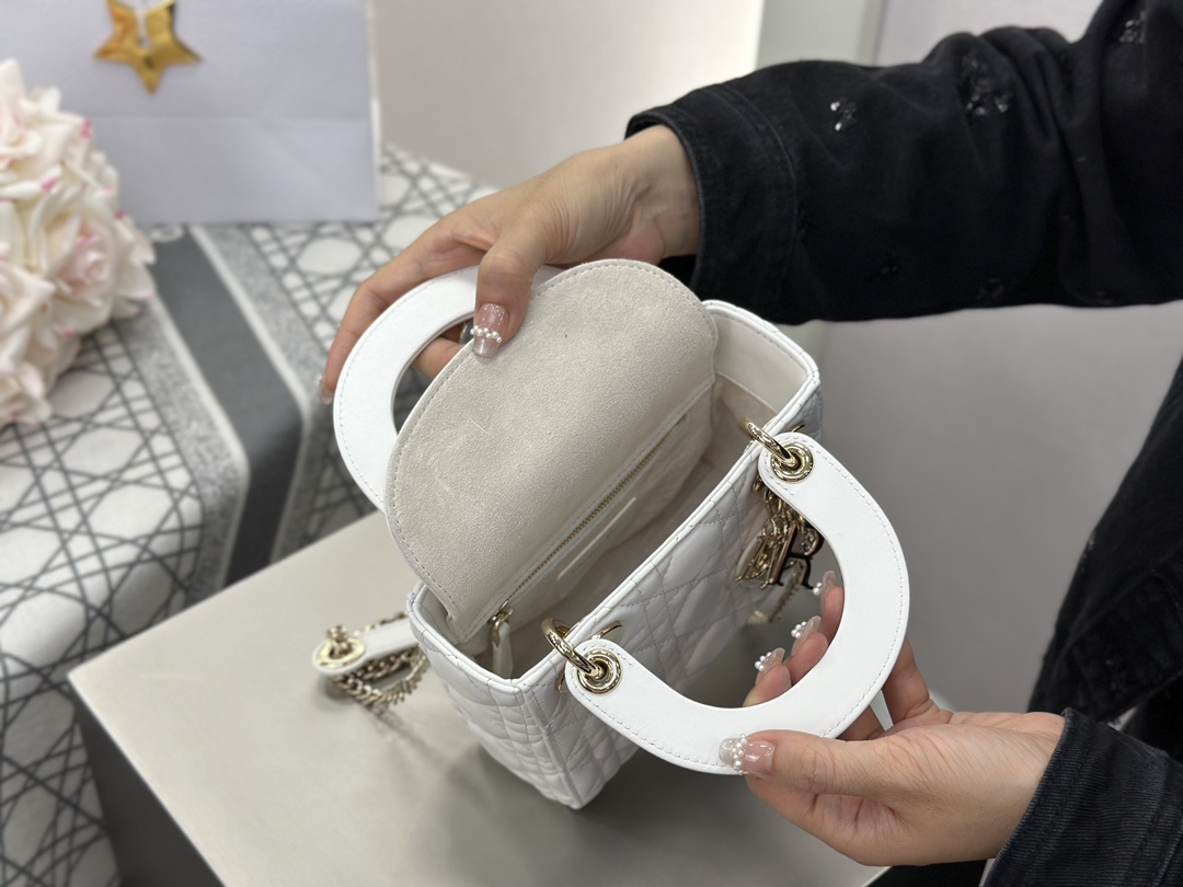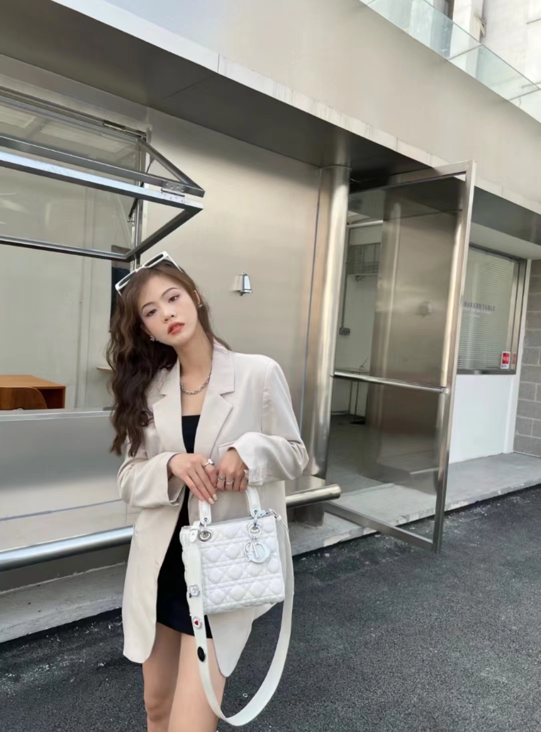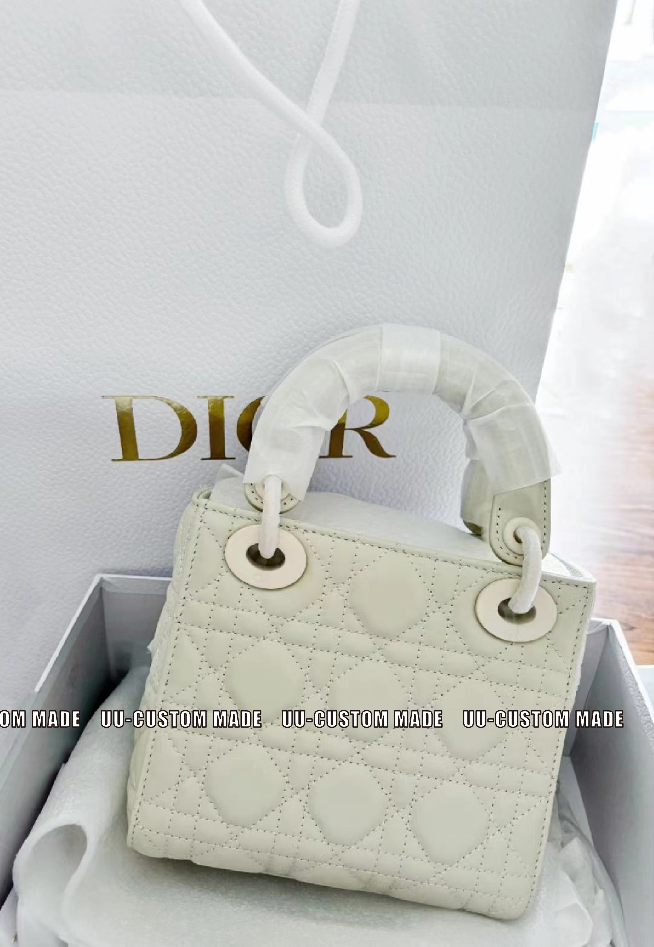 升级版Lady Dio.r My ABC20cm 这款手袋集中体现了Dio.r 对典雅和美丽的深刻洞见。采用小羊皮革精心制作,以标志性的藤格纹针脚打造绗缝细节,高雅经典的设计经久不衰。饰以同色调珐琅标志性“D.I.O.R.”吊饰,为精美的轮廓增添一分灵动。肩带多可添加六枚字母或符号徽章,满足个性化的需求。 宽肩带可搭配 6 枚徽章装饰 ,可打造个性造型。 内部拉链口袋和贴袋 可手提、肩背或斜挎 尺寸:20 厘米 x 16.5 厘米 x 8 厘米。配全套包装