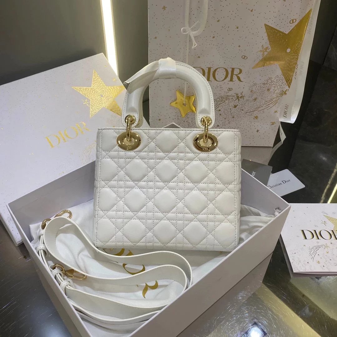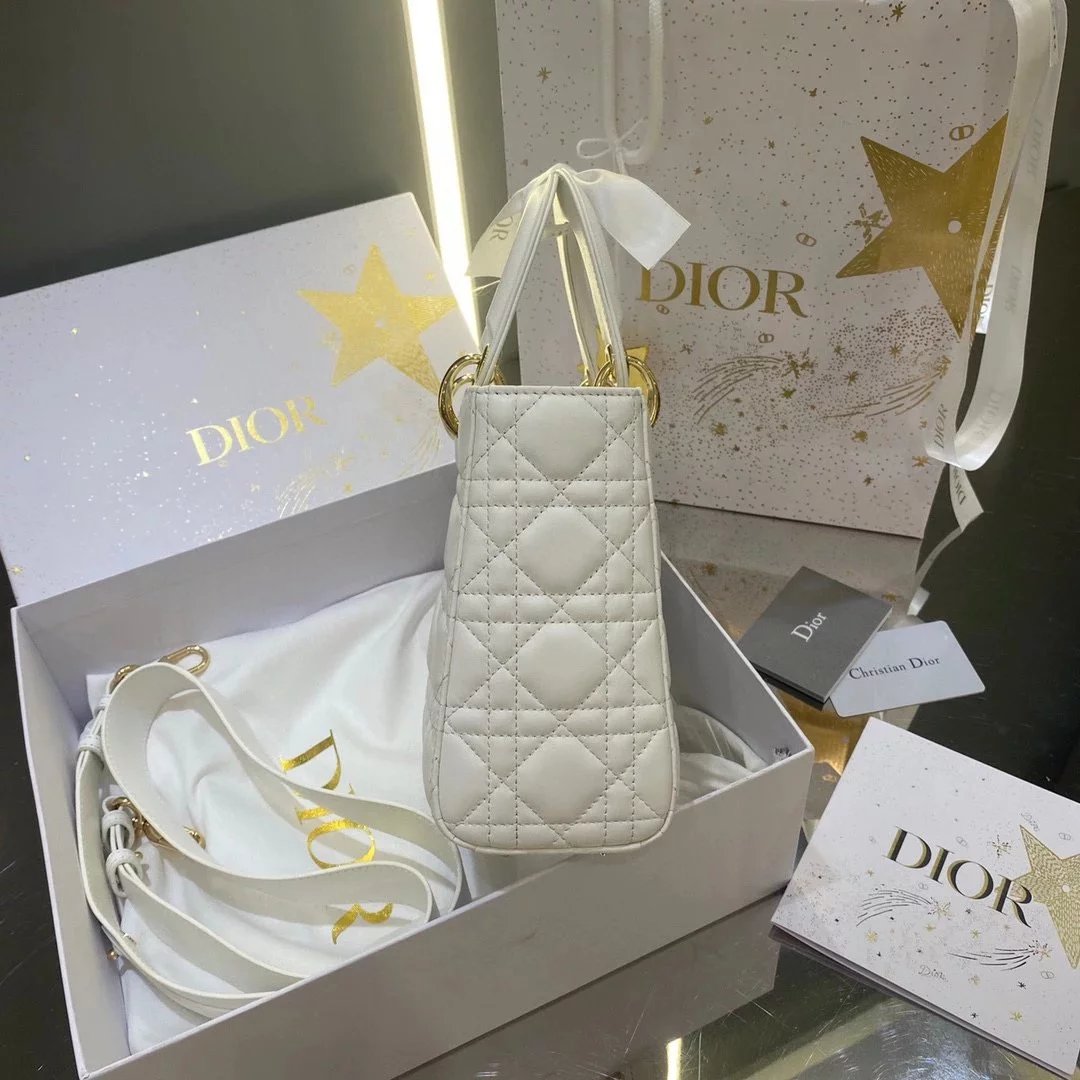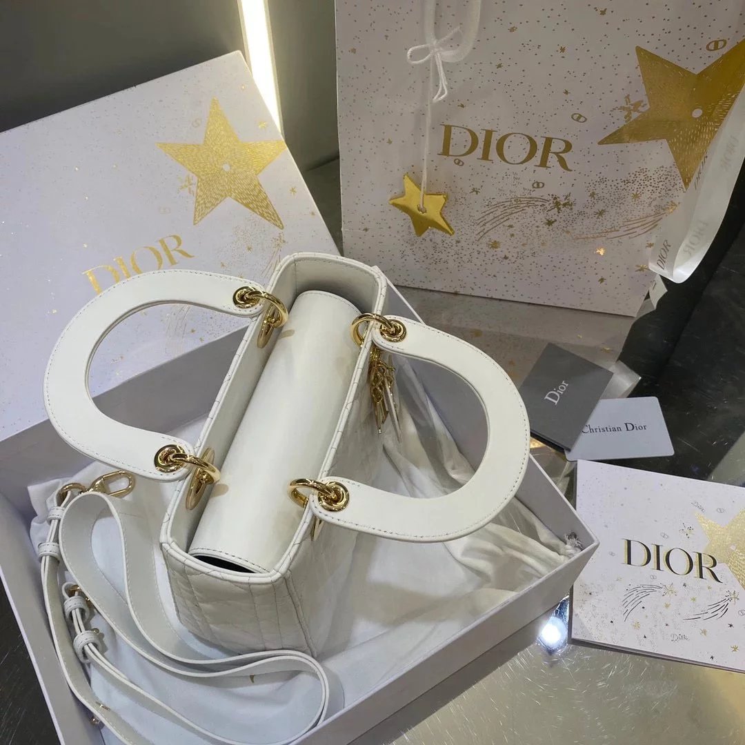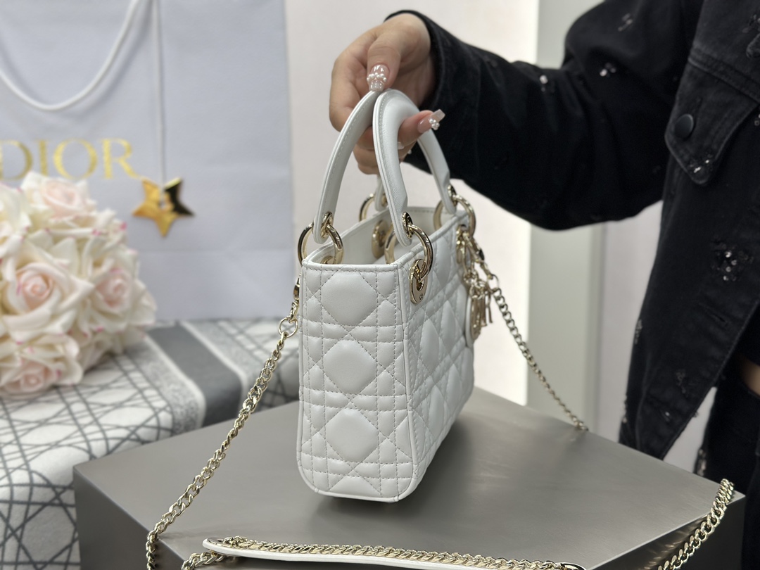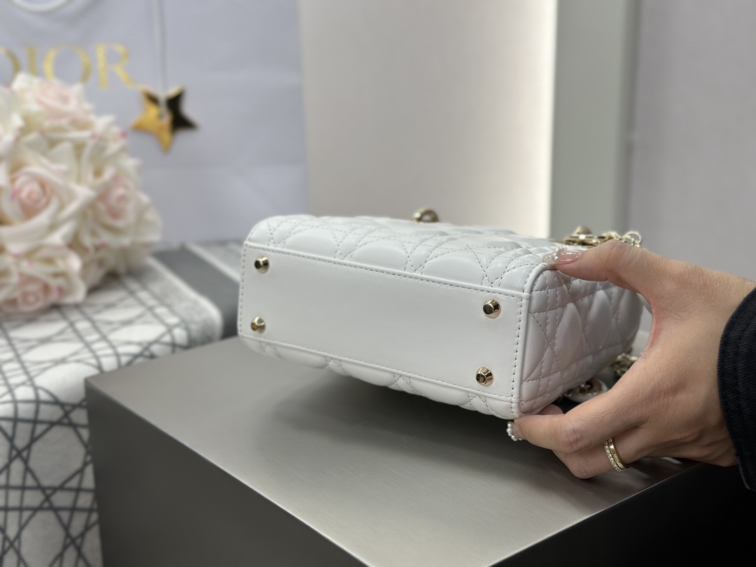 升级版Lady Dio.r My ABC20cm 这款手袋集中体现了Dio.r 对典雅和美丽的深刻洞见。采用小羊皮革精心制作,以标志性的藤格纹针脚打造绗缝细节,高雅经典的设计经久不衰。饰以同色调珐琅标志性“D.I.O.R.”吊饰,为精美的轮廓增添一分灵动。肩带多可添加六枚字母或符号徽章,满足个性化的需求。 宽肩带可搭配 6 枚徽章装饰 ,可打造个性造型。 内部拉链口袋和贴袋 可手提、肩背或斜挎 尺寸:20 厘米 x 16.5 厘米 x 8 厘米。配全套包装