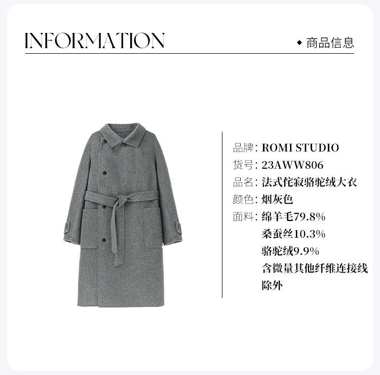 ROMI STUDIO“法式侘寂”骆驼绒绵羊毛蚕丝混纺廓形呢大衣23AWW806