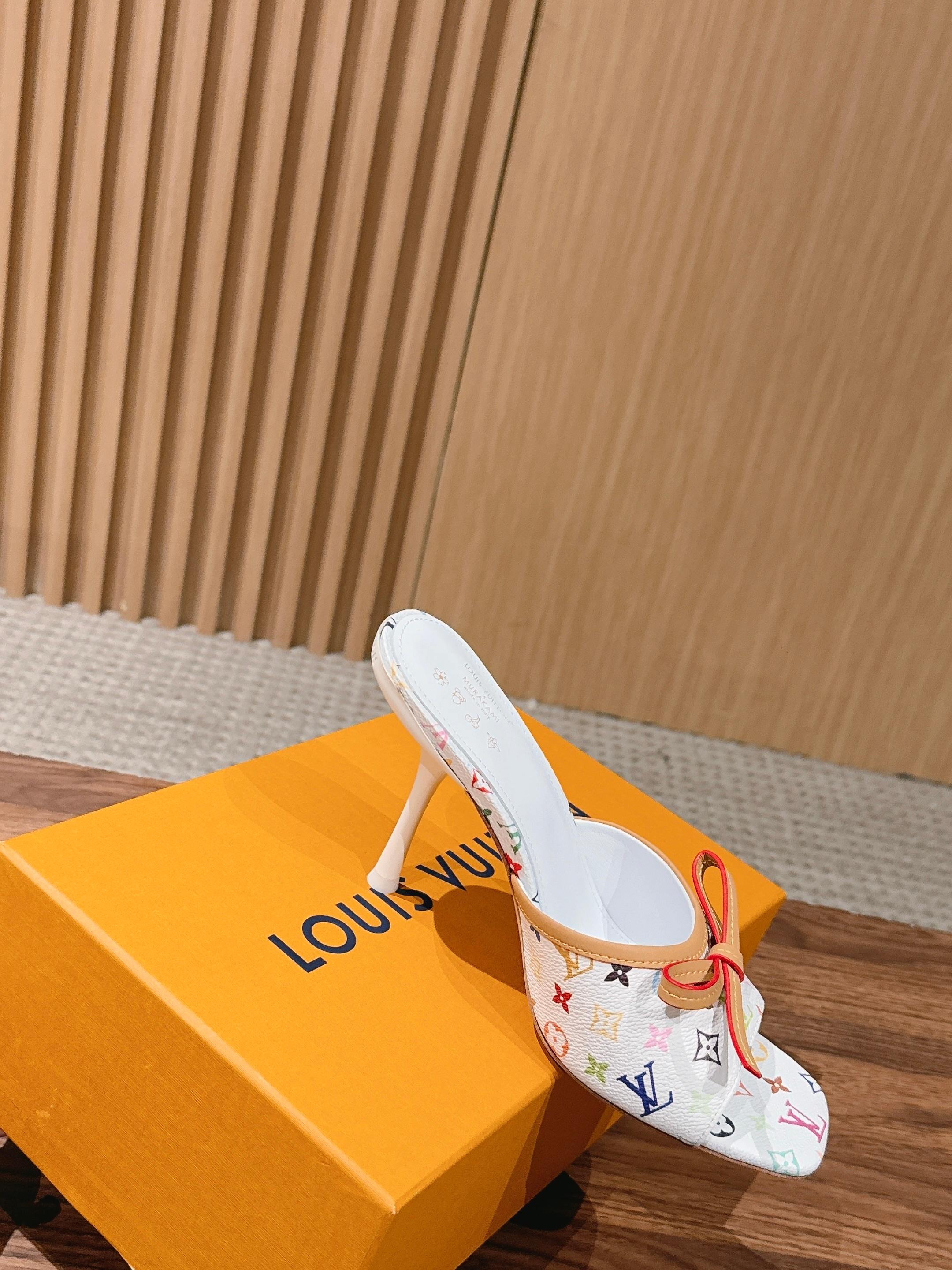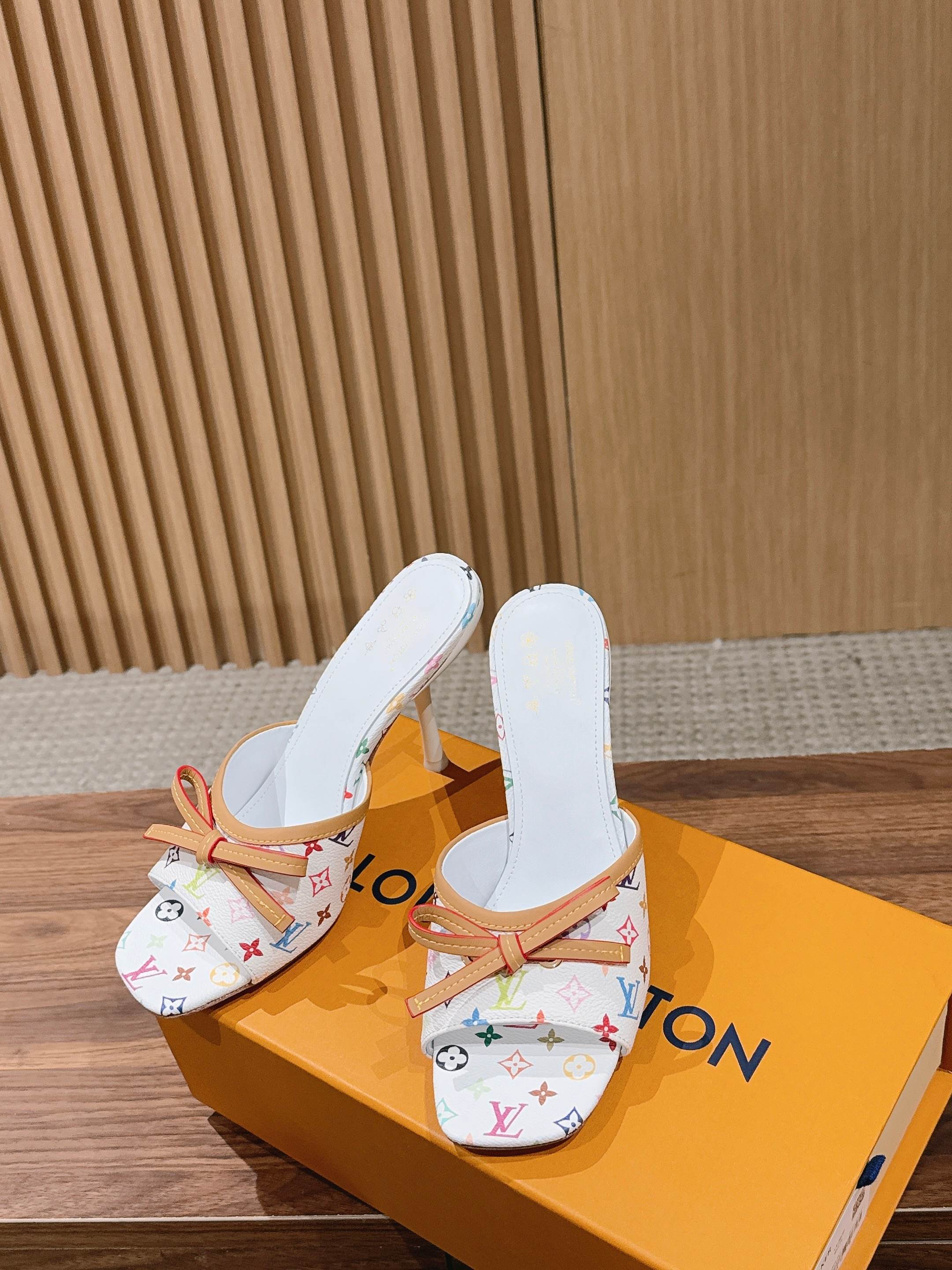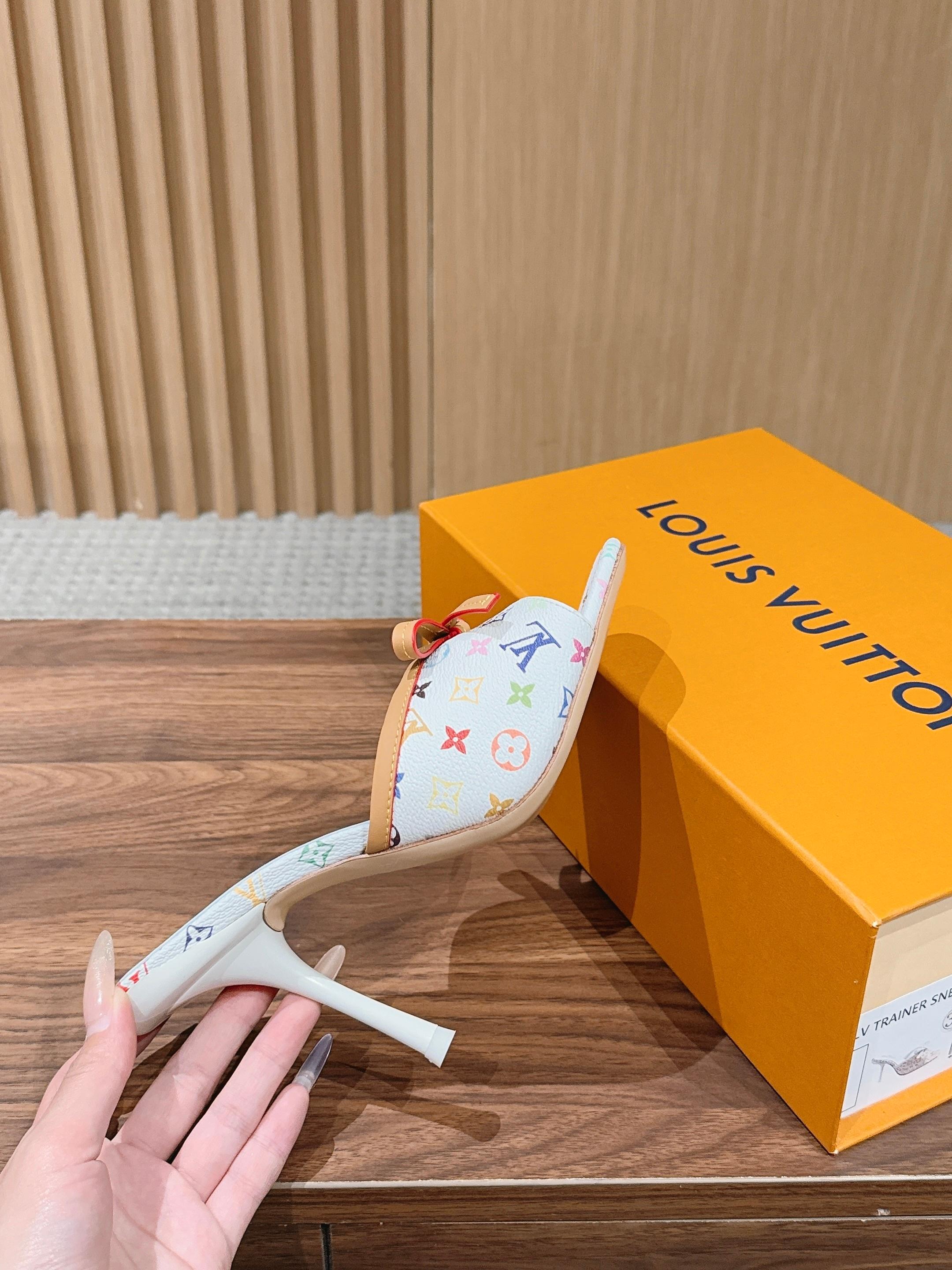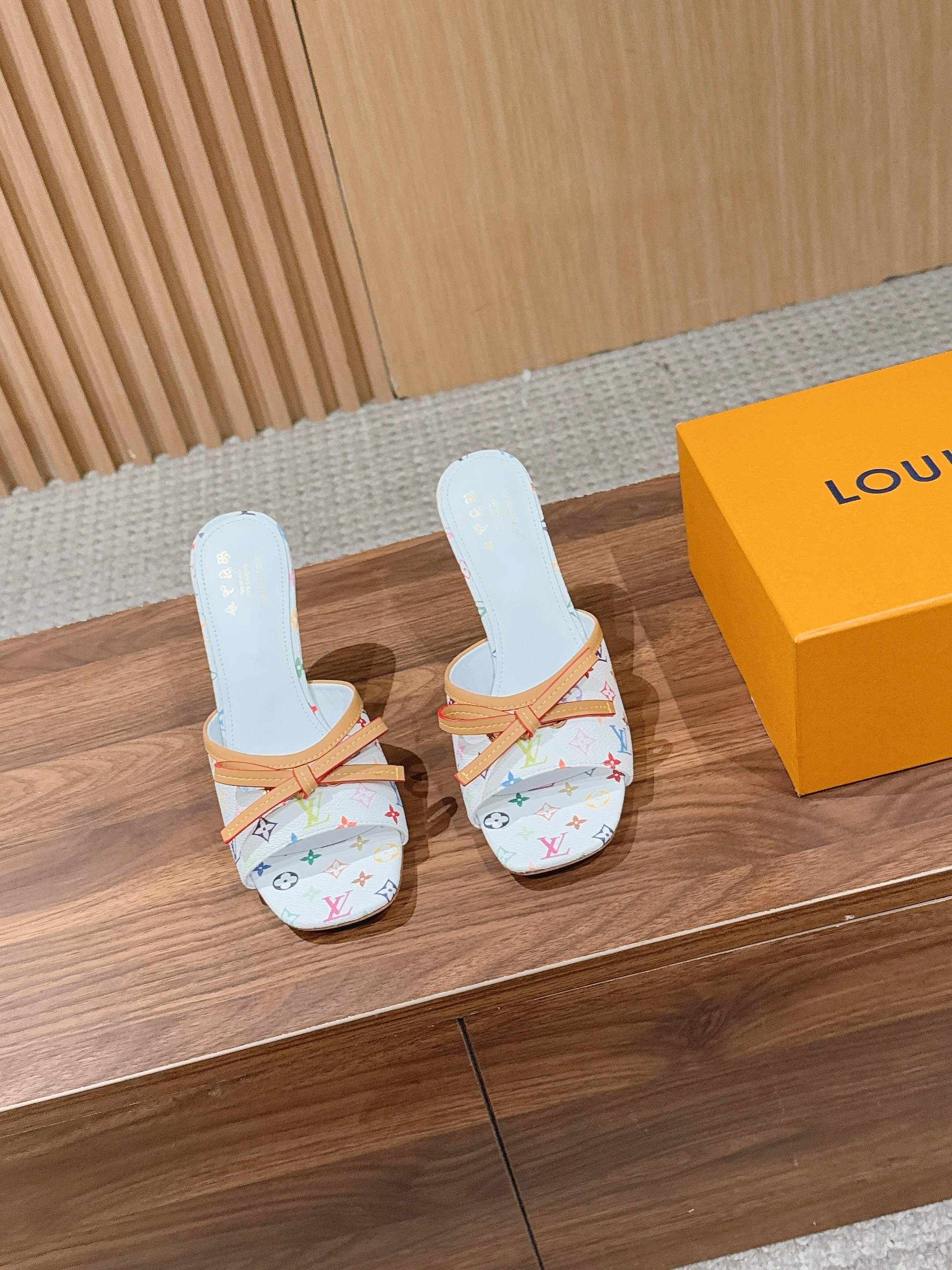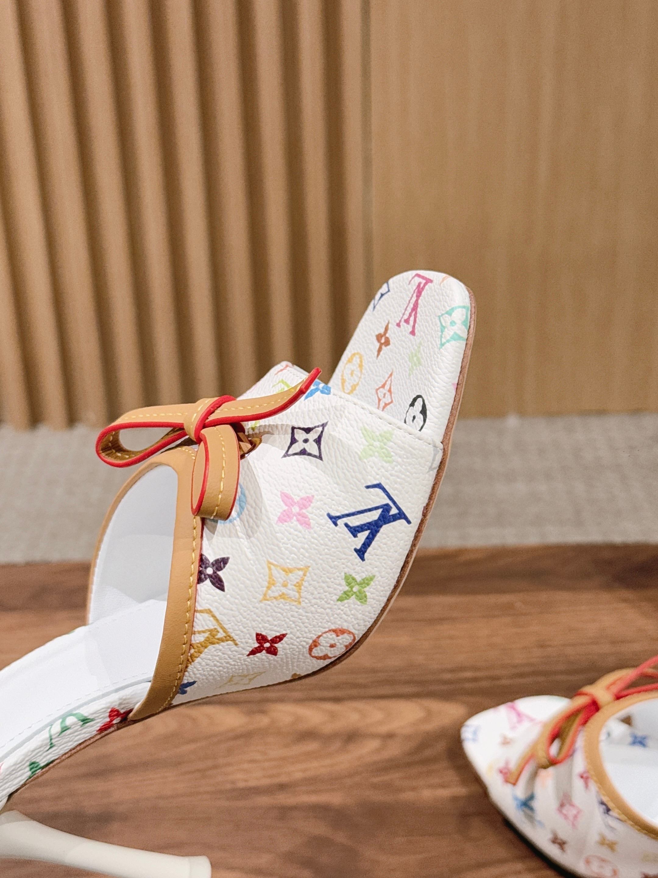Louis Vuitton LV X TM 凉拖三彩系列小猫跟蝴蝶结凉拖鞋 小红书爆款小猫跟经典老花蝴蝶结拖鞋 路易威登×村上隆白彩联名全幅Monogram图案浸染彩虹色调,娓娓道出日本艺术家村上隆的标志性笔触。便鞋构型融入优雅小猫跟,饰钉牛皮革带再添摩登风范。 🔸面料:定制老花皮 🔸内里垫脚:羊皮 🔸鞋底:意大利真皮大底 🔸跟高:5.5cm 9.5cm 🔸码数:35-39(40.41定做不退换)