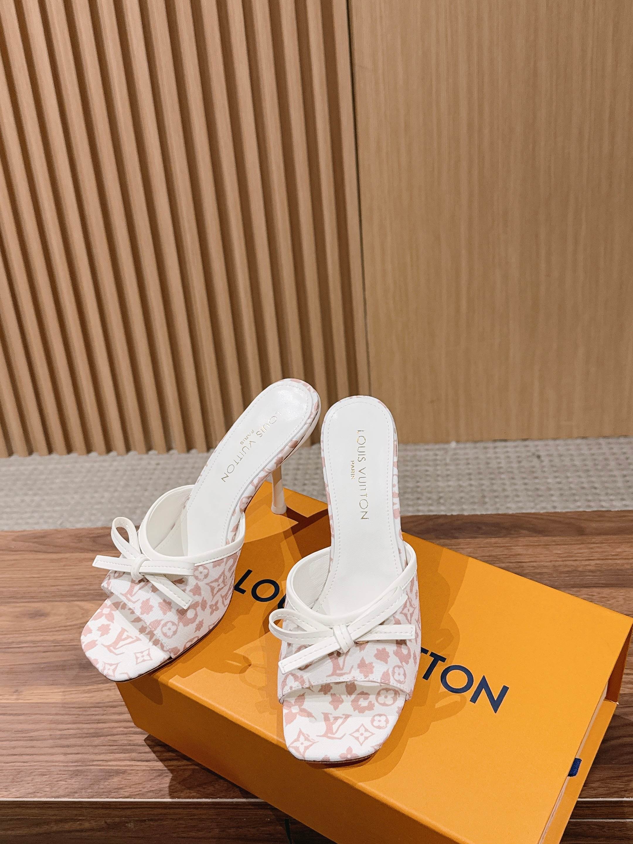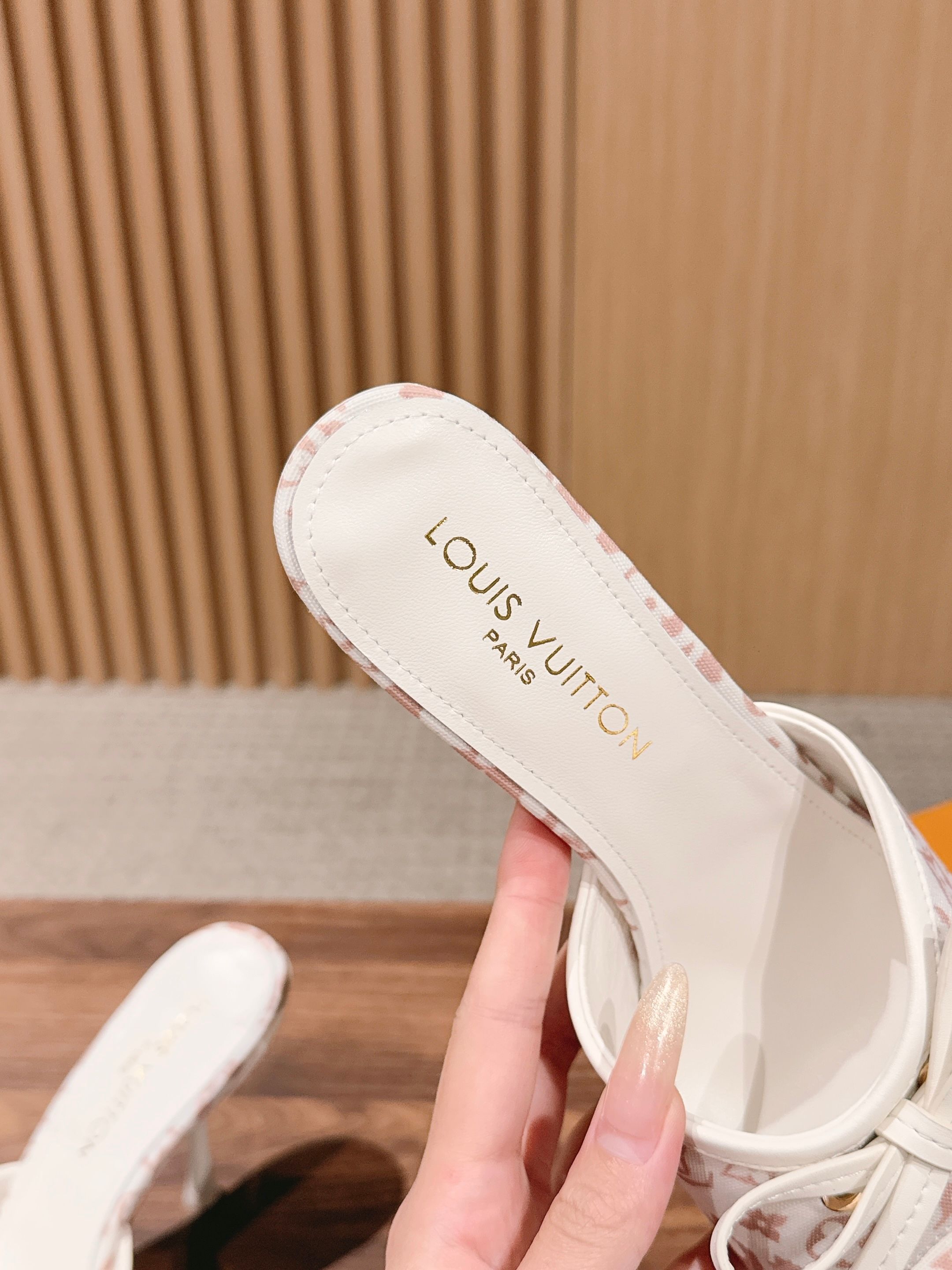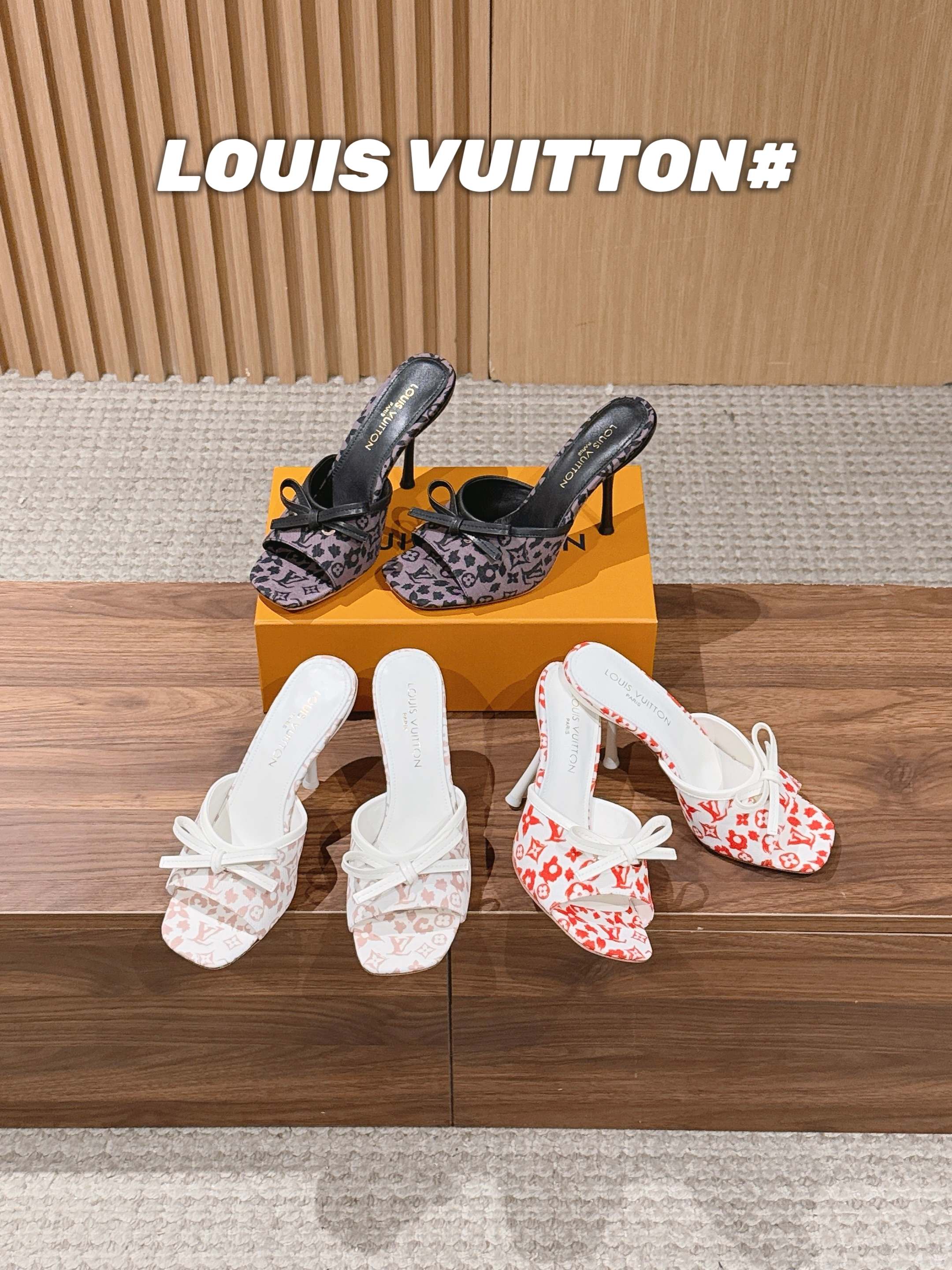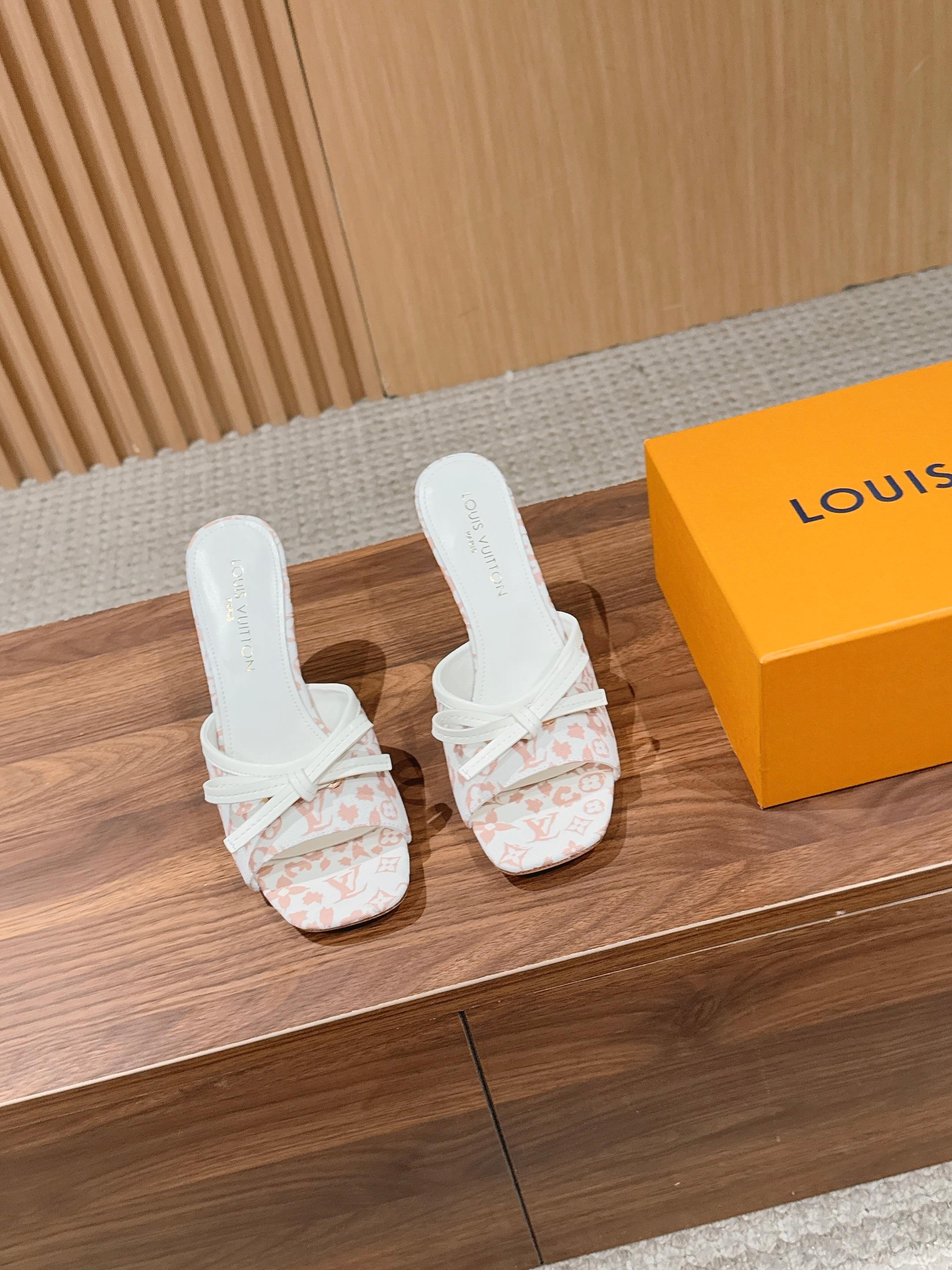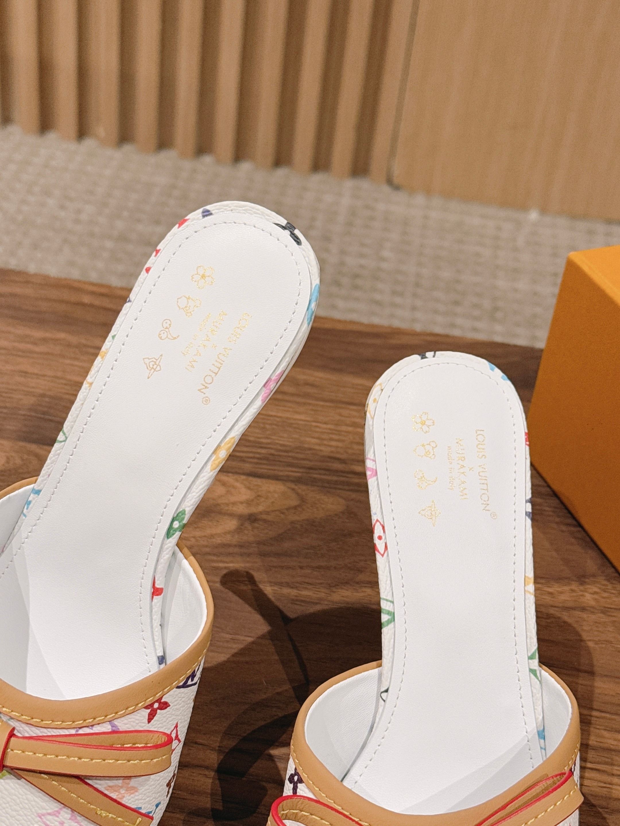 Louis Vuitton LV X TM 凉拖三彩系列小猫跟蝴蝶结凉拖鞋 小红书爆款小猫跟经典老花蝴蝶结拖鞋 路易威登×村上隆白彩联名全幅Monogram图案浸染彩虹色调,娓娓道出日本艺术家村上隆的标志性笔触。便鞋构型融入优雅小猫跟,饰钉牛皮革带再添摩登风范。 🔸面料:定制老花皮 🔸内里垫脚:羊皮 🔸鞋底:意大利真皮大底 🔸跟高:5.5cm 9.5cm 🔸码数:35-39(40.41定做不退换)