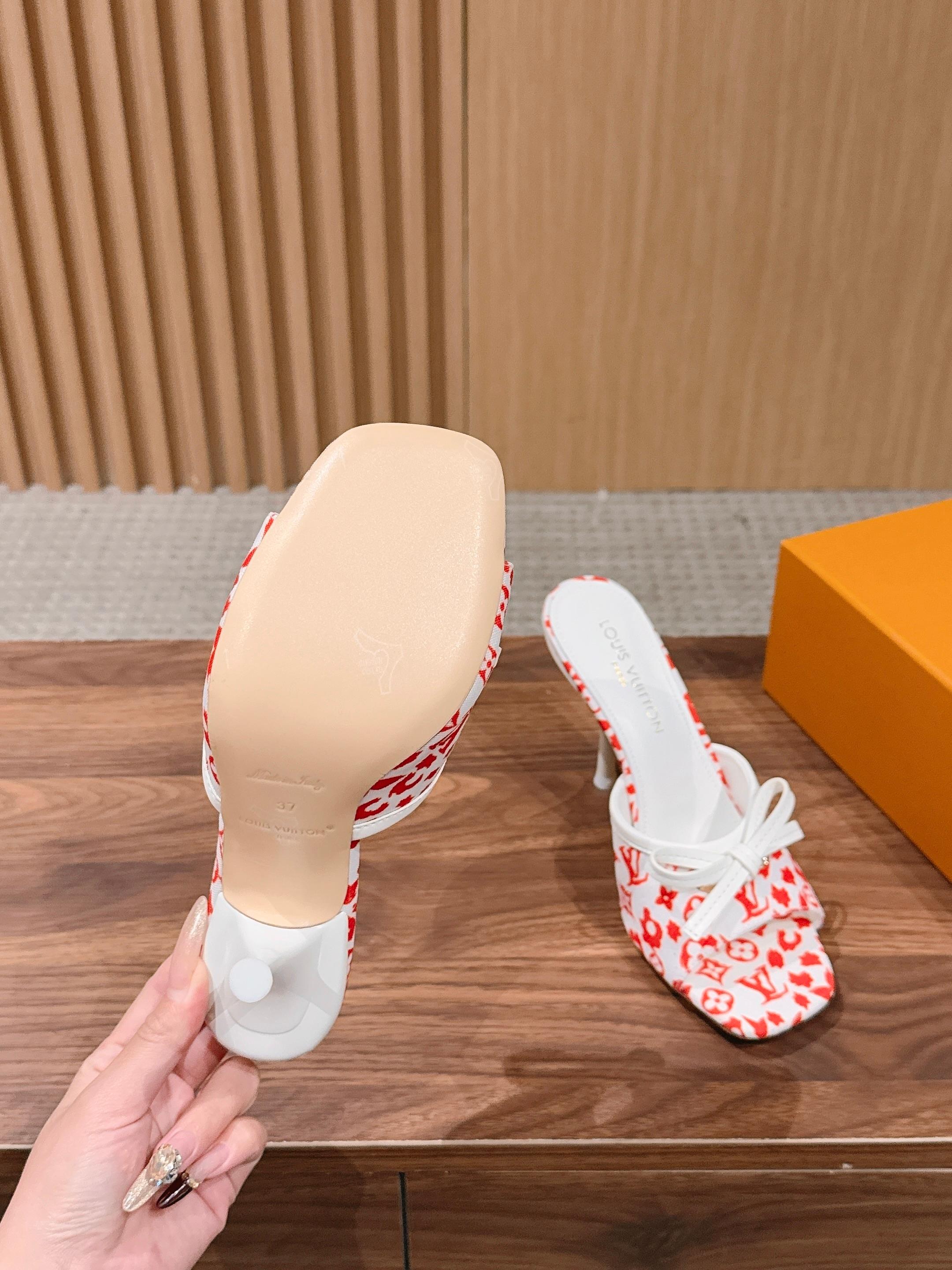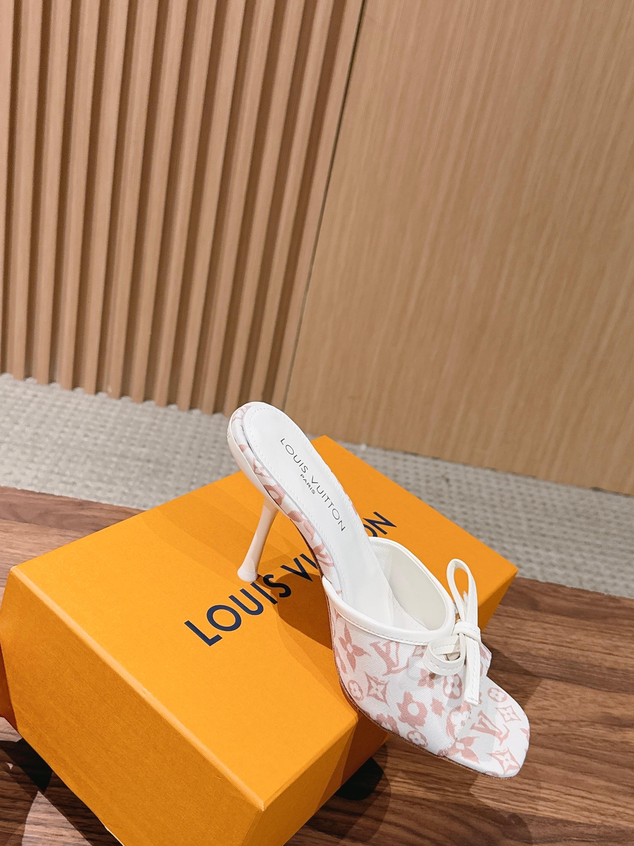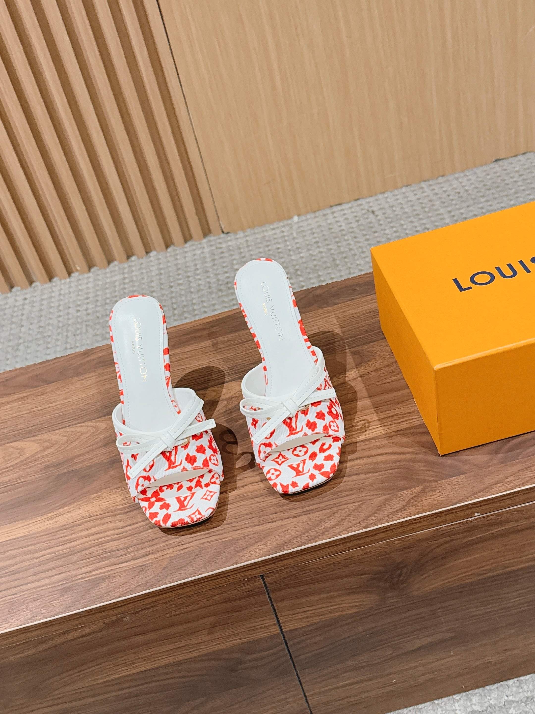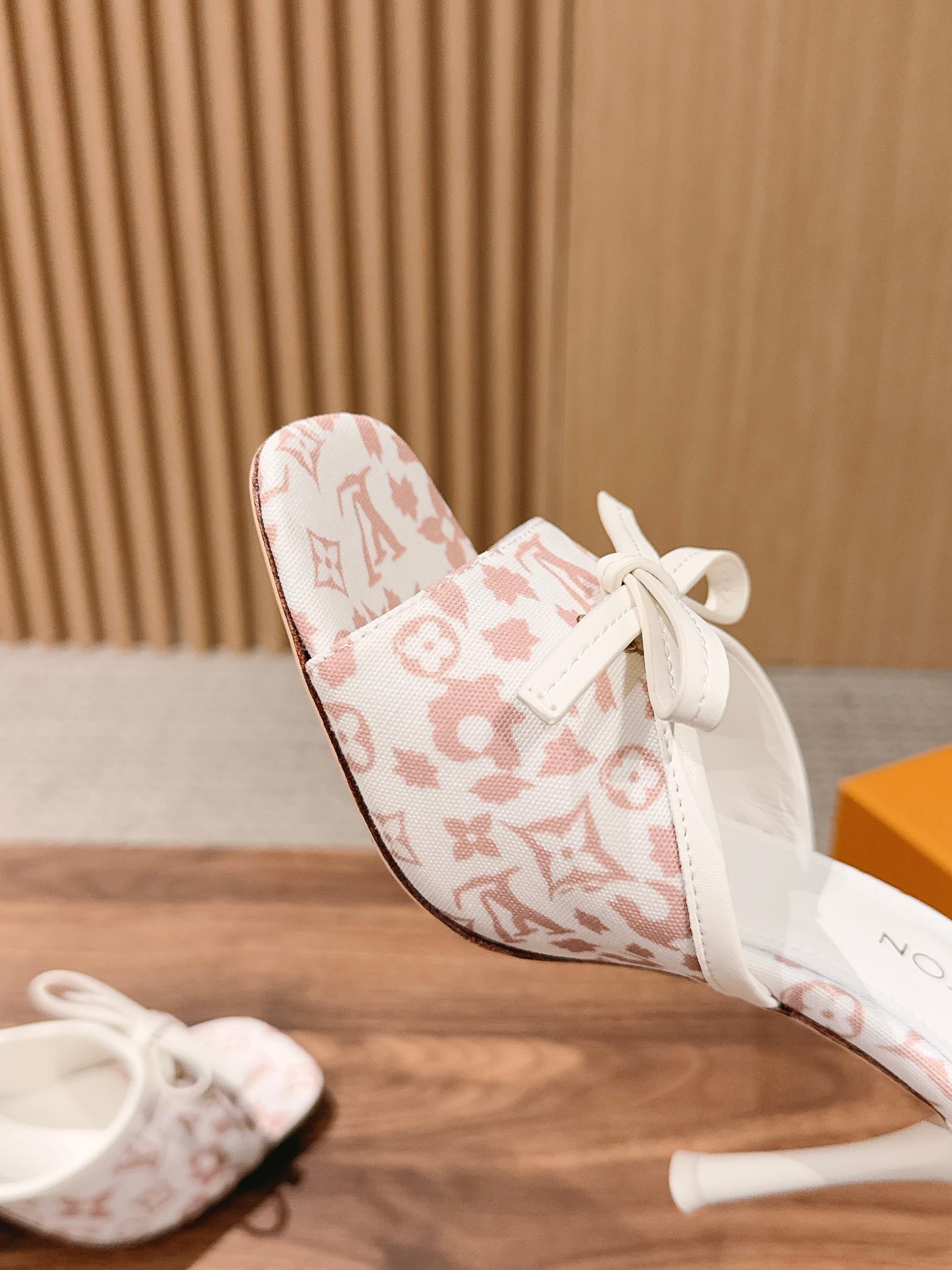 Louis Vuitton LV X TM 凉拖三彩系列小猫跟蝴蝶结凉拖鞋 小红书爆款小猫跟经典老花蝴蝶结拖鞋 路易威登×村上隆白彩联名全幅Monogram图案浸染彩虹色调,娓娓道出日本艺术家村上隆的标志性笔触。便鞋构型融入优雅小猫跟,饰钉牛皮革带再添摩登风范。 🔸面料:定制老花皮 🔸内里垫脚:羊皮 🔸鞋底:意大利真皮大底 🔸跟高:5.5cm 9.5cm 🔸码数:35-39(40.41定做不退换)