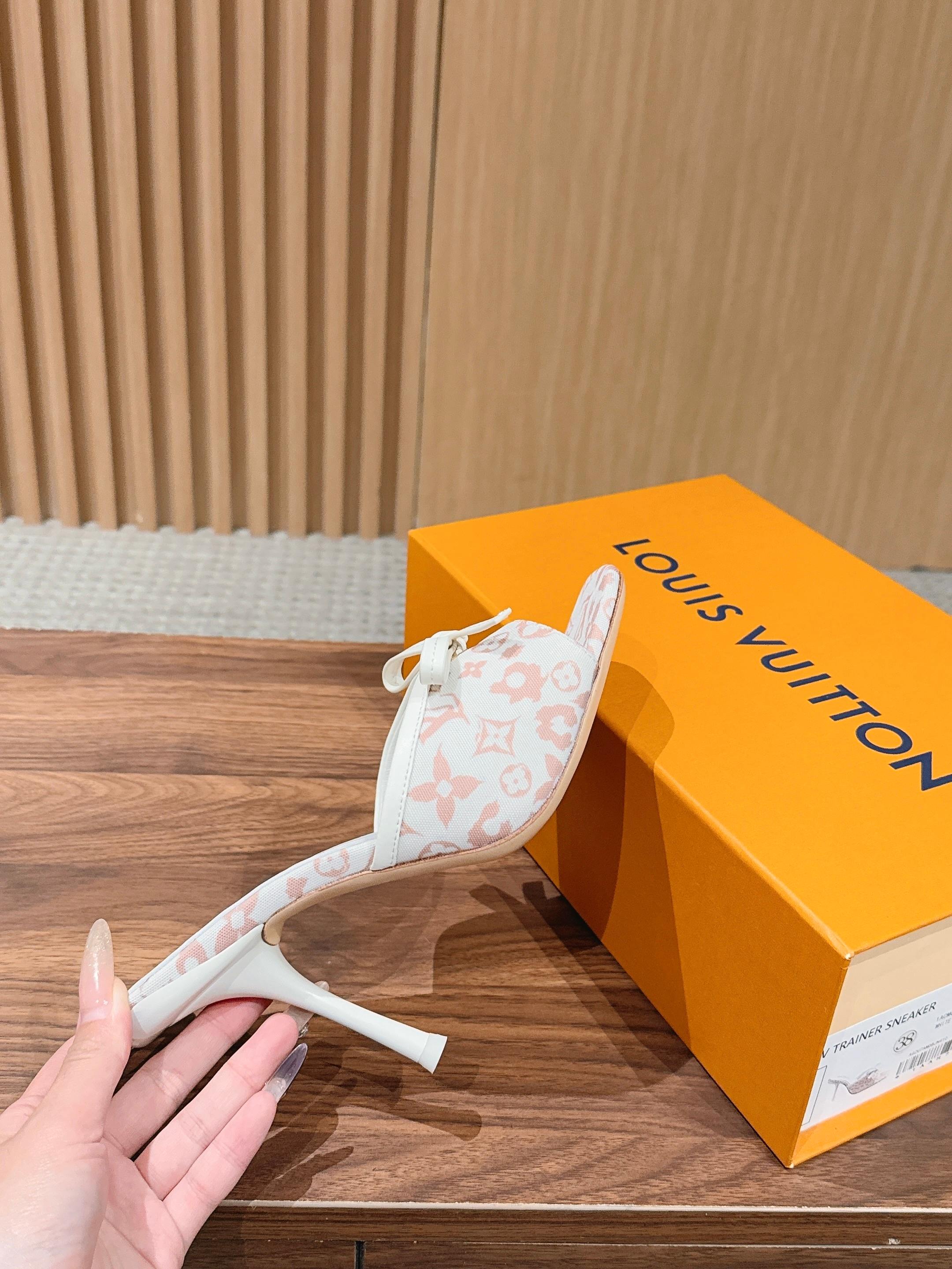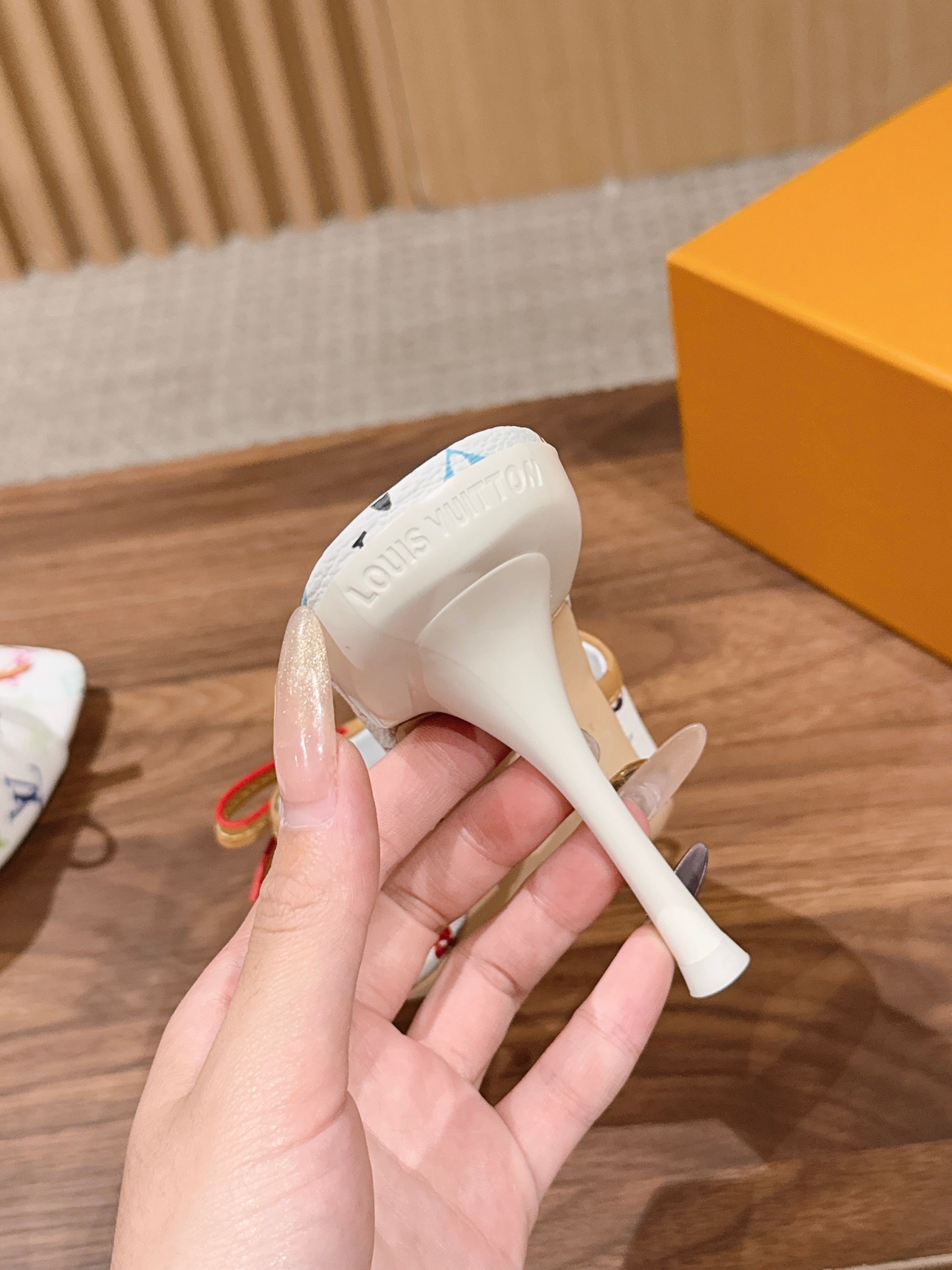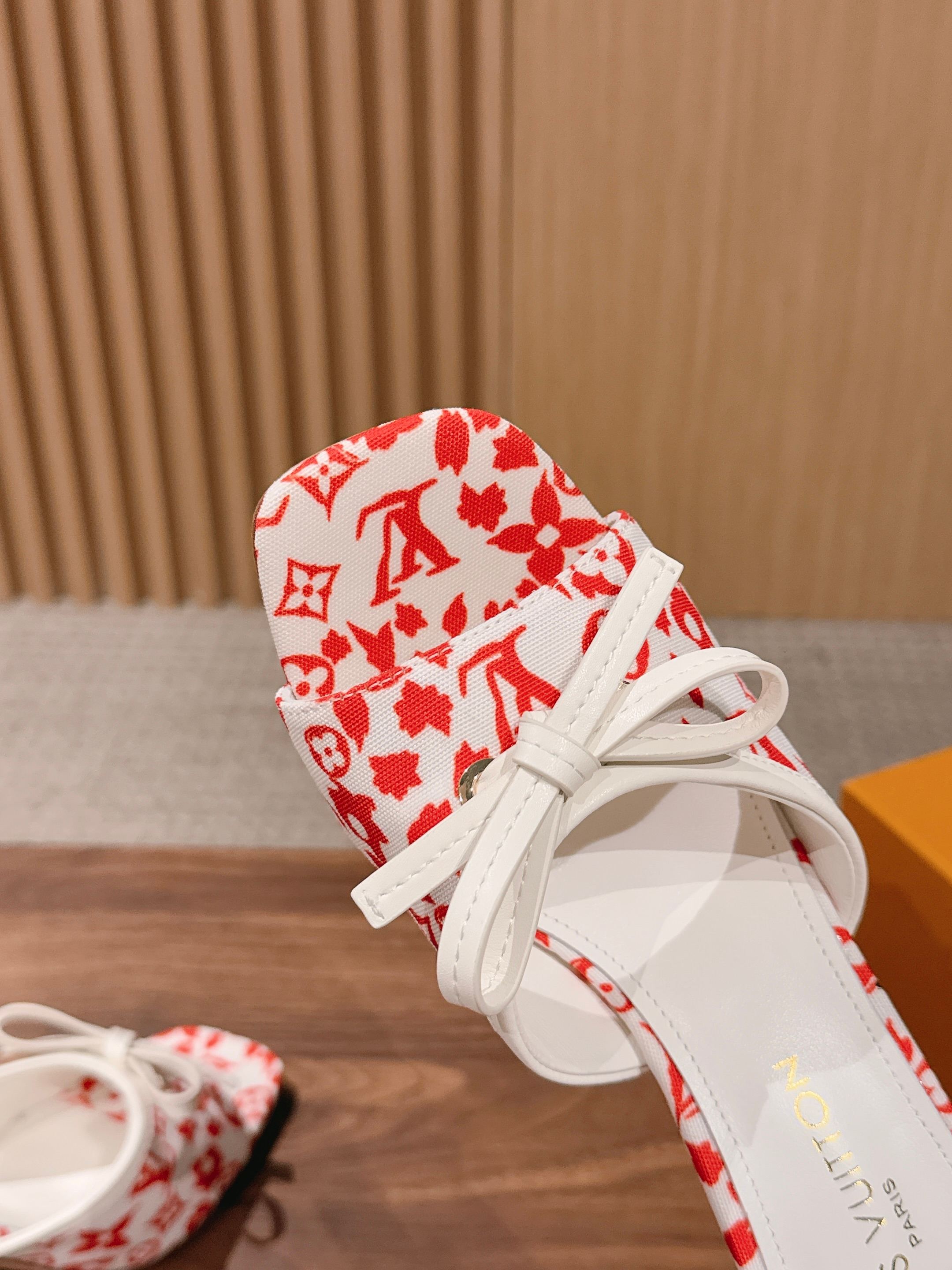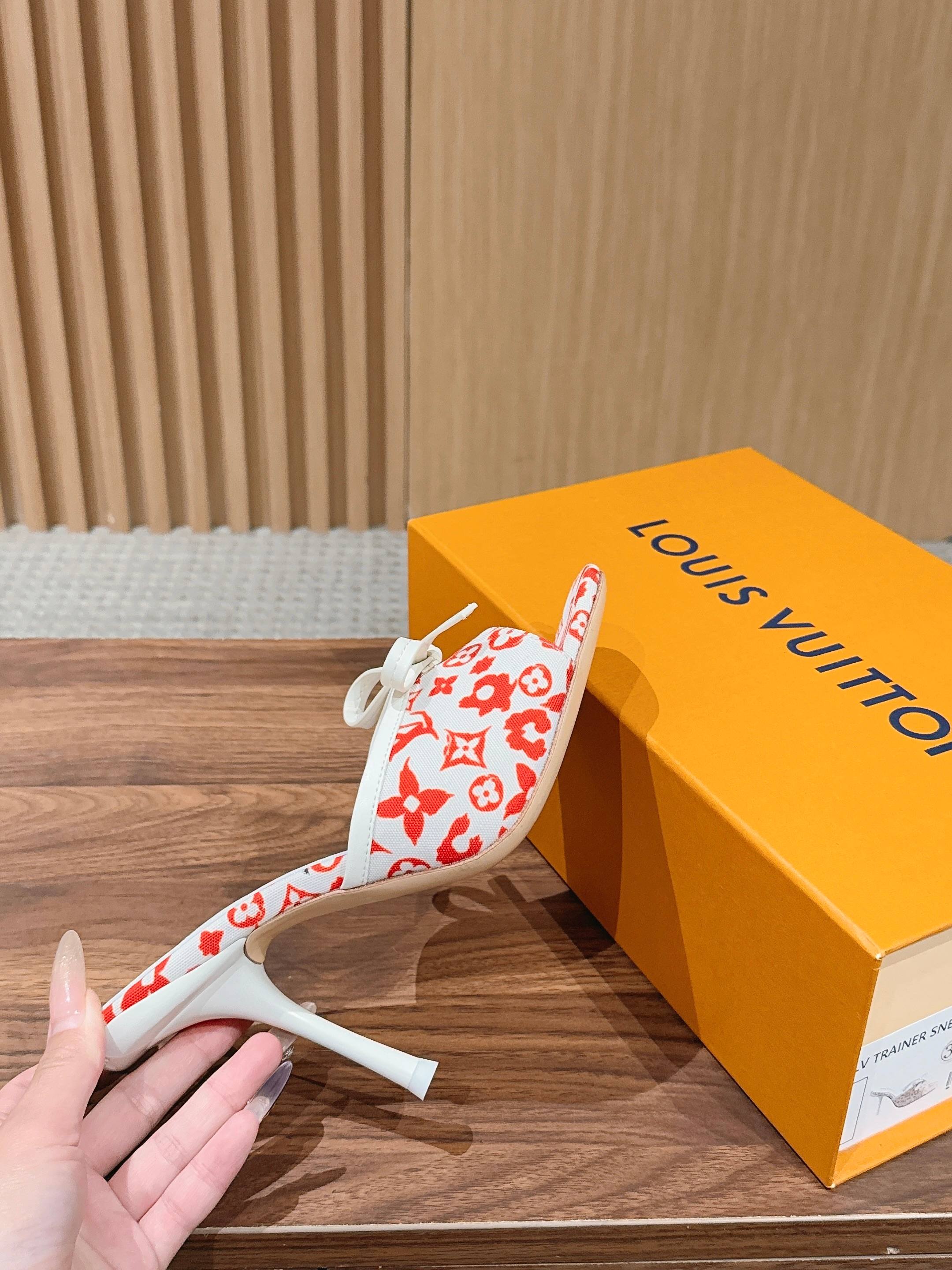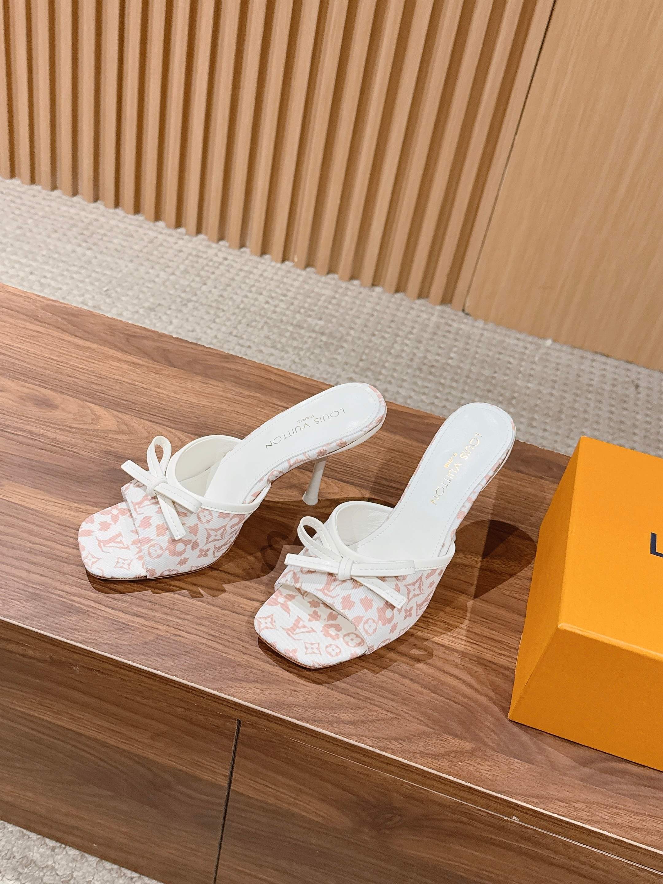 Louis Vuitton LV X TM 凉拖三彩系列小猫跟蝴蝶结凉拖鞋 小红书爆款小猫跟经典老花蝴蝶结拖鞋 路易威登×村上隆白彩联名全幅Monogram图案浸染彩虹色调,娓娓道出日本艺术家村上隆的标志性笔触。便鞋构型融入优雅小猫跟,饰钉牛皮革带再添摩登风范。 🔸面料:定制老花皮 🔸内里垫脚:羊皮 🔸鞋底:意大利真皮大底 🔸跟高:5.5cm 9.5cm 🔸码数:35-39(40.41定做不退换)