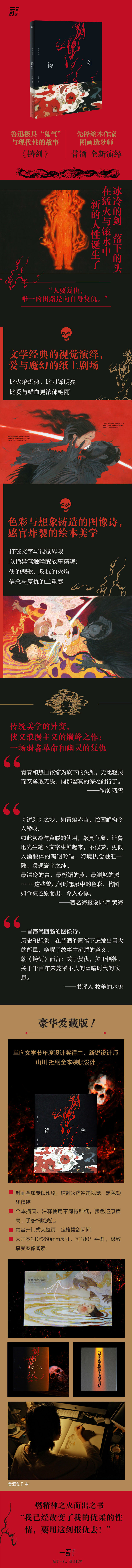 先锋绘本作家、图画造梦师——昔酒打破文字与视觉的界限,重建全新绘本美学,以艳异笔触唤醒鲁迅故事的精魂:侠的悲歌,反抗的火焰,信念与复仇的二重奏。