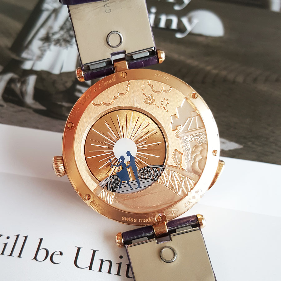 特别说明 | 日常生活防水;购于2020-01月;该表以塞纳河上爱情锁桥为背景,讲述着一对隔桥相望的恋人,盘面中央女生手撑阳伞,男士手捧玫瑰各自赶路,随着时间流失每至正午与午夜,恋人准时在桥中央相会,因此被称为恋人之桥,被誉为世界时最浪漫的手表。此款为第二代,相较于一代按下8点位按钮,恋人无惧时间束缚,随时可以相遇 |