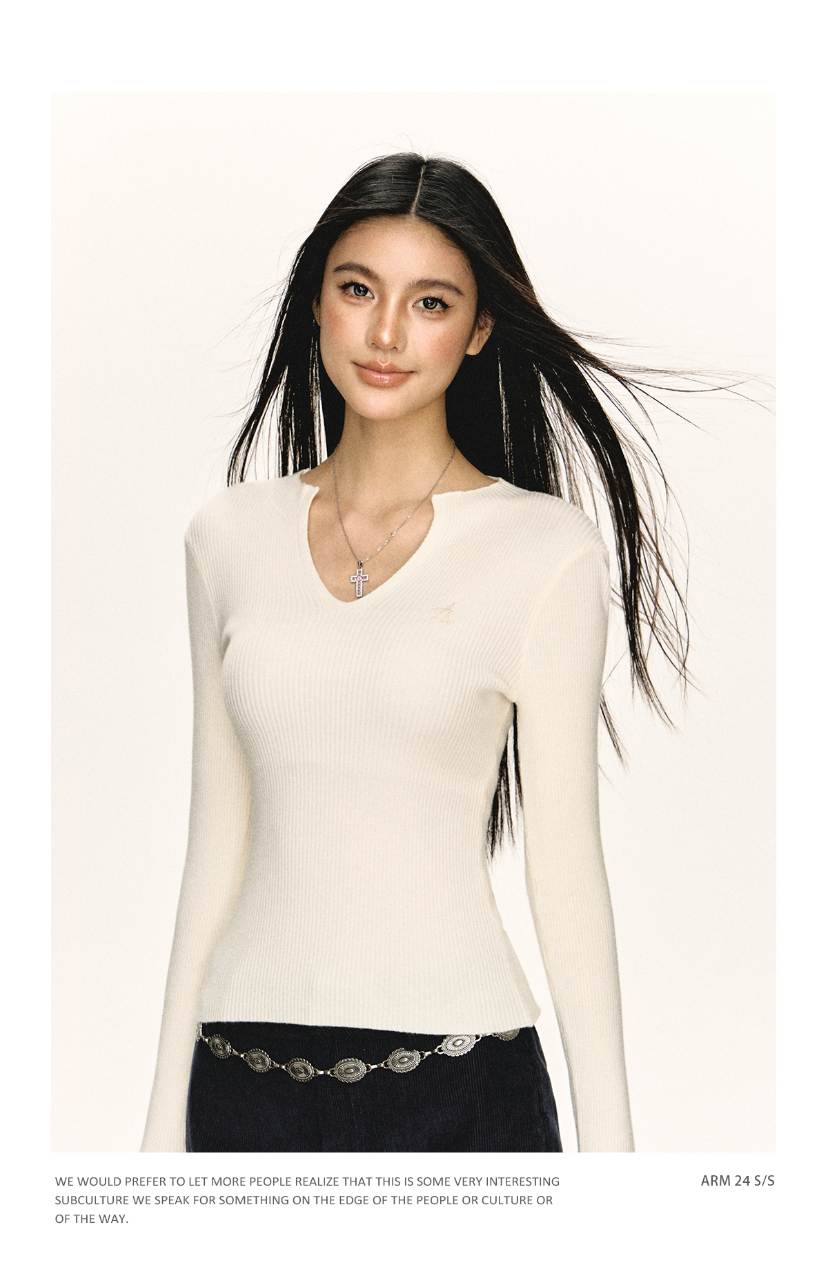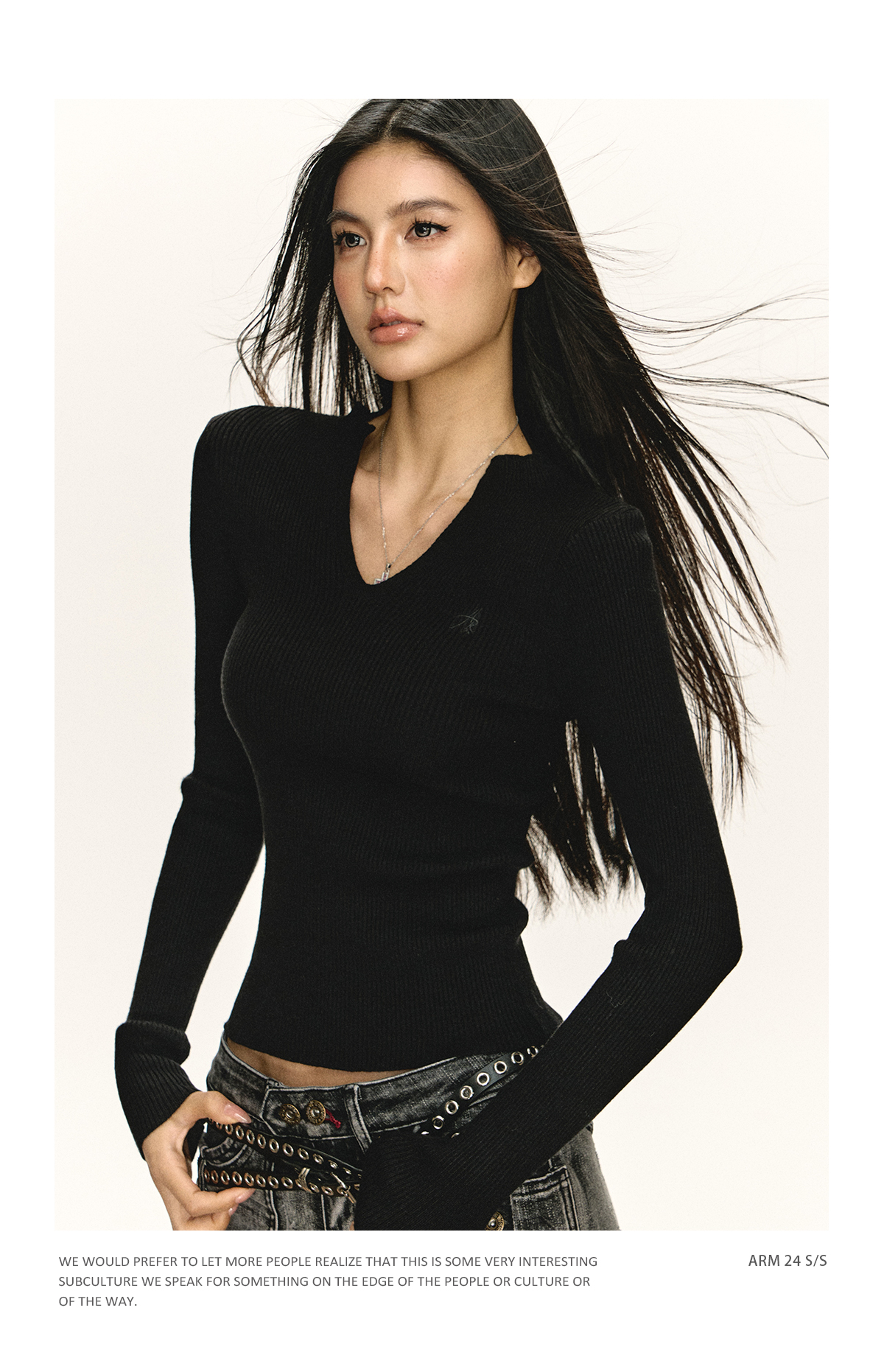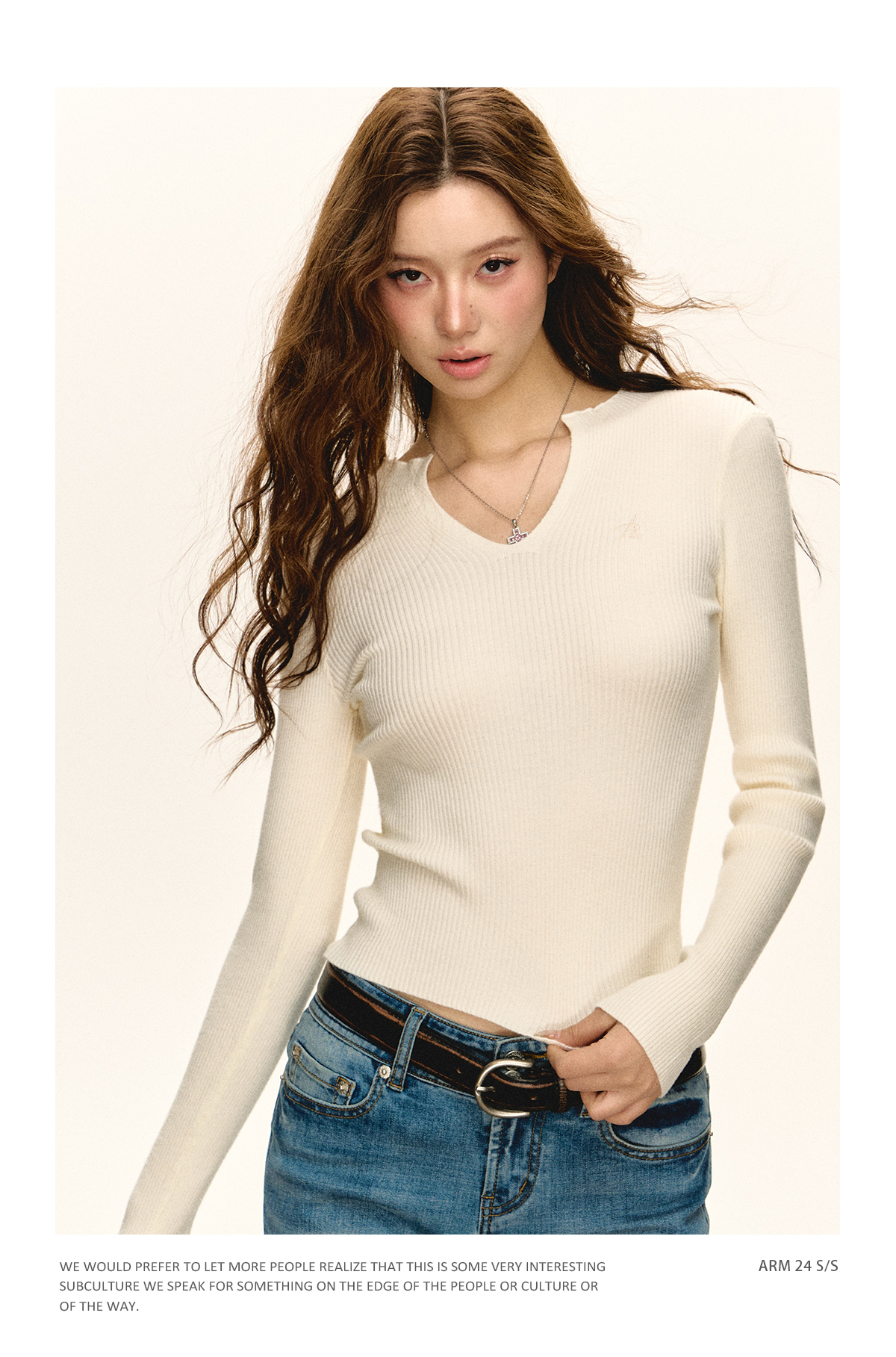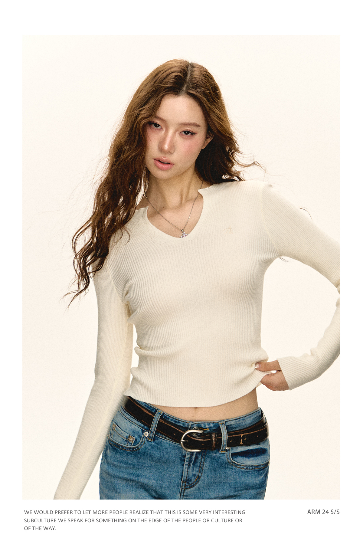 Ariseism美式复古4色小v领修身长袖针织衫女春季新款内搭打底上衣