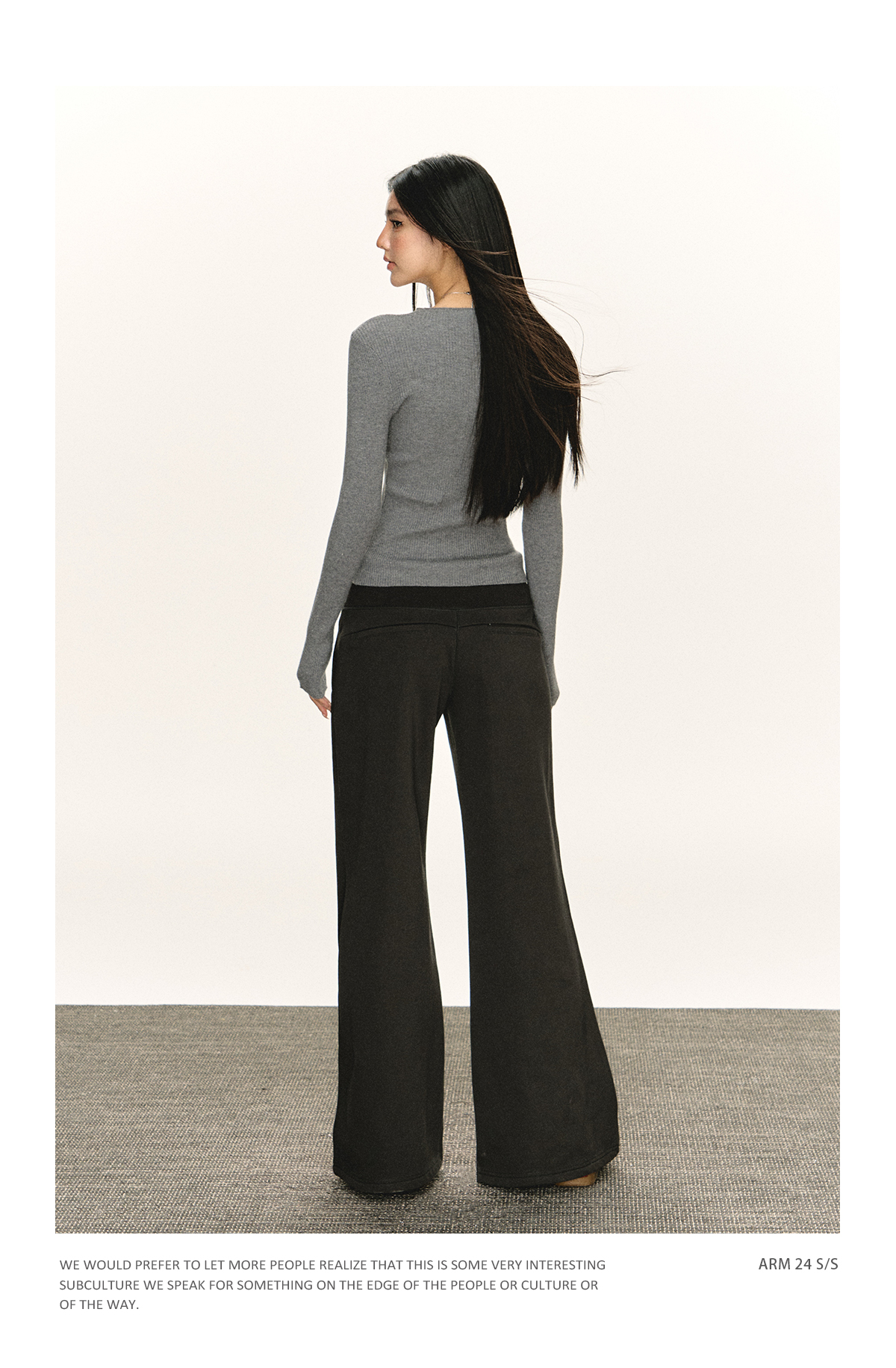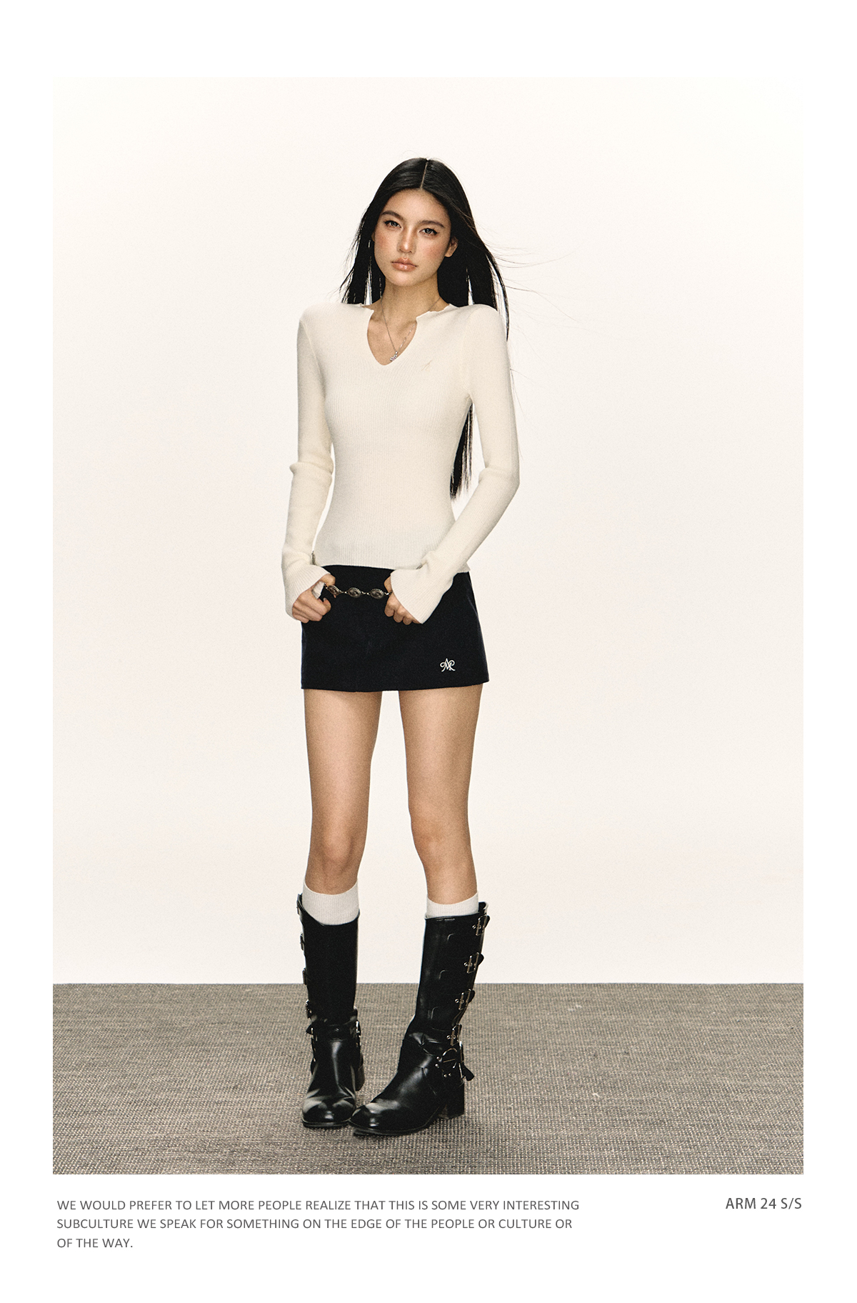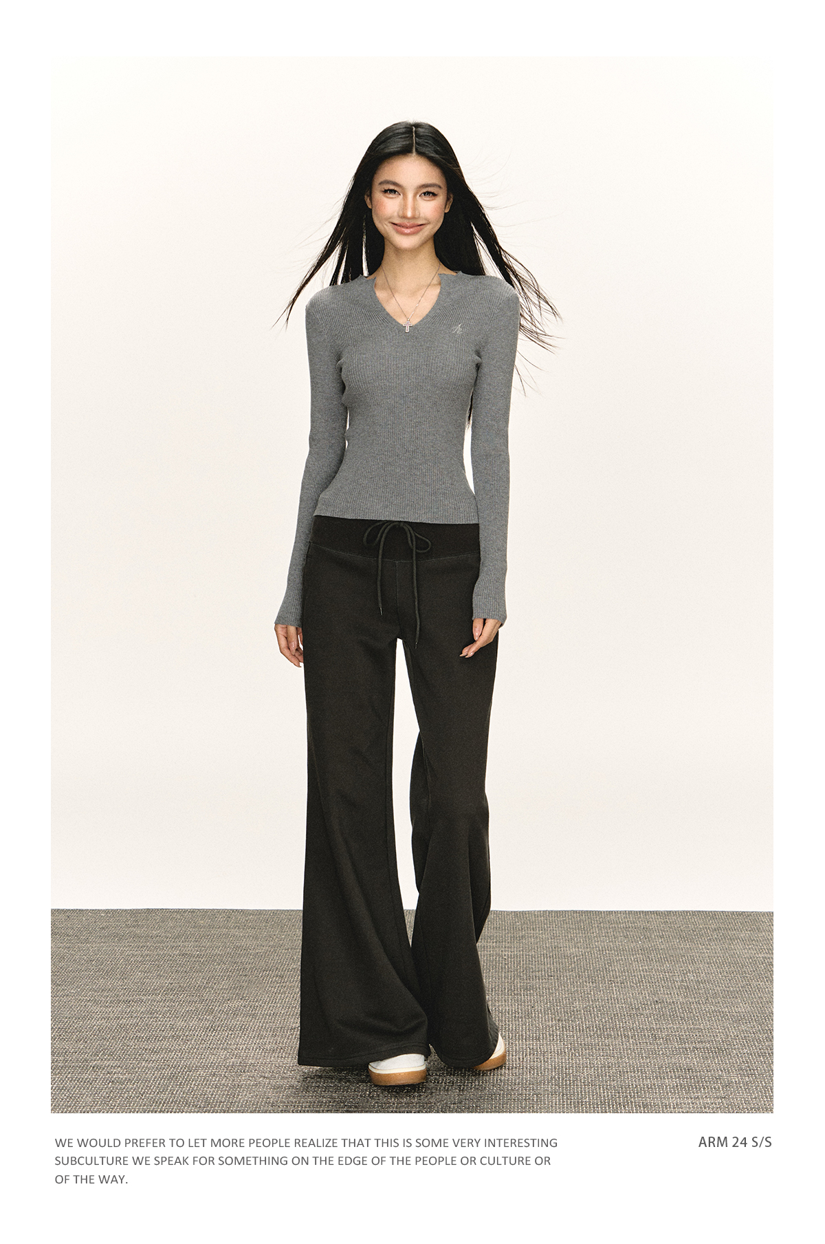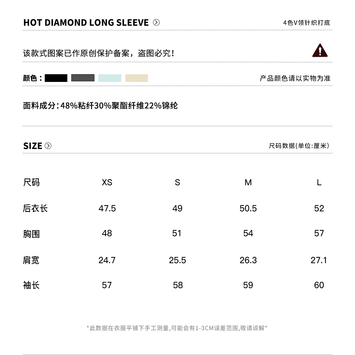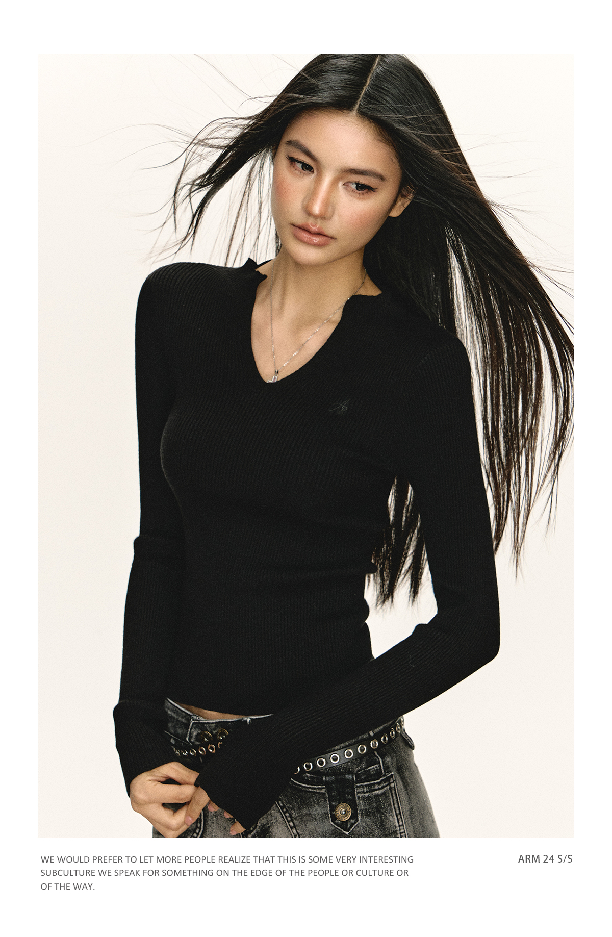 Ariseism美式复古4色小v领修身长袖针织衫女春季新款内搭打底上衣