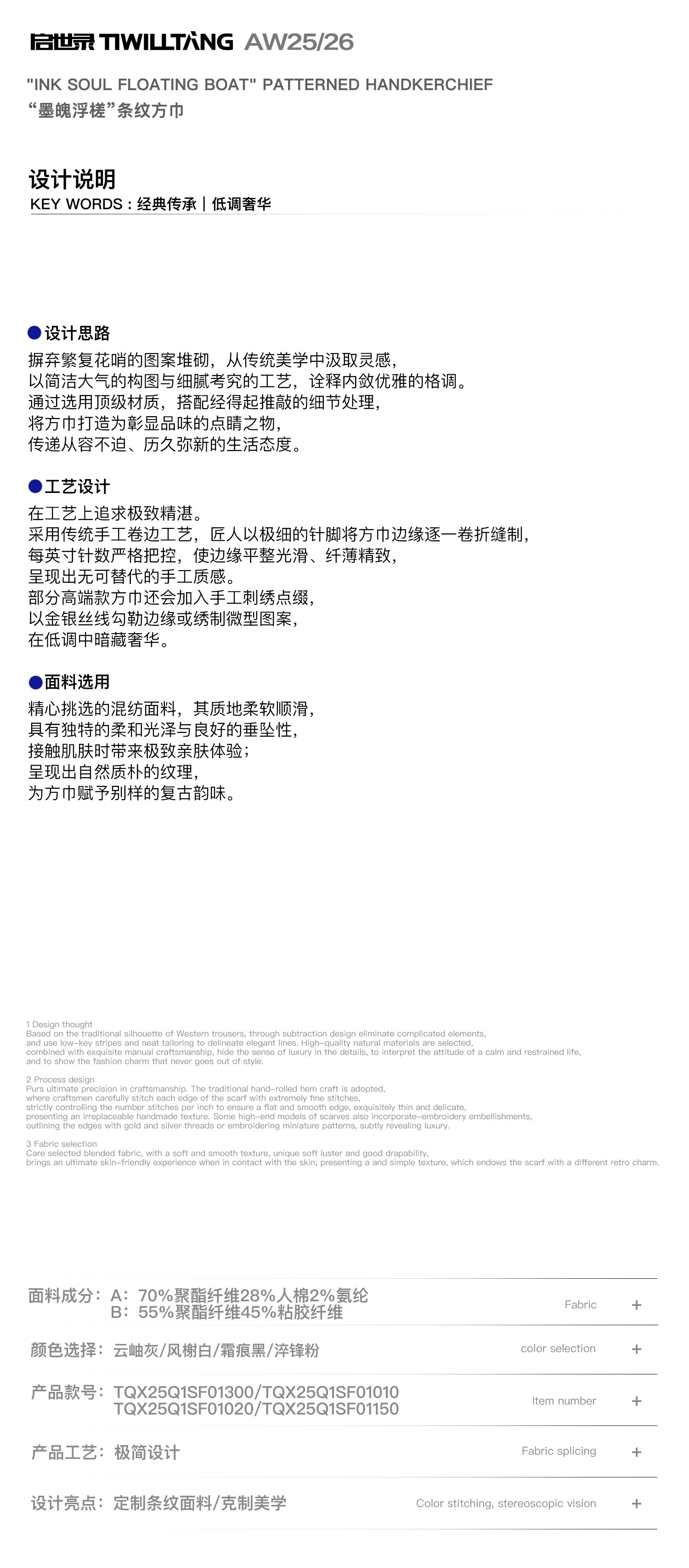 启世录TIWILLTANG“墨魄浮槎”低调奢华混纺条纹方巾男士