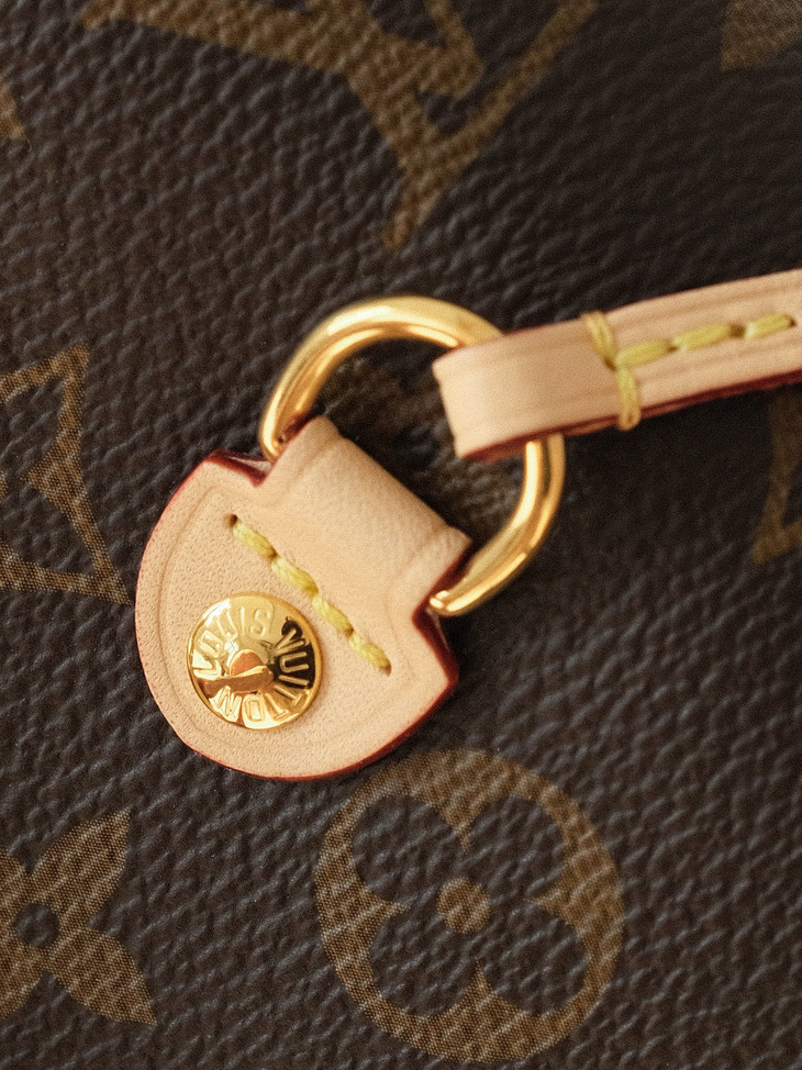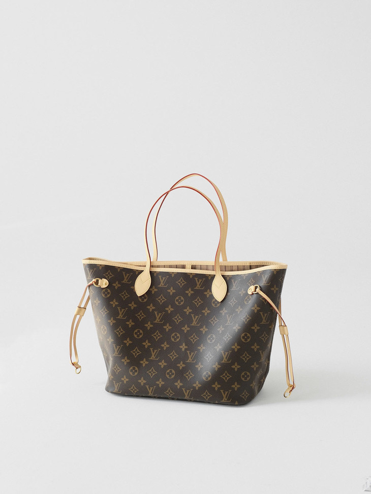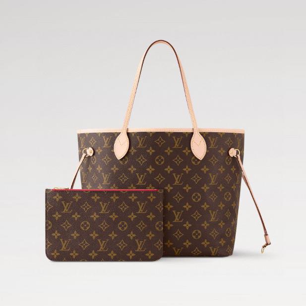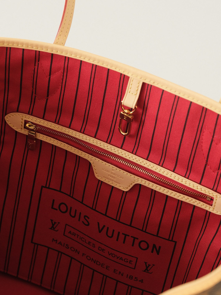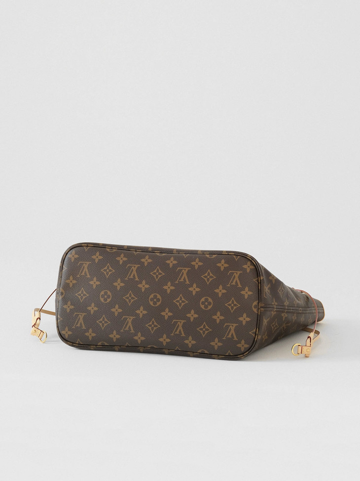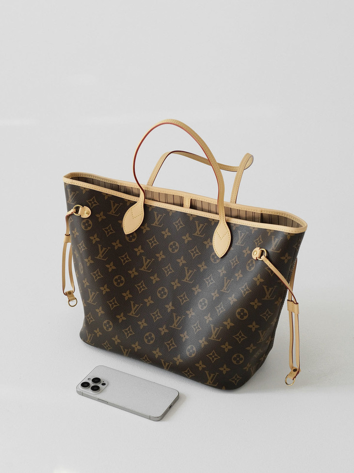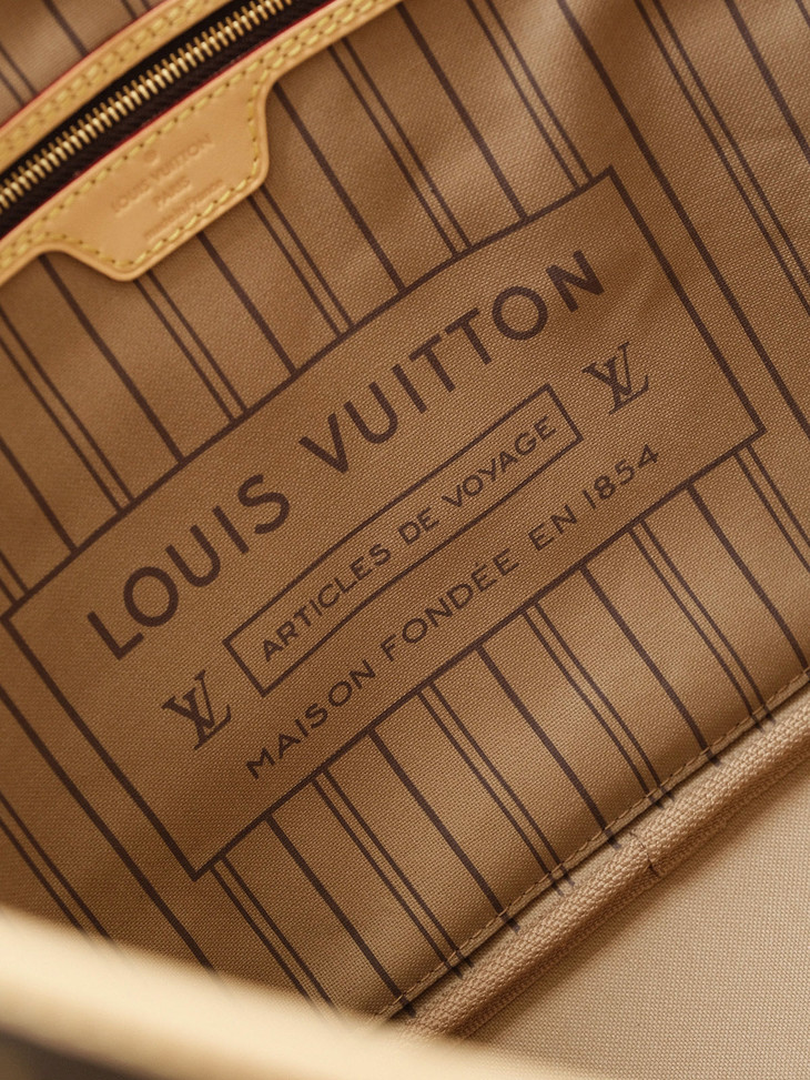 本款 Neverfull中号托特包为柔软Monogram帆布勾勒牛皮革饰边,于宽敞构型融入缤纷织物内衬。两侧饰带无论束紧或舒展均可展现别样风采。纤细手柄方便肩背或肘挎,可拆卸拉链袋可用作手拿包或□袋。内里Monogram条纹涂层帆布织物内衬 ,包身曰重量0.8千克。