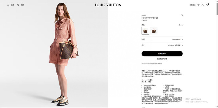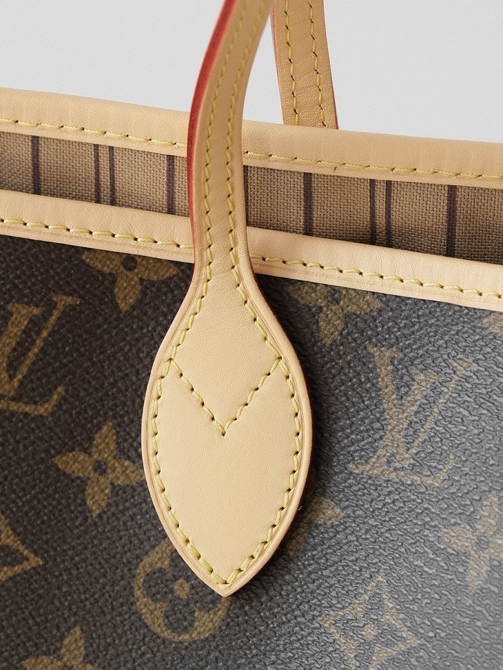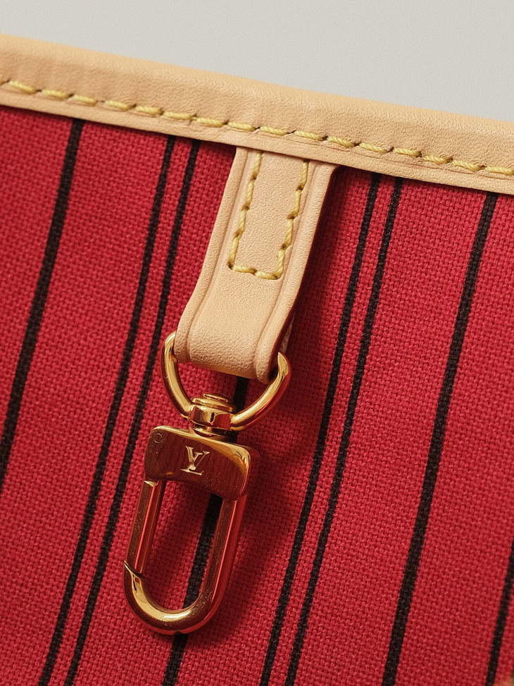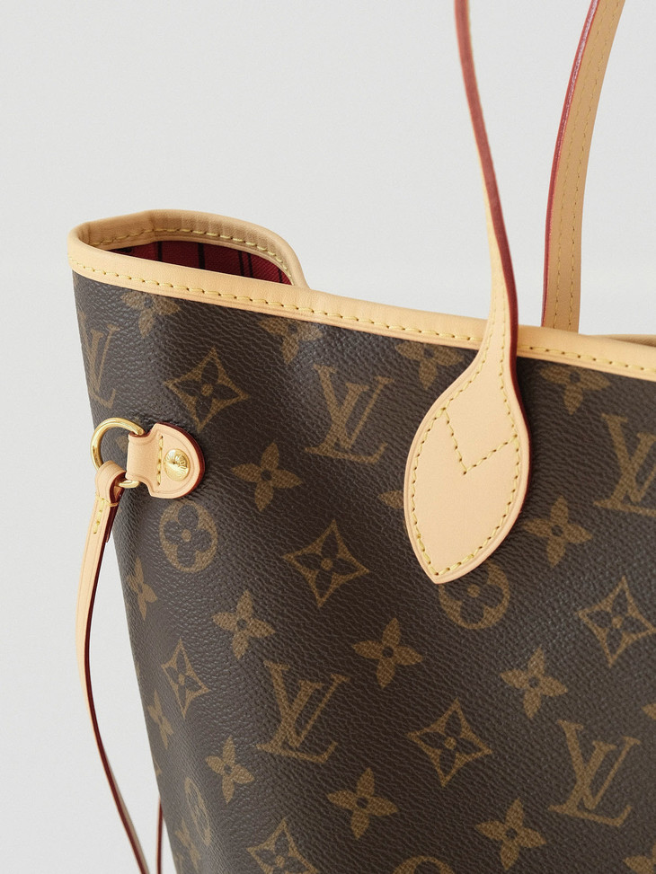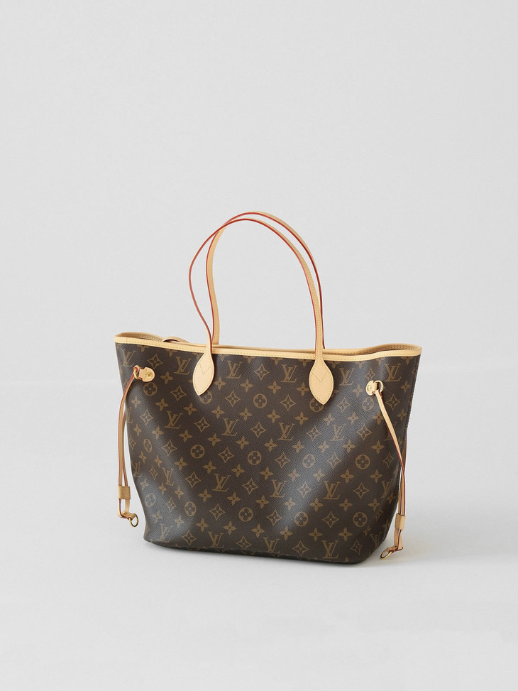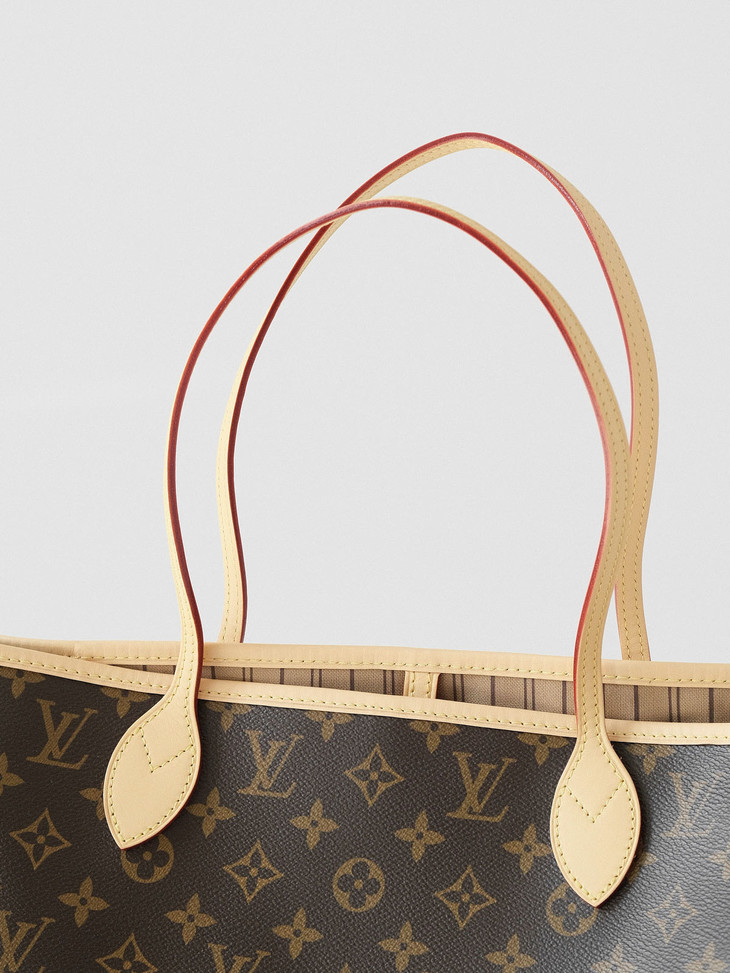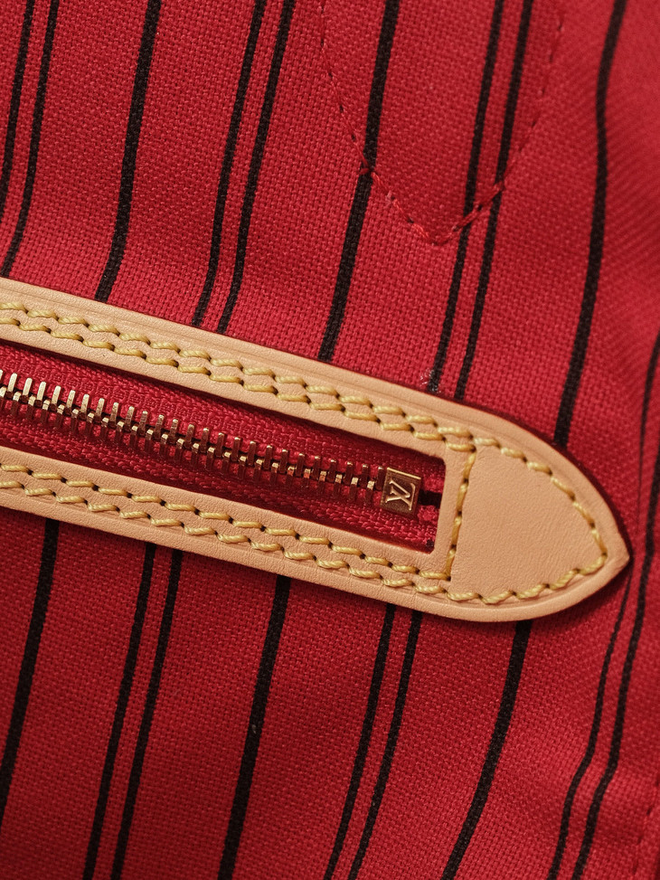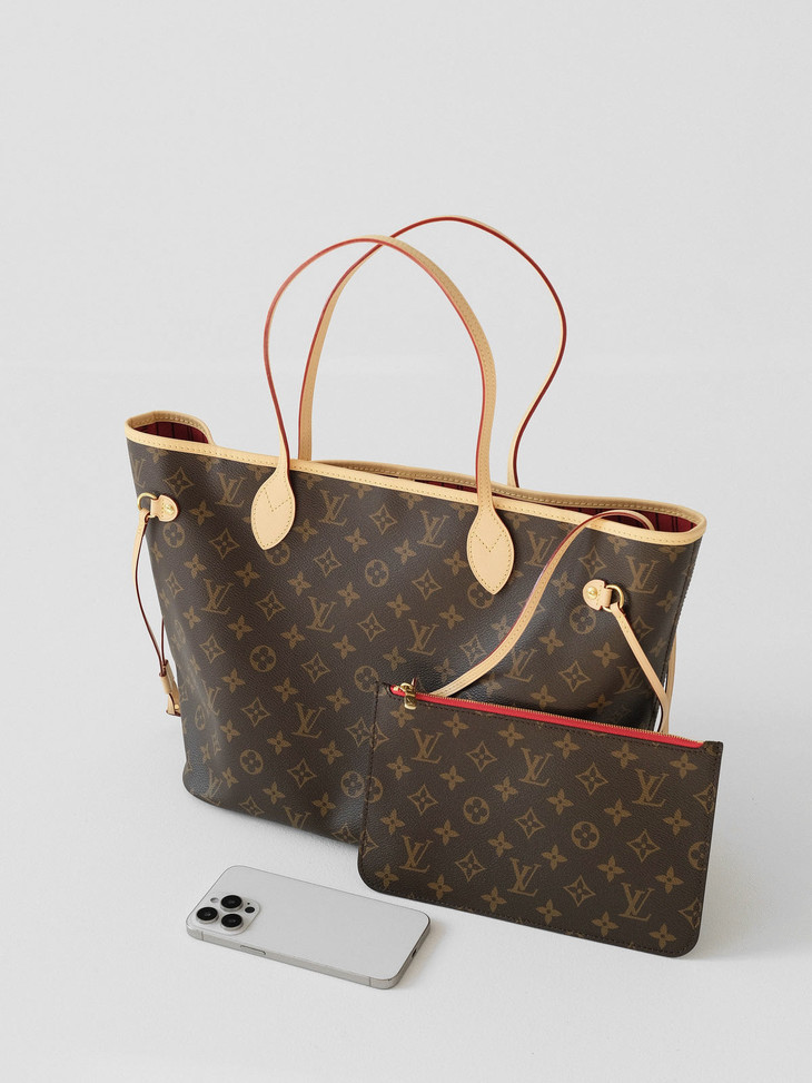 本款 Neverfull中号托特包为柔软Monogram帆布勾勒牛皮革饰边,于宽敞构型融入缤纷织物内衬。两侧饰带无论束紧或舒展均可展现别样风采。纤细手柄方便肩背或肘挎,可拆卸拉链袋可用作手拿包或□袋。内里Monogram条纹涂层帆布织物内衬 ,包身曰重量0.8千克。
