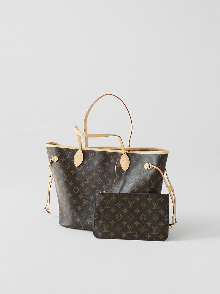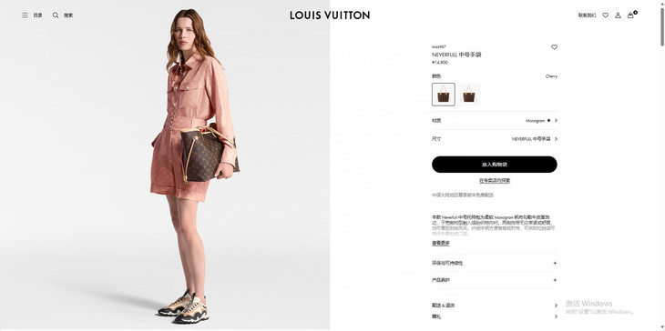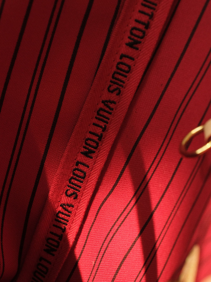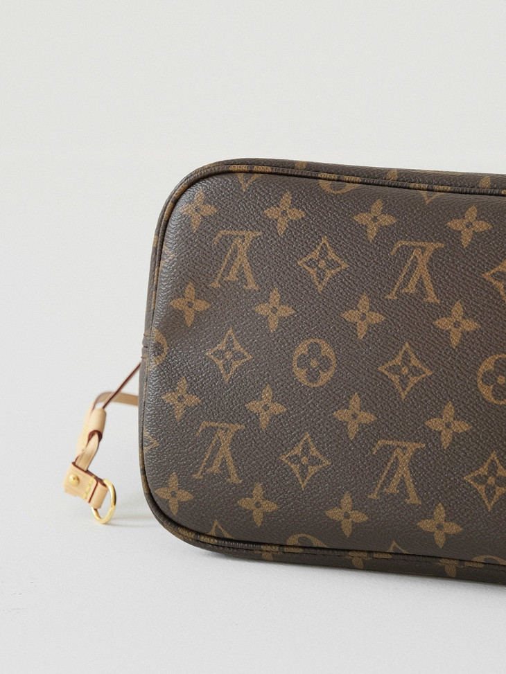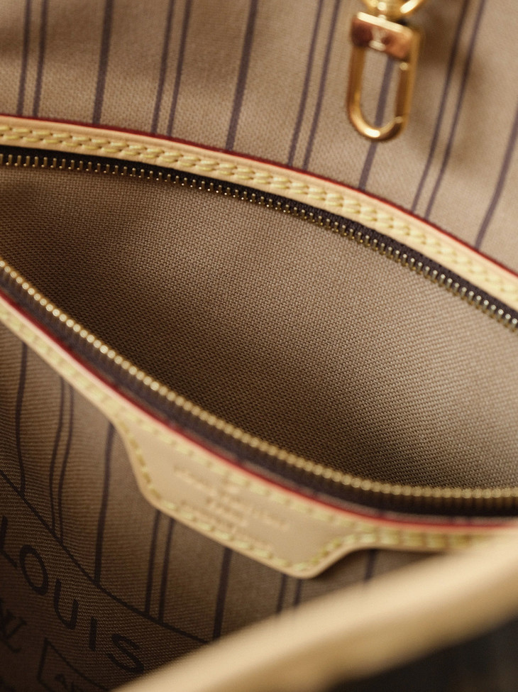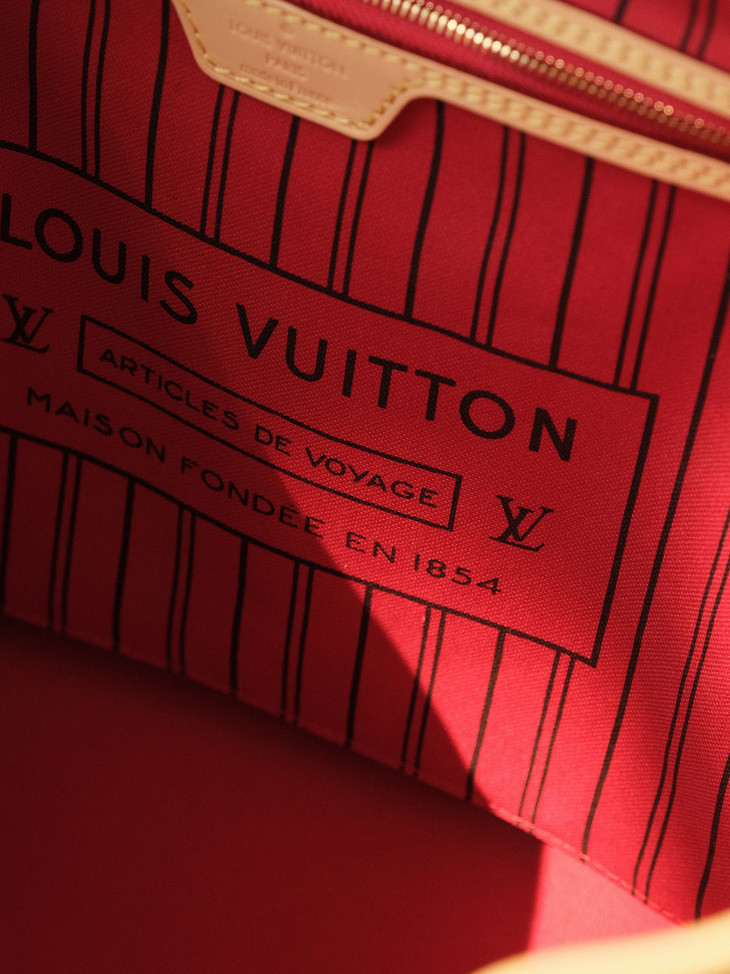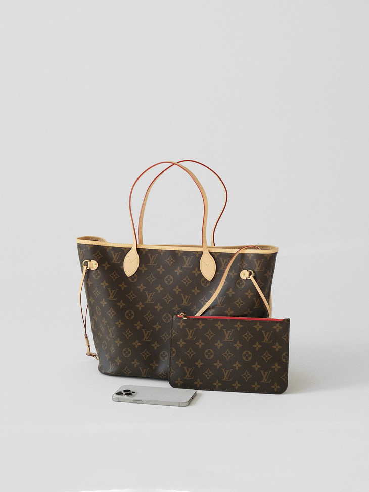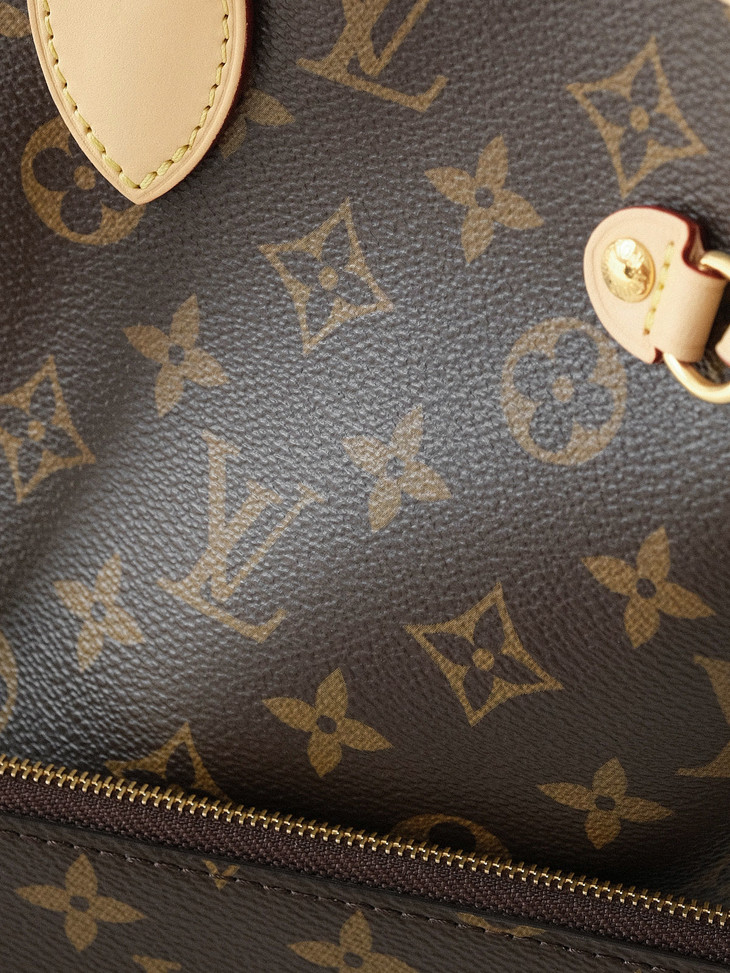 本款 Neverfull中号托特包为柔软Monogram帆布勾勒牛皮革饰边,于宽敞构型融入缤纷织物内衬。两侧饰带无论束紧或舒展均可展现别样风采。纤细手柄方便肩背或肘挎,可拆卸拉链袋可用作手拿包或□袋。内里Monogram条纹涂层帆布织物内衬 ,包身曰重量0.8千克。
