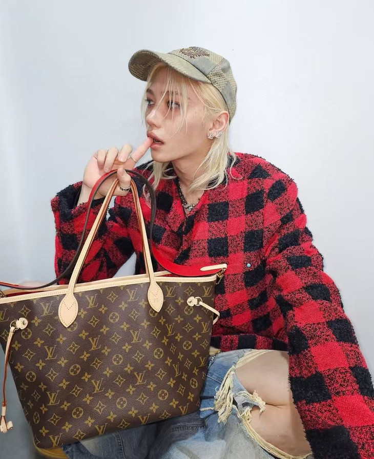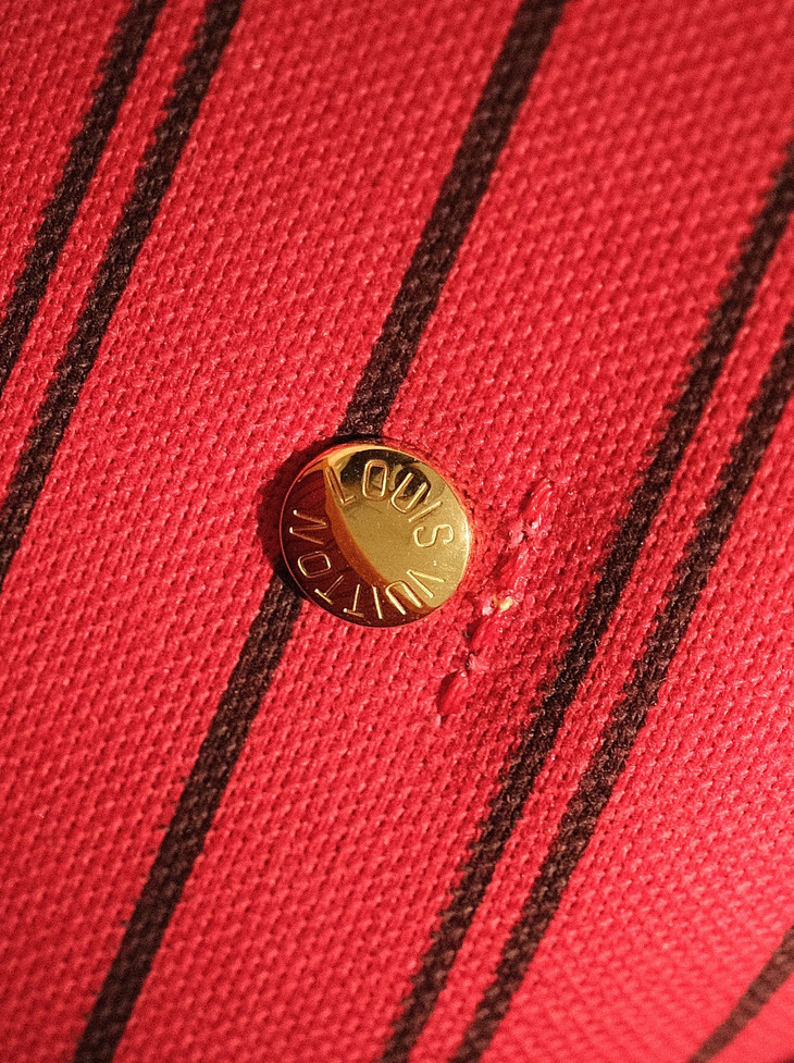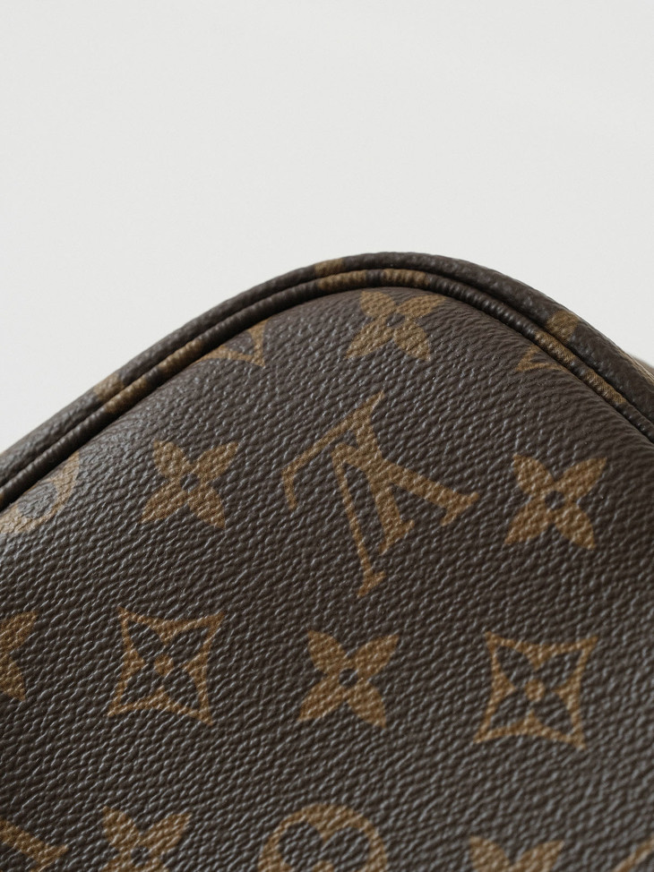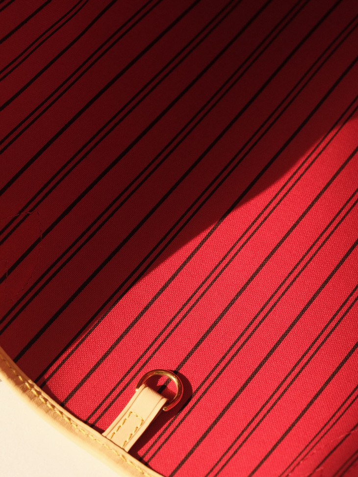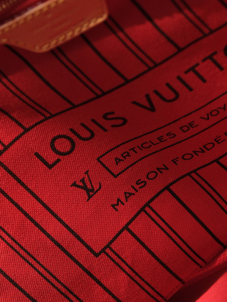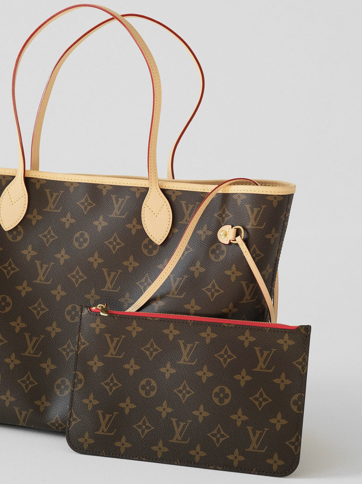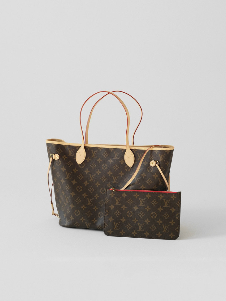 本款 Neverfull中号托特包为柔软Monogram帆布勾勒牛皮革饰边,于宽敞构型融入缤纷织物内衬。两侧饰带无论束紧或舒展均可展现别样风采。纤细手柄方便肩背或肘挎,可拆卸拉链袋可用作手拿包或□袋。内里Monogram条纹涂层帆布织物内衬 ,包身曰重量0.8千克。