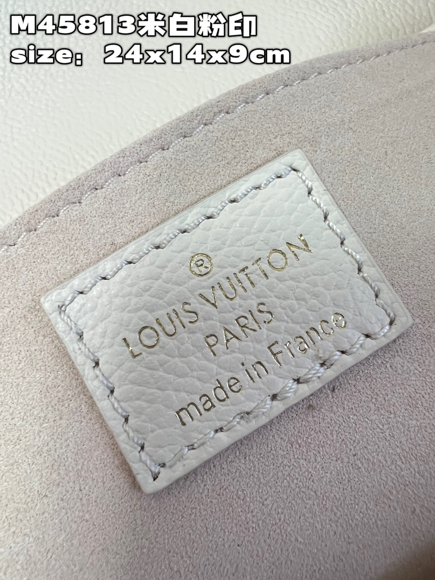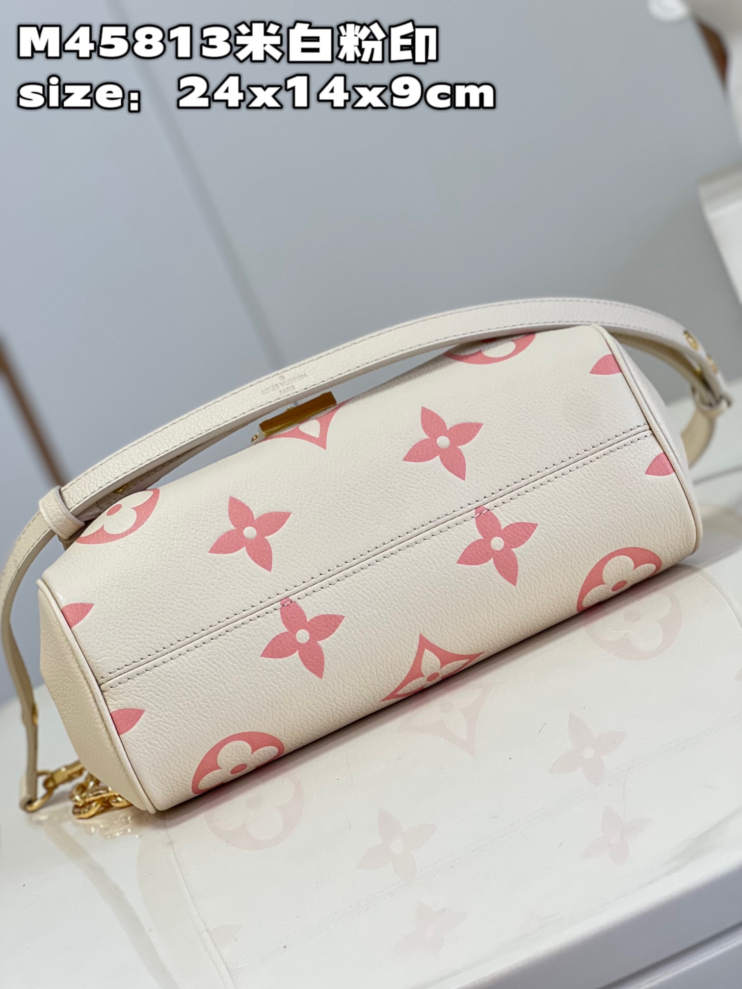 【配全套专柜包装 M45813米白粉印】M46393 本款 Favorite 手袋取材 Monogram Empreinte 压纹皮革,以淡雅底色烘托 Monogram 印花,搭配微纤维内衬。可调节皮革肩带和链条均可拆卸,腋下、单肩、斜挎随心切换。