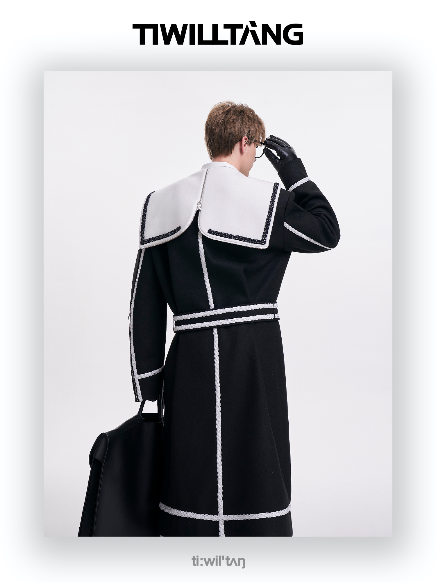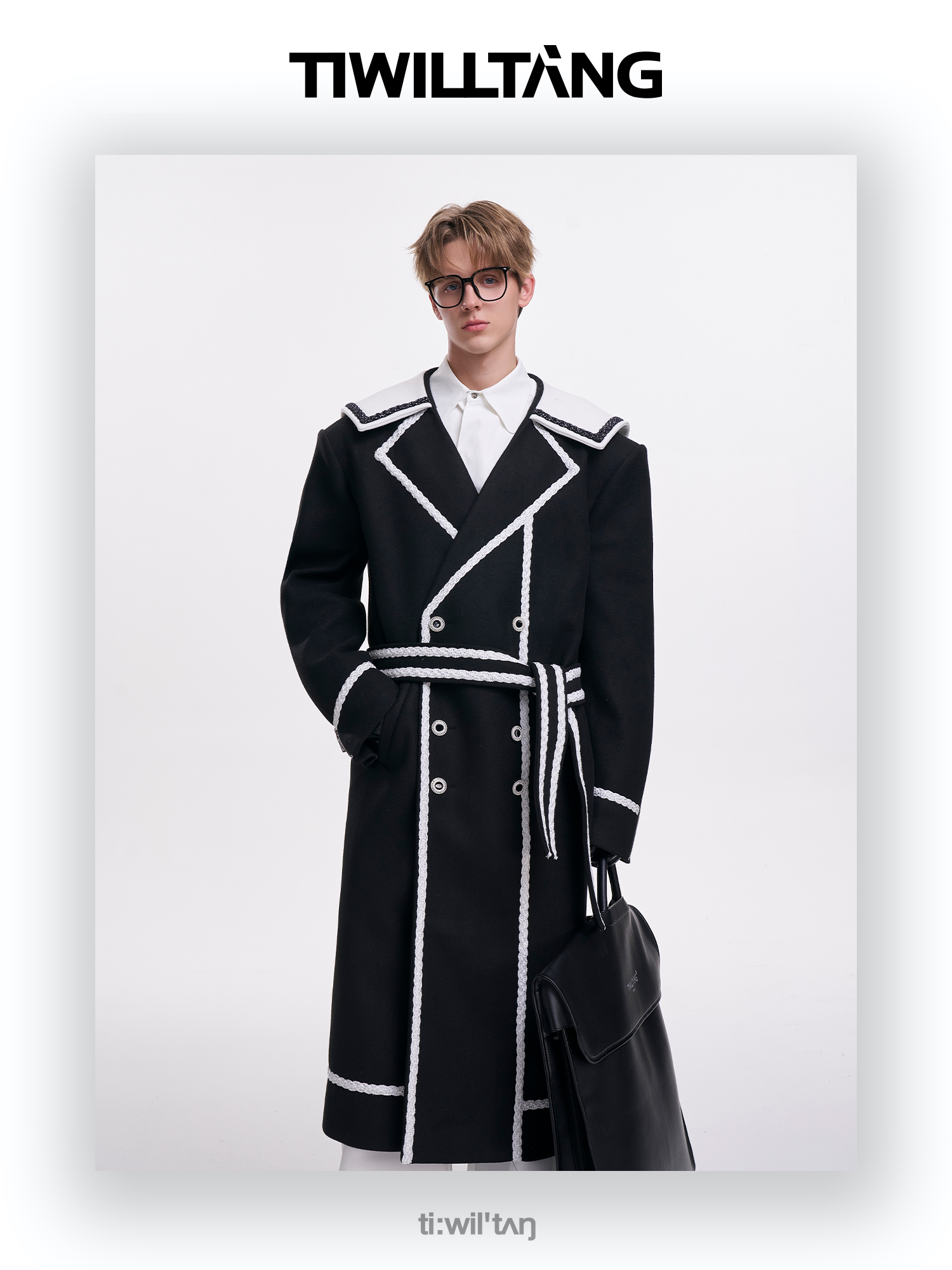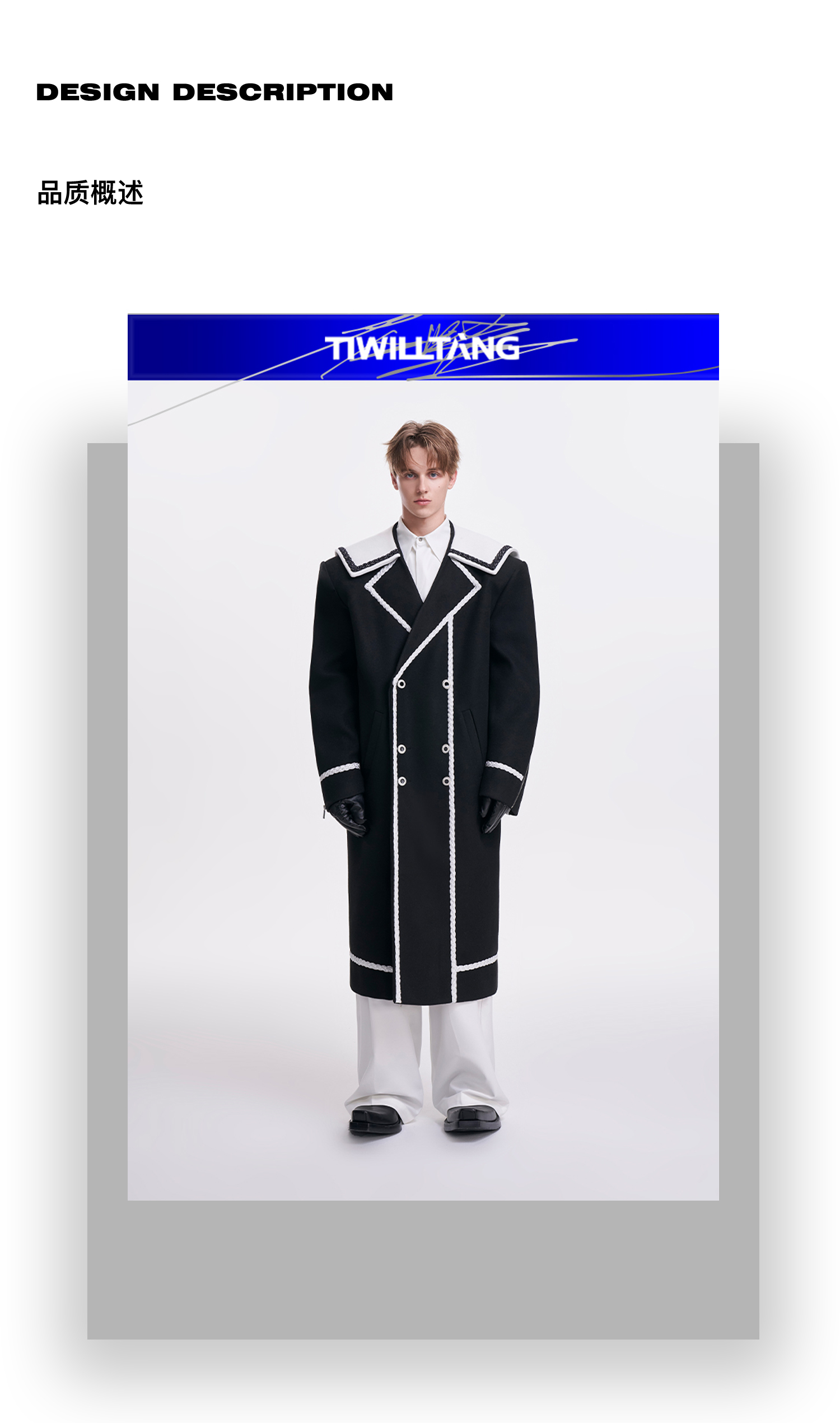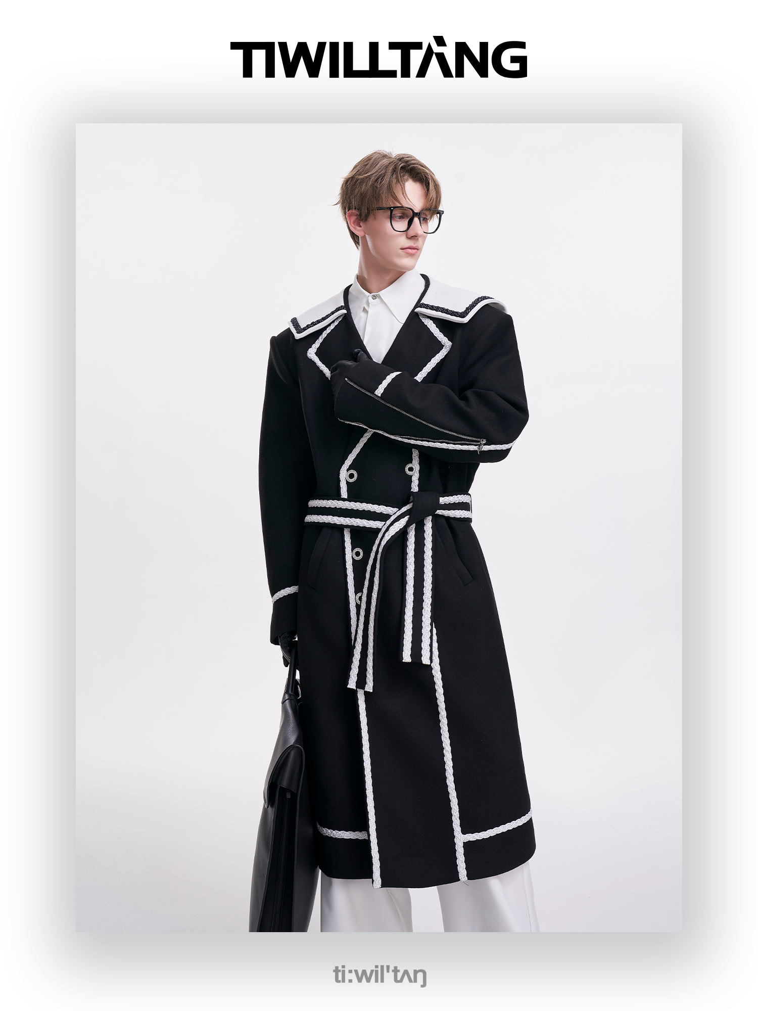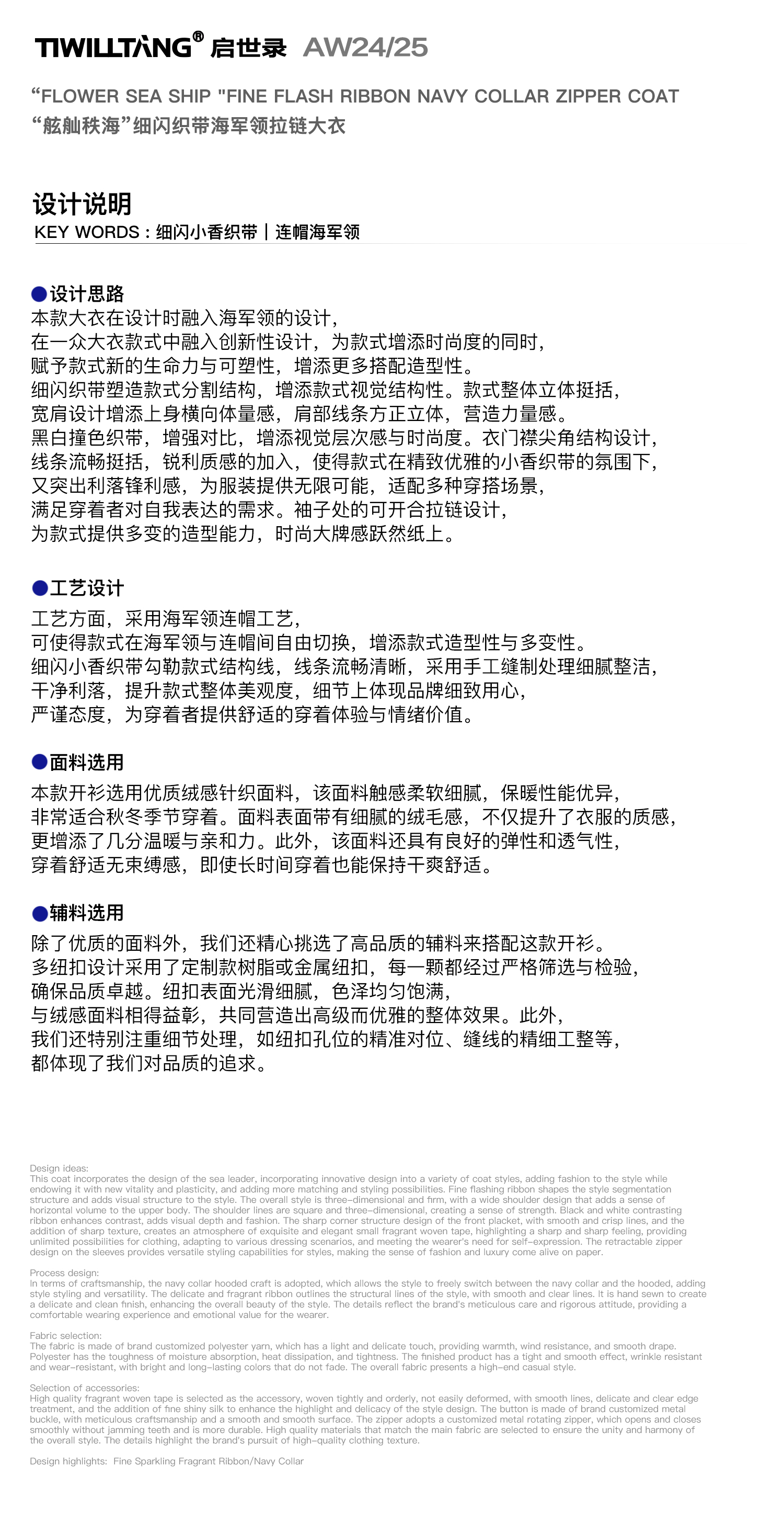启世录TIWILLTANG“舷舢秩海”海军领拉链大衣冬长款收腰毛呢外套