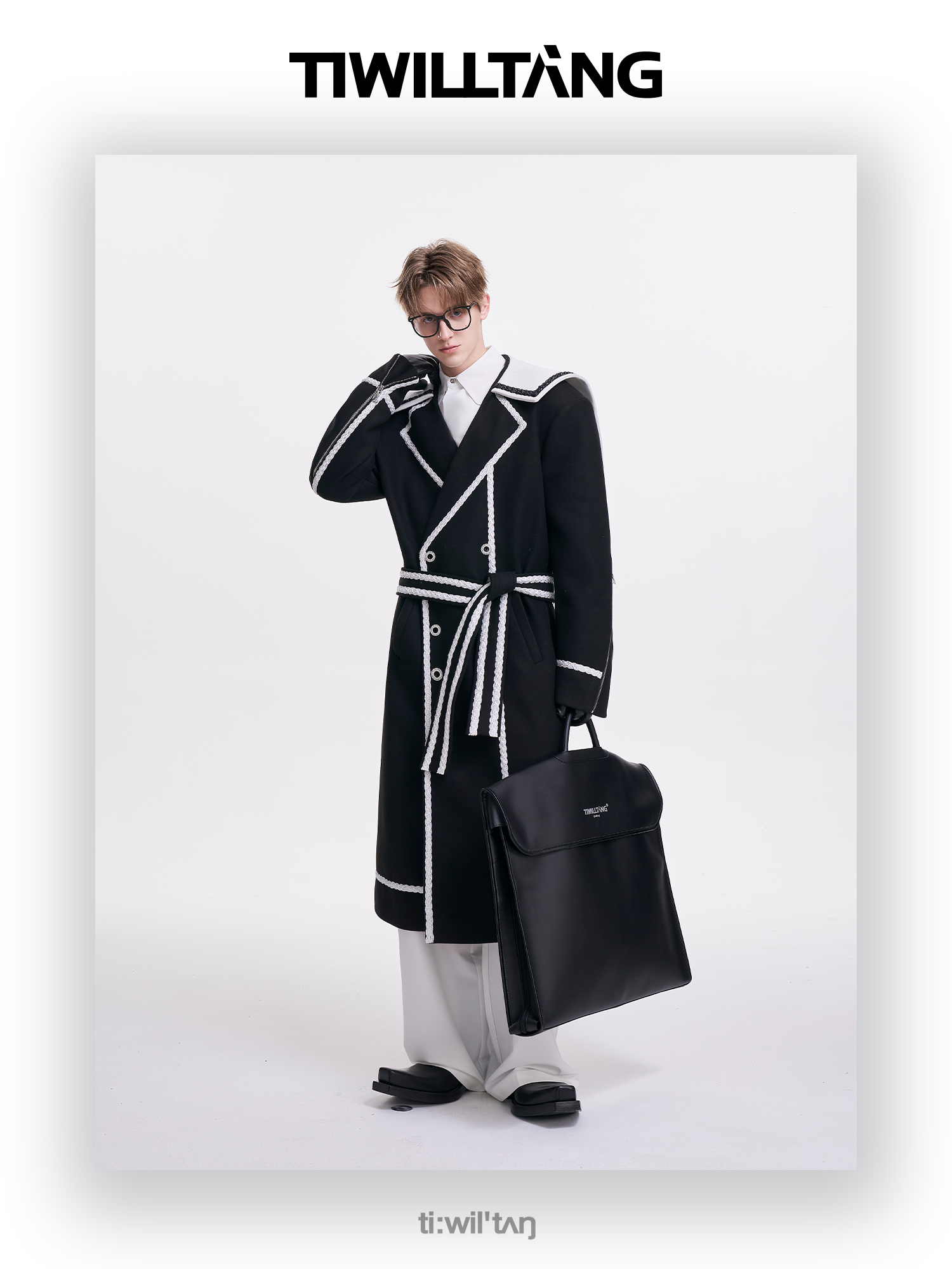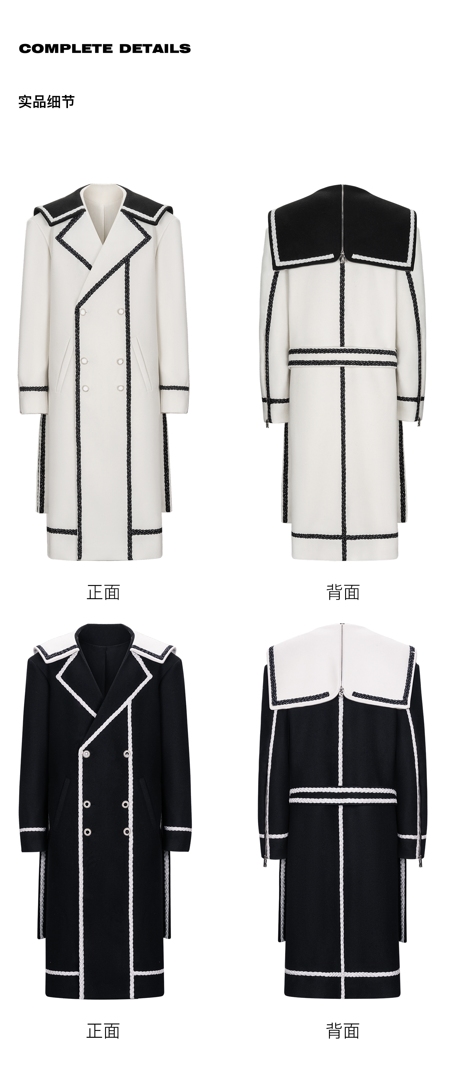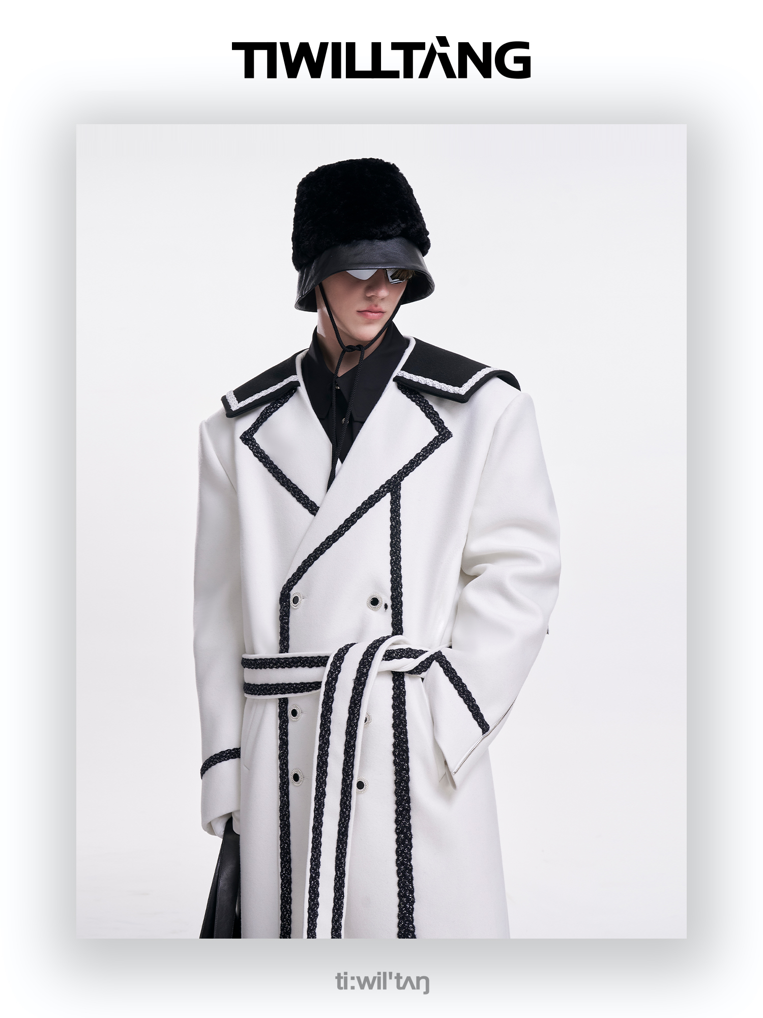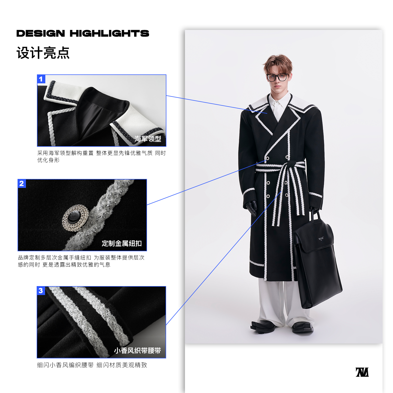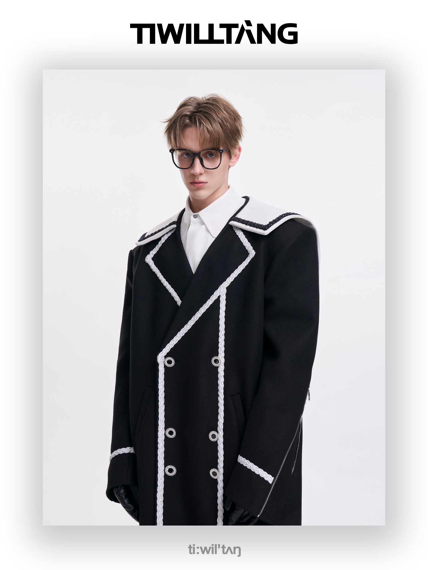 启世录TIWILLTANG“舷舢秩海”海军领拉链大衣冬长款收腰毛呢外套
