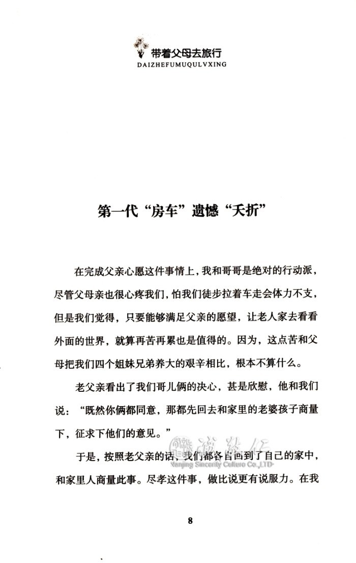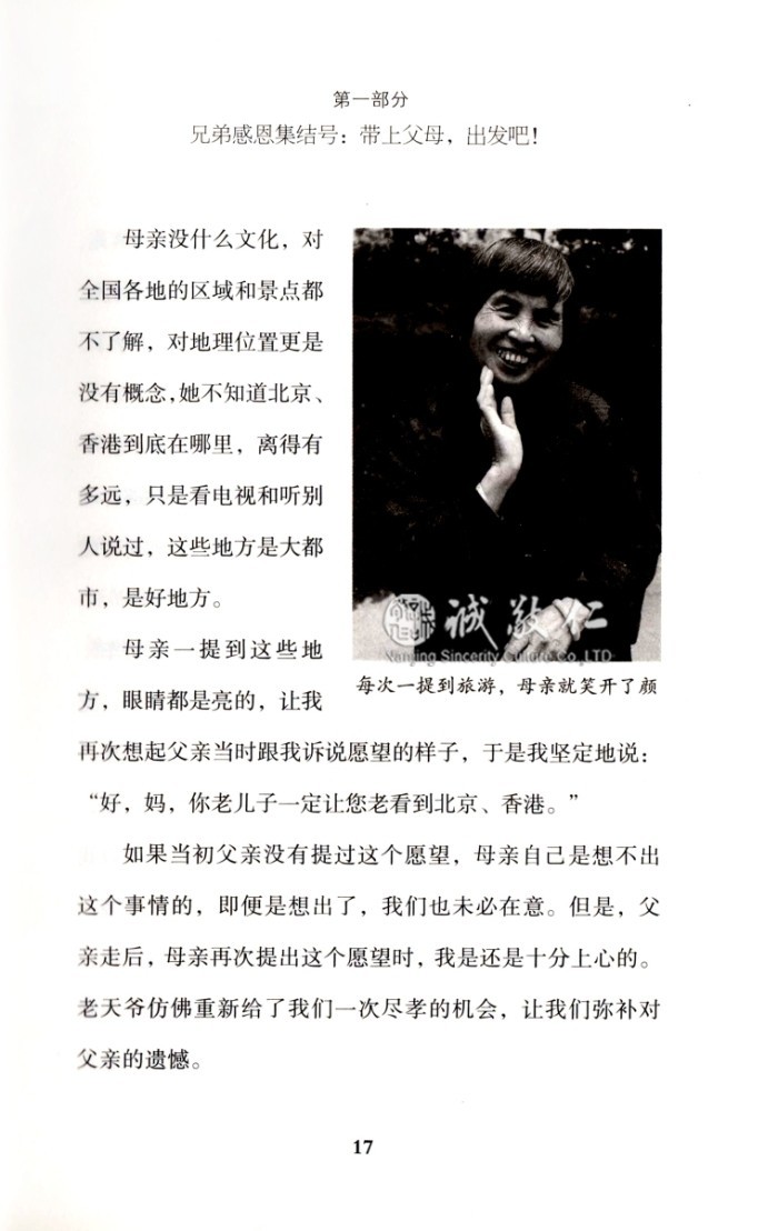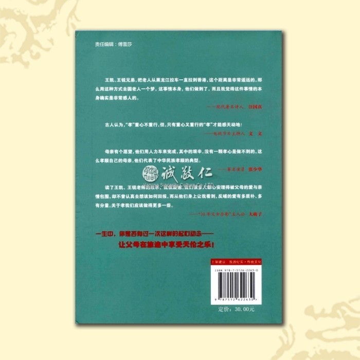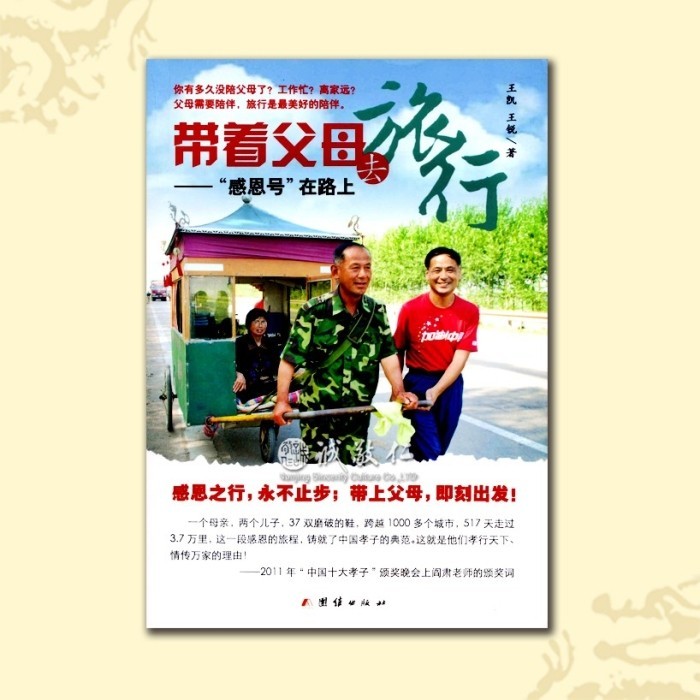 【作者简介】 王凯、王锐兄弟 年过六旬,黑龙江省兰西县人。为完成父亲的遗愿,实现母亲的梦想,他们自制“感恩号”人力房车,从老家出发,凭借一颗坚毅的心,拉着母亲周游华夏。曾被授予“麻城孝子”光荣称号、被评为“2011中国十大孝子”。中、日、韩等国内外上百家媒体,对其孝行进行了深入采访和追踪报道。现哥哥王凯在全国各地宣讲孝道,弟弟王锐带领“感恩号”家庭正在进行第四次感恩之旅,将中华孝道发扬光大。 【编辑推荐】 1.独特的人,独特的旅行。 6旬兄弟自制人力板车,拉着8旬的老母亲,4次户外旅行,徒步5万里。“中国十大孝子”典范王家兄弟用脚步诠释母子情深,赏得不仅是美景,更是美德。 2.纪实旅程,完整呈现。 最原汁原味的孝道之行,最感人肺腑的旅行纪实,前所未有的旅游方式,深入内心的旅游内涵,用第一视角完整展现“感恩号”的孝道长征。 3.反响强烈,全民关注。 “感恩号”事件备受瞩目,中华孝道发人深思,国内外上百家媒体深入追踪和采访,日韩等国追踪报道,其孝行感天动地。 【内容简介】 如果你身在异乡,每年春节回家一次,平均一天陪父母3小时,一年只能陪父母21小时。假定你的父母现在55岁,设想他们能活到85岁,在未来30年里陪在他们身边的时间只有630小时,也就是26天,还不到一个月。 父母需要陪伴,旅行是最美好的陪伴。 6旬孝子自制人力板车,拉着8旬老母亲,徒步行走近50000里,跨越1000多个城镇,用坚实的脚印丈量祖国大地,用感恩的目光欣赏大河山川。 一段感恩旅程,铸就中国孝子的典范。孝行天下,情暖万家,带上父母,即刻出发! 【目录】 推荐序 用脚步丈量孝道 第一部分 兄弟感恩集结号:带上父母,出发吧! 父亲的夙愿:重走南下之路 第一代“房车”遗憾“夭折” 母亲的心事:还想出去看看风景 “感恩号”出师表 第二部分(上) 黑龙江香港:我的中年,你的暮年 黑龙江:离开了家乡,离不开家 吉林:“别走了,我们回去吧!” 辽宁:“叔叔,等等,我叫爸爸来看!” 北京:把“感恩号”拉到了天安门 河南:你把爱留下,我把情带走 湖北:脱得掉军装,脱不掉军威 湖南:崎岖路上的温暖人家 广东:越过南岭过元旦 香港:这不是做梦,是圆梦 第二部分(下) 返程之旅:走不同的路,看不同的风景 广东:徒步返程,危情时速 江西:特别的人,特别的爱 山东:亲临孝道发源地,感受孝道文化 北京:与奥运会擦肩而过 辽宁:辗转葫芦岛,传递赈灾情 黑龙江:了心愿,归故里 第三部分 黑龙江台湾:尽不完的孝,走不完的路 黑龙江:宝岛发来邀请函 河北:84岁落泪的老人 河南:意外遭遇暴风雪 安徽:绕道700公里,圆母亲的“追星梦” 福建:难忘的城难忘的人 第四部分 上海北京:不同的家庭,相同的孝心 带着天下父母去旅行 董素芹:带着奶奶游天下 邵长敬:行孝不难,贵在坚持 谢淑华:金山银山不如给母亲一个靠山 贾新鹏:趁还有机会,带母亲出去走走 王秋水:感动了别人,也感动了自己 附 录 后 记 【精彩内容】 广东:越过南岭过元旦 南岭山脉的考验 过了宜章、凭石就到了广东省境内,走到了梅花镇就来到了著名的南岭山脉脚下,这里有两条路可以到达广州:一条是107 国道;一条是从梅花经韶关到广州的省道。 当地老乡说:“走107 国道有一个地方叫大阳山,一个坡子就长达40 里,机动车上坡都要用一档缓慢行驶,下坡更慢, 刹车时间太长都要停下来用水冷却刹车片,就你们的人力板车, 能过得去太阳山吗?如果走韶关,能近80 公里,但路也很陡。” 老乡们的直言相告令我们左右为难,同时也感到不寒而栗。如果南岭山脉是在黑龙江省境内,我们或许不会走的,也肯定爬不过去。但此时我们已走过了一万多里地,爬过了数不清的大坡小岭。山再高、坡再陡,也不能阻挡住我们前行的脚步。我们一听说走韶关能近80公里,兴奋极了。这对我们极具诱惑力,要知道,80公里等于我们5天的山路行程啊! 没想到,我们因为选择这少走的80公里的路线,结果让我们踏上了更高、更远、更难走的征程,误打误撞地来到了南岭山脉的最高峰大瑶山。这条道是省道,远远比不上107国道那样平坦、宽阔,而且越走山越多、越走山越高,正像歌曲“圆梦”中唱的那样“爬上这座山,越过那道岭,眼前又是一座峰”。 但我们知道,目的地已经很近了,只要爬过这南岭山脉,就能走进平原地带。可这眼前的路,该怎么走呢?山脚下一个开汽车的司机对我们说:“你们拉不上去,我开汽车都难以上去,你们靠人力根本拉不上去。” 眼前的每一个坡,都超过30°角,700多斤的车子,我和弟弟只要有一秒钟使不上力,都会有滑落的危险。山又高、坡又陡,我们的身体疲惫至极,几乎到了极限,尽管是这样,我们的精神是愉快的,我们的心态是乐观的。南岭山脉挡不住我们前进的脚步,尽管每走一步都要付出艰辛,尽管汗水模糊了我们的视线,我们硬是一步三挥汗的把“感恩号”拉到了南岭山脉的最高峰。 “无限风光在险峰”,这话真是一点不假,当我们站在最高处,遥望远处的群山时,真是体会到了“横看成岭侧成峰, 远近高低各不同”的壮观景象。远处的高速公路穿山而过, 像一条玉带伸向远方;头上的白云伸手可得;脚下的轻雾就像缥缈的白云,使我们的感觉就像在天堂一样;山泉像一条条彩带,顺山而下,在阳光的辉映下,折射出七彩斑斓的光环。大自然的鬼斧神工把这里的山山岭岭雕刻得尽善尽美,真是令人心旷神怡!不知名