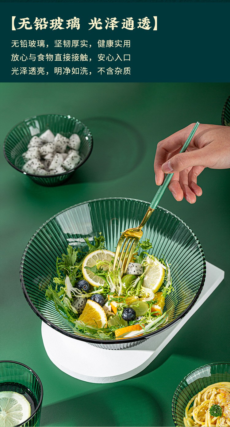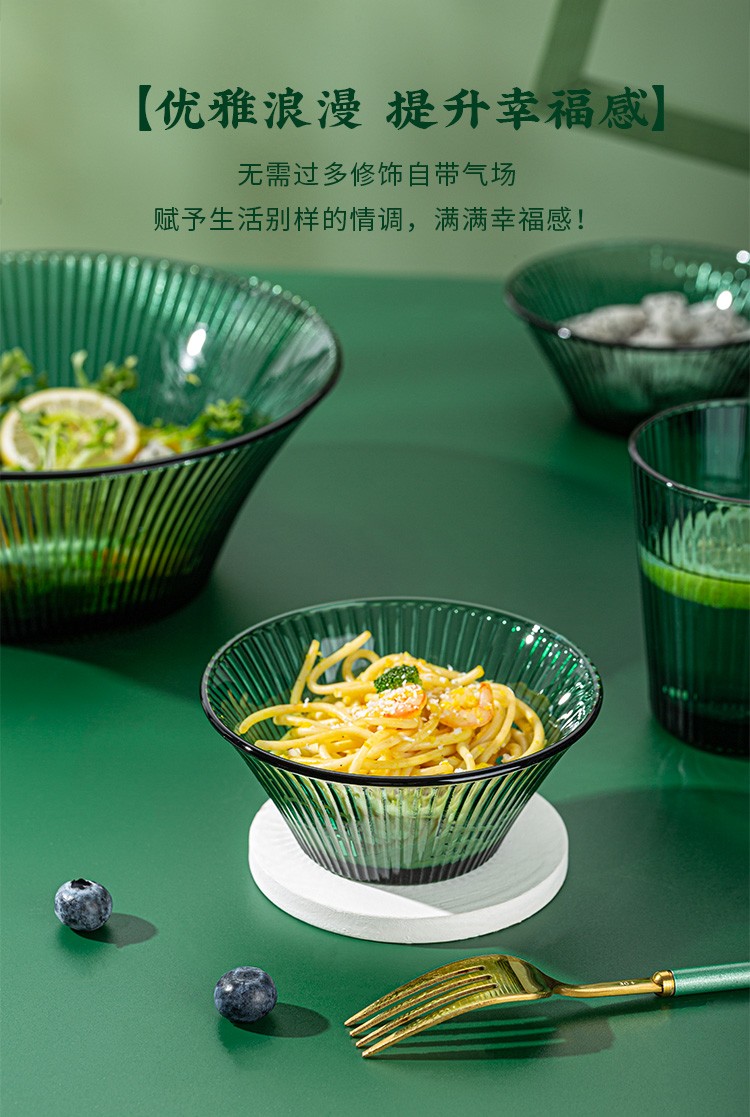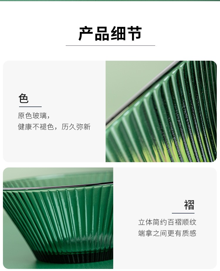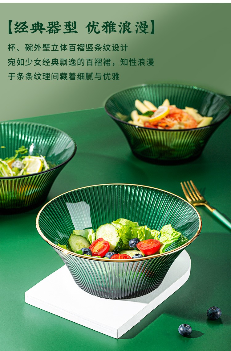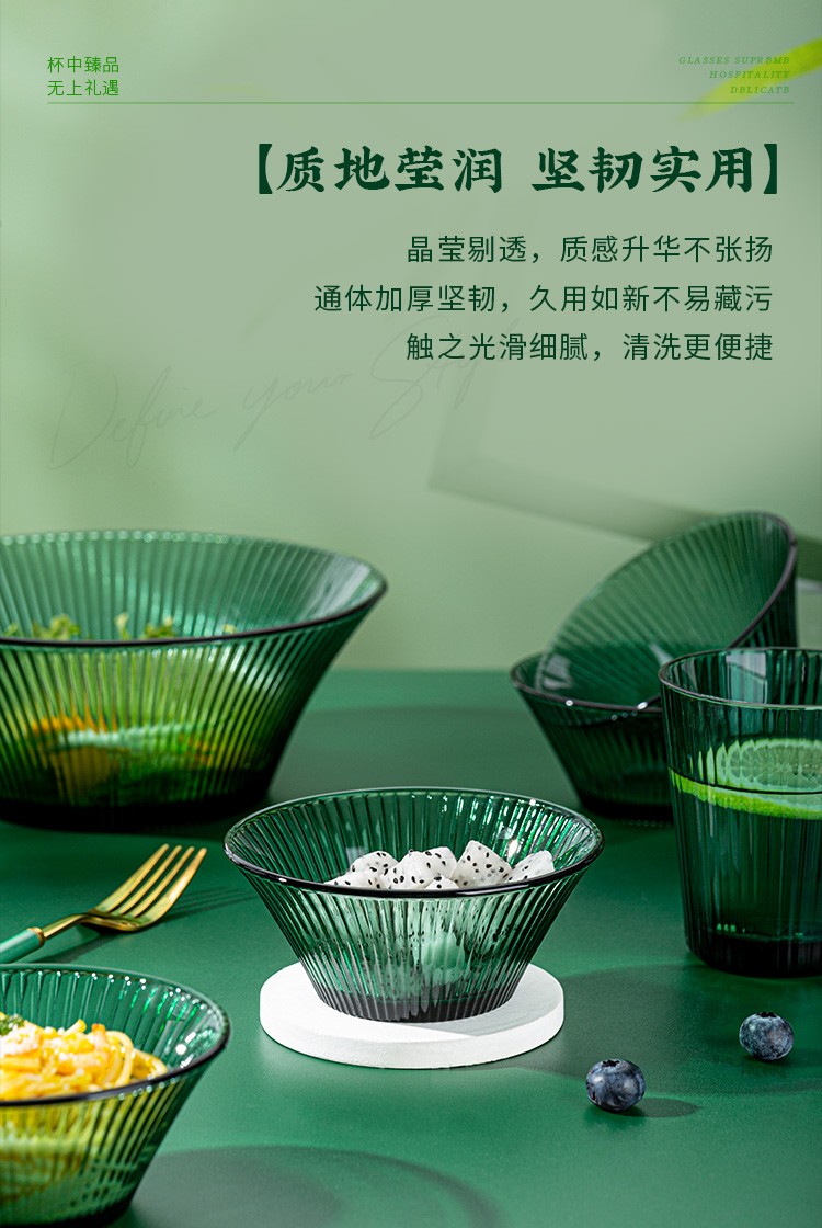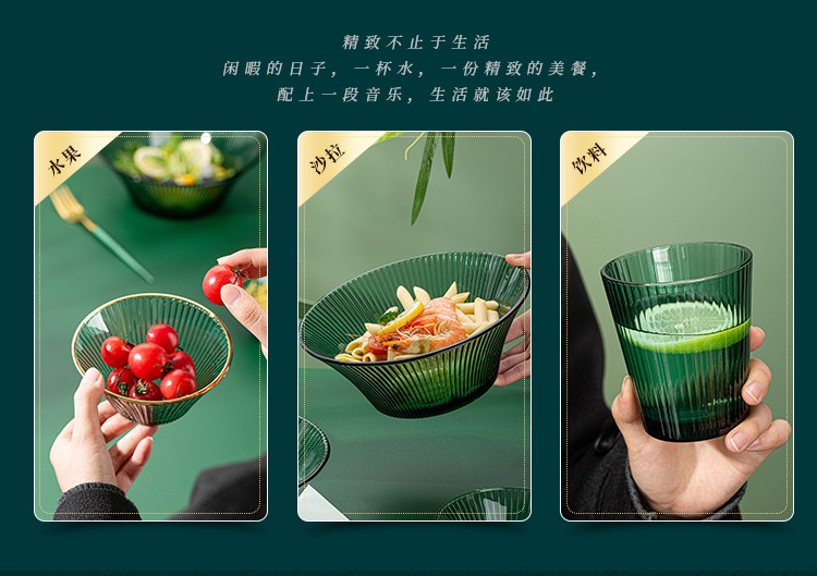 百褶系列祖母绿轻奢北欧风网红餐具套装玻璃水果沙拉小碗家用客厅果汁玻璃杯 289ml碗*2+1469ml碗*1