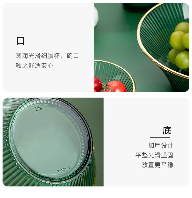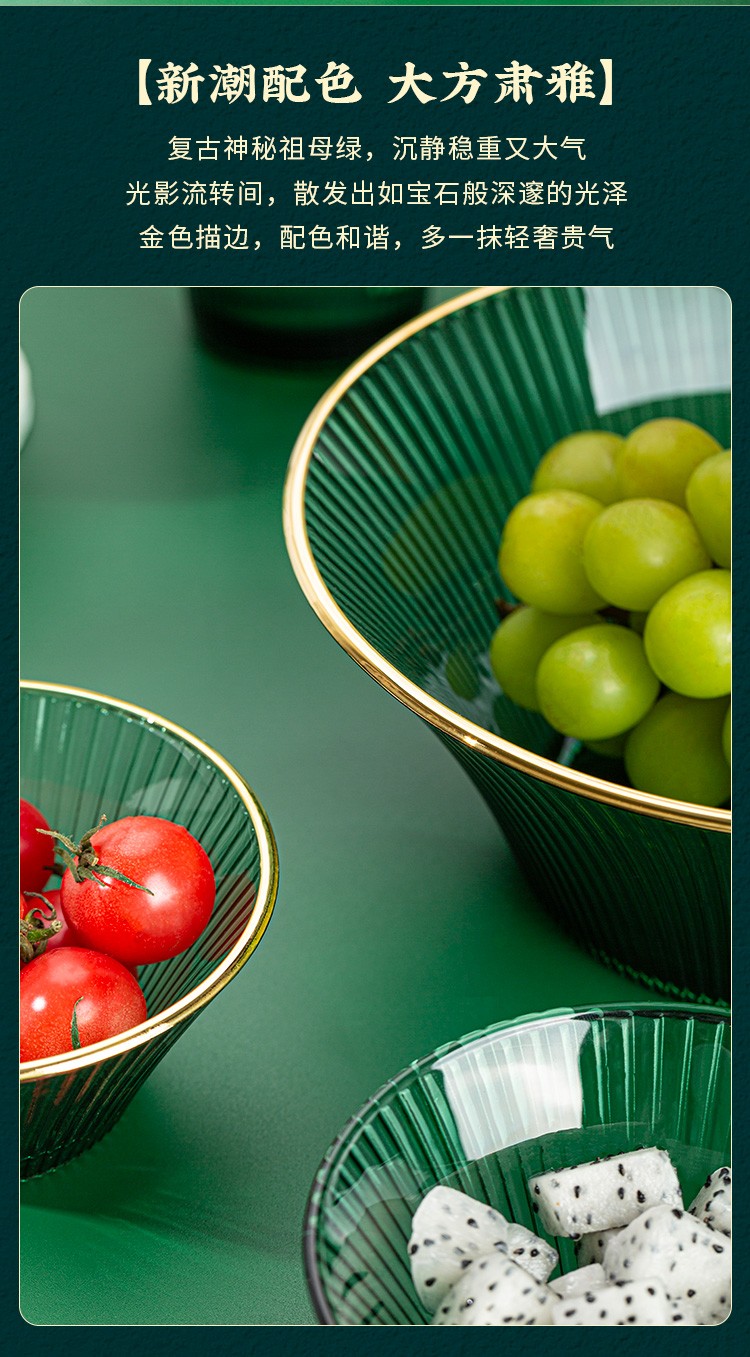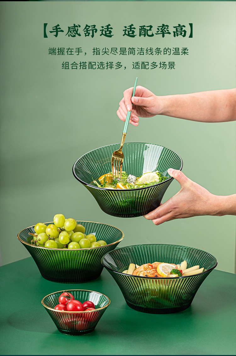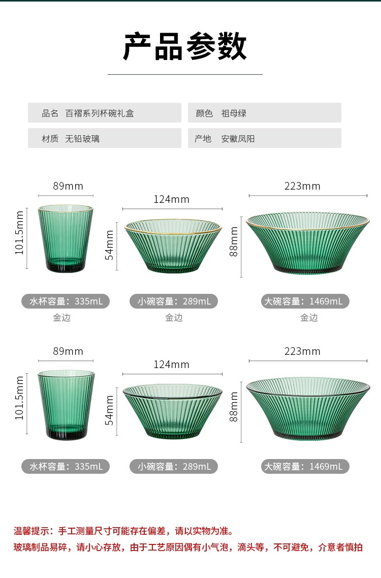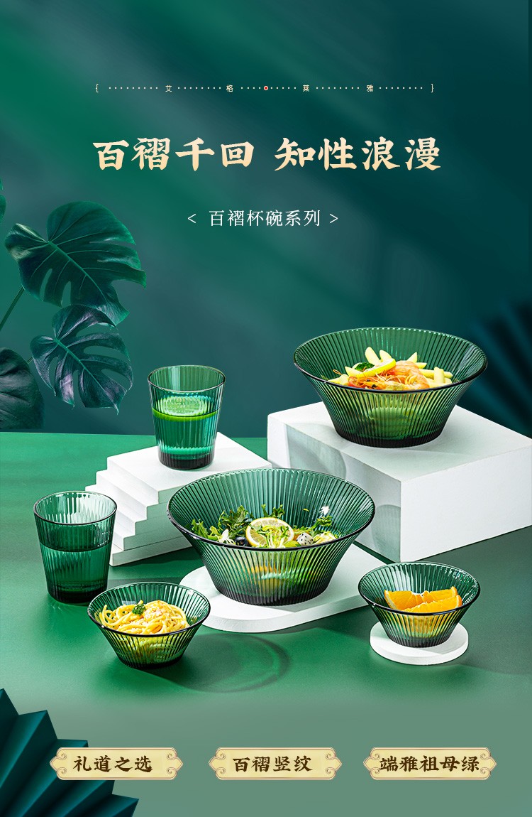 百褶系列祖母绿轻奢北欧风网红餐具套装玻璃水果沙拉小碗家用客厅果汁玻璃杯 289ml碗*2+1469ml碗*1