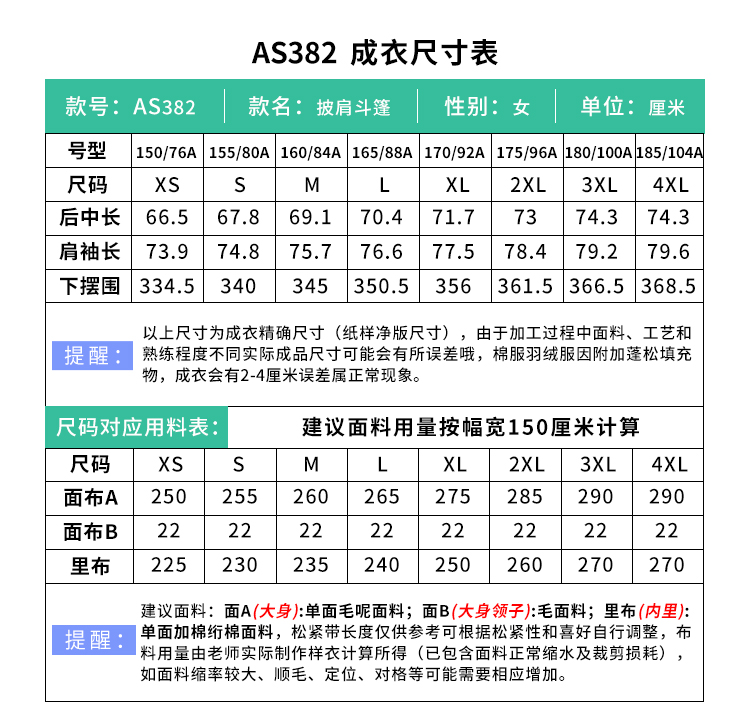 裁缝学苑AS382毛呢子大衣女披风绗棉披肩纸样斗篷复古打版裁剪样板