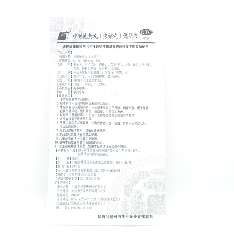 上龙 桂附地黄丸 200丸/盒 温补肾阳 用于腰膝酸软 肢冷尿频