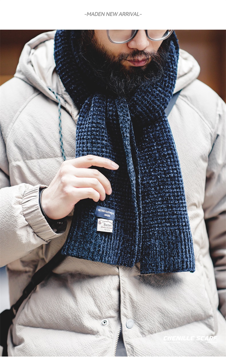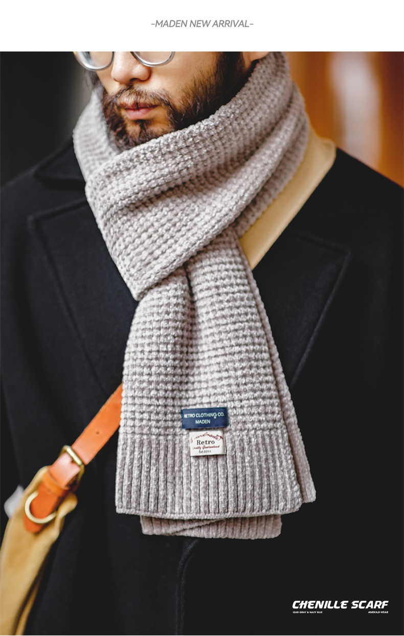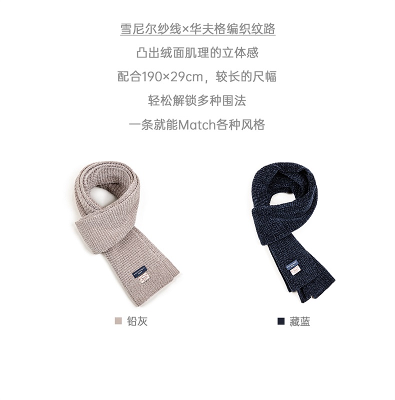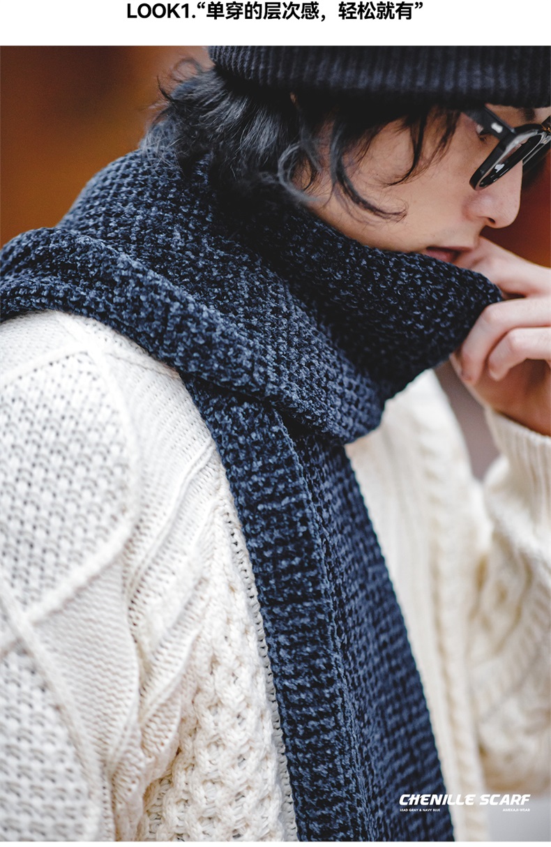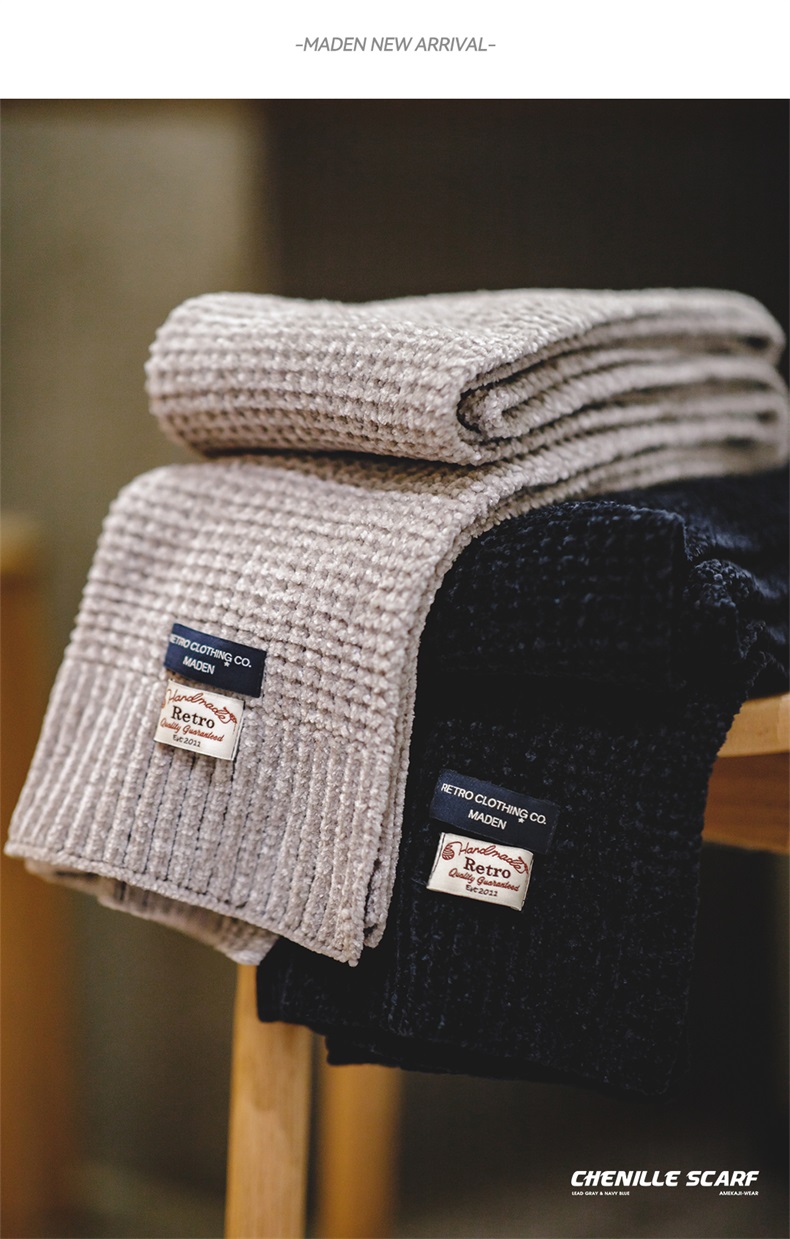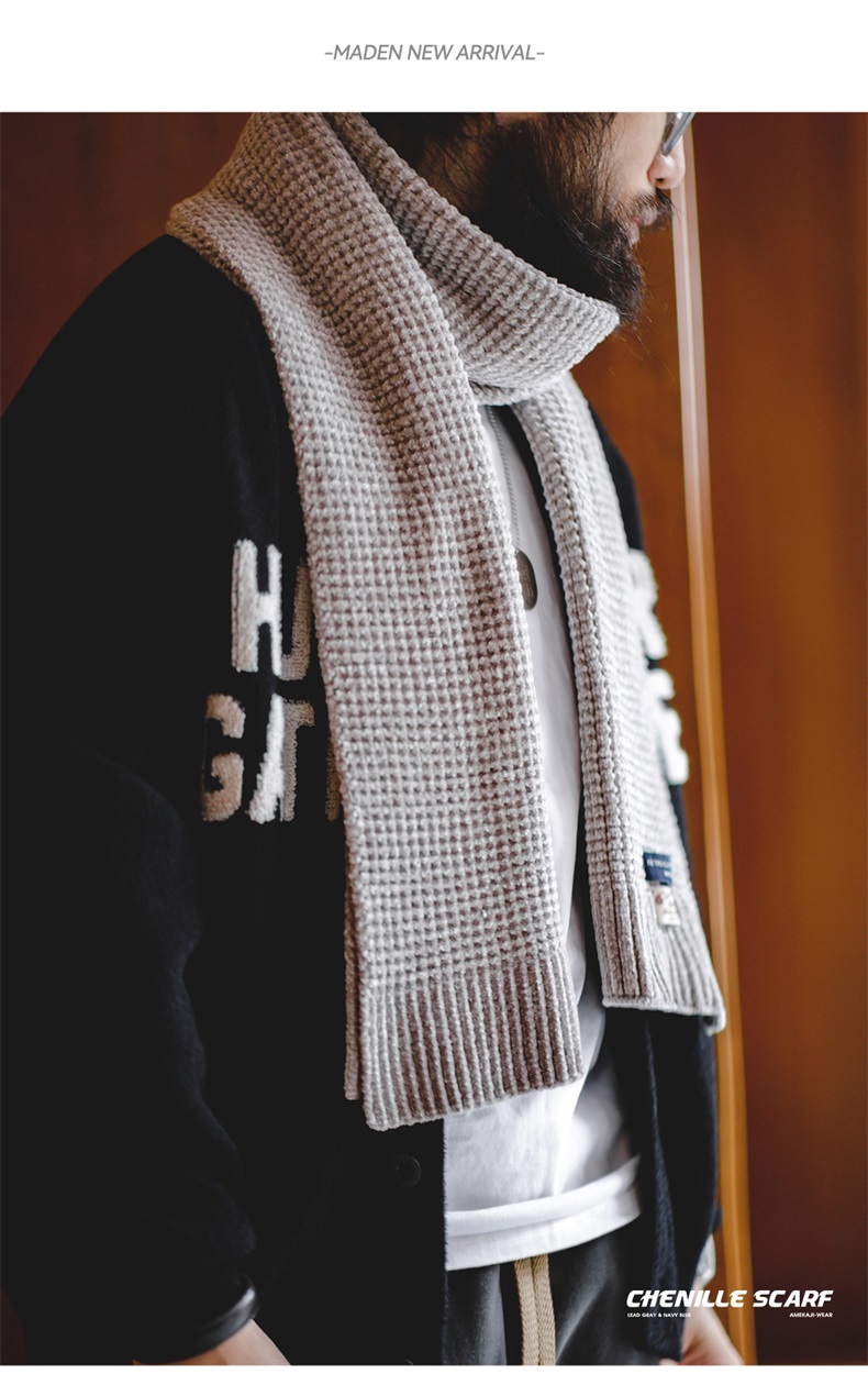 工装优选 美式复古雪尼尔围巾华夫格纯色长款防寒保暖围脖男秋冬