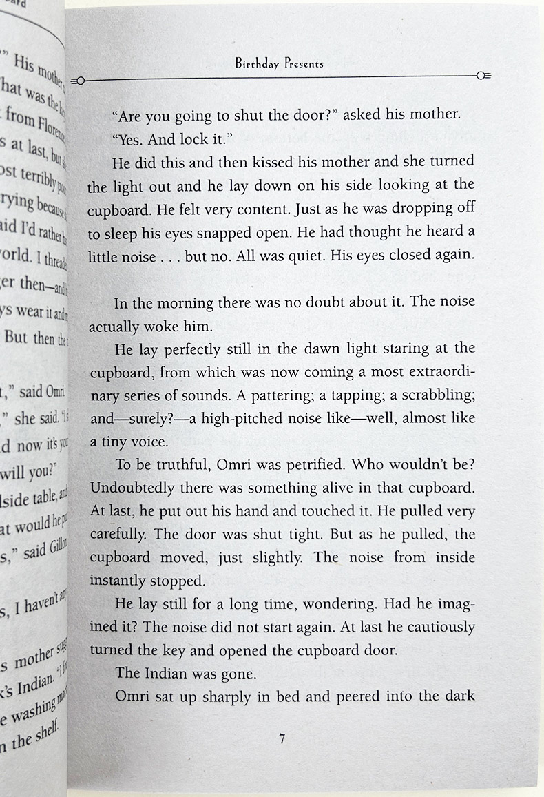 It's Omri's birthday, but all he gets from his best friend, Patrick, is a little plastic Indian brave. Trying to hide his disappointment, Omri puts the Indian in a metal cupboard and locks the door with a mysterious skeleton key that once belonged to his great-grandmother. Little does Omri know that by turning the key, he will transform his ordinary plastic Indian into a real live man from an altogether different time and place! Omri and the tiny warrior called Little Bear could hardly be more different, yet soon the two forge a very special friendship. Will Omri be able to keep Little Bear without anyone finding out and taking his precious Indian from him?