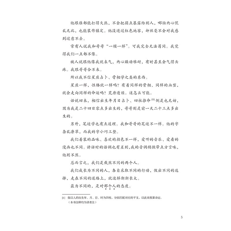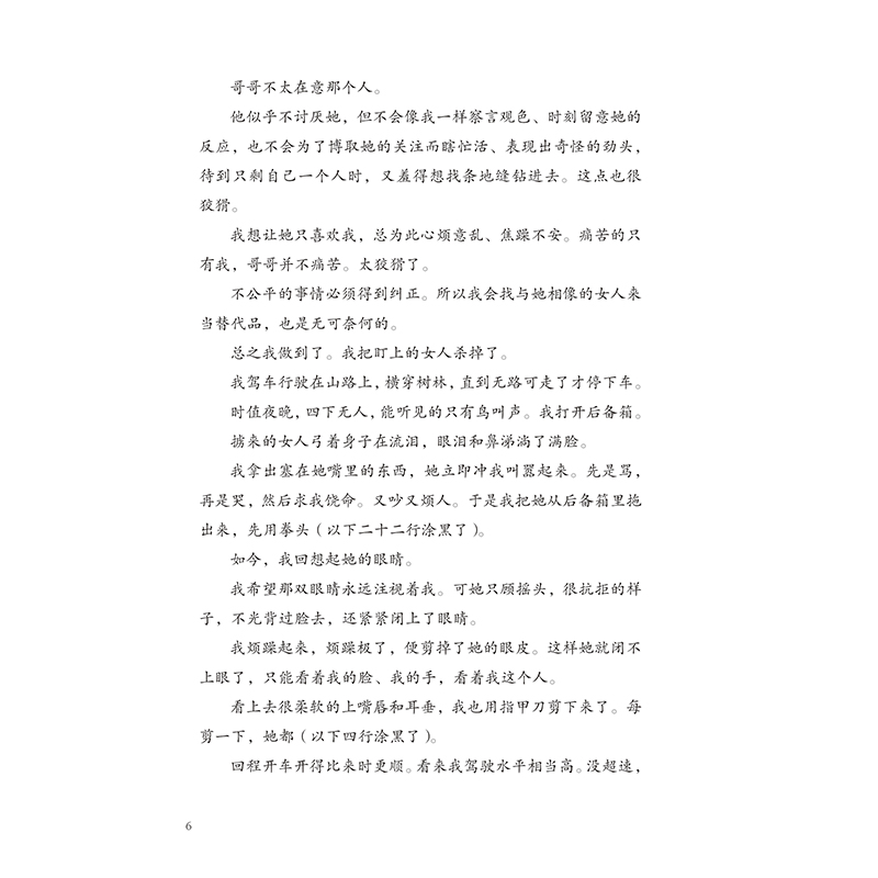 今天,我杀人了。但我觉得这不能怪我。都怪我爸。谁叫他把车钥匙放在那儿不管。没有车就不可能撞到女人,也没法把昏迷的女人塞进后备箱带走。车是自动挡的,我这个没驾照的人也能开,这也是个不利因素。说一千道一万,问题最大的是我爸。我不是随便挑了个人就去袭击的。尽管姓名、身世一概不知,但她是我几乎每天早上都会在车站看到的熟面孔。看服装和发型,八成是学生。我猜是大学生。也可能是落榜生或者专科生。总之,我经常看见她。我并不是怀着杀意观察她的,反倒是想跟她混熟。因为她很像那个人。不是容貌本身,而是整个人的气质与感觉相似。但我也明白,我无法跟她变得要好。我不擅长和女孩打交道。我嘴笨,不懂取悦女孩的方法,也不会温柔待人。待在女孩身边,只会徒增尴尬。哥哥就不这样。太狡猾了。与我不同,哥哥很擅长应对女孩。他交女朋友,也交女性朋友,隔三岔五约会、跟女孩单独去看电影。哥哥就是这么个人。总把我抛在身后的狡猾家伙。他跟谁都能打得火热,不会把弱点暴露给别人,哪怕内心慌乱无比,也能装作镇定。他没进过红色地窖,却丝毫不会对我感到过意不去。常有人说我和哥哥;一模一样。可我完全无法苟同。我觉得我们一点都不像。被人说跟他像我就来气,内心躁动难耐,有时甚至会气得头疼。我跟哥哥合不来。所以我不信星座占卜、骨相学之类的东西。星座一样,性格就一样吗?有着同样的骨相、同样的血型,就会走向同样的命运吗?荒唐透顶。这怎么可能。话说回来,相信出生年月日占卜、四柱推命 [1] 倒是也无妨,因为我是二十四日零点多出生的,哥哥则是前一天二十三点多出生的。另外,笔迹学也有点道理。我和哥哥的笔迹不一样。他的字杂乱潦草,而我的字小巧工整。我们着装的品味、喜欢的颜色不一样,爱听的音乐、爱看的漫画也不同。讲话时的语调也有差别,我的音调稍微带点方言味,他则不然。总而言之,我们是截然不同的两个人。我们成长为不同的人,各自采取不同的行动,做出不同的选择,走在不同的道路上,就这样渐渐长大。最为不同的,是对那个人的态度。[1] 指以人的出生年、月、日、时为四柱,分别匹配对应的干支,以此来推算命运。(本书注释均为译者注)哥哥不太在意那个人。他似乎不讨厌她,但不会像我一样察言观色、时刻留意她的反应,也不会为了博取她的关注而瞎忙活、表现出奇怪的劲头,待到只剩自己一个人时,又羞得想找条地缝钻进去。这点也很狡猾。我想让她只喜欢我,总为此心烦意乱、焦躁不安。痛苦的只有我,哥哥并不痛苦。太狡猾了。不公平的事情必须得到纠正。所以我会找与她相像的女人来当替代品,也是无可奈何的。总之我做到了。我把盯上的女人杀掉了。我驾车行驶在山路上,横穿树林,直到无路可走了才停下车。时值夜晚,四下无人,能听见的只有鸟叫声。我打开后备箱。掳来的女人弓着身子在流泪,眼泪和鼻涕淌了满脸。我拿出塞在她嘴里的东西,她立即冲我叫嚣起来。先是骂,再是哭,然后求我饶命。又吵又烦人。于是我把她从后备箱里拖出来,先用拳头(以下二十二行涂黑了)。如今,我回想起她的眼睛。我希望那双眼睛永远注视着我。可她只顾摇头,很抗拒的样子,不光背过脸去,还紧紧闭上了眼睛。我烦躁起来,烦躁极了,便剪掉了她的眼皮。这样她就闭不上眼了,只能看着我的脸、我的手,看着我这个人。