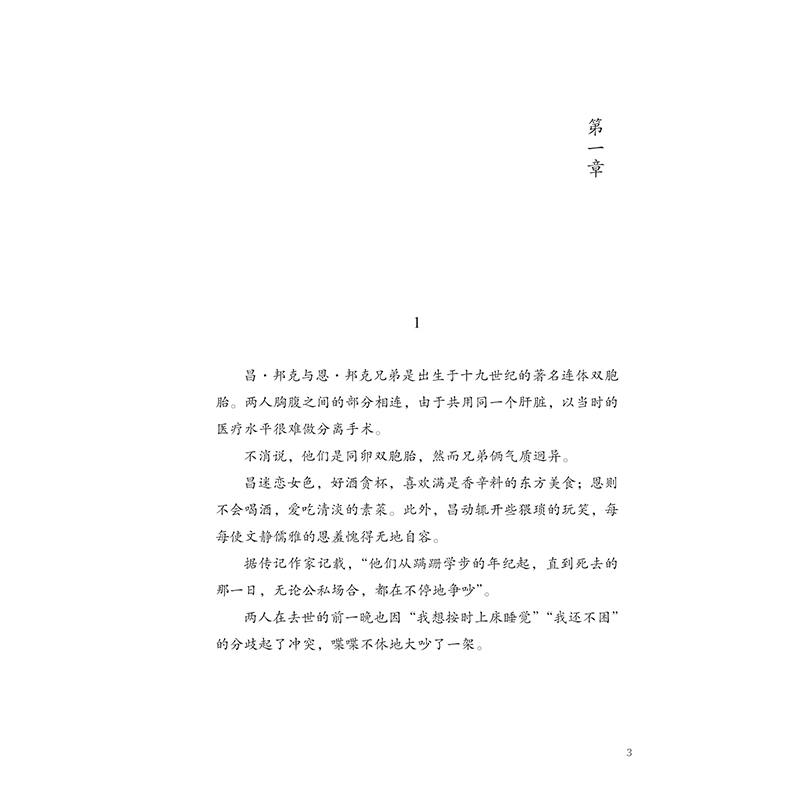 昌邦克与恩邦克兄弟是出生于十九世纪的著名连体双胞胎。两人胸腹之间的部分相连,由于共用同一个肝脏,以当时的医疗水平很难做分离手术。不消说,他们是同卵双胞胎,然而兄弟俩气质迥异。昌迷恋女色,好酒贪杯,喜欢满是香辛料的东方美食;恩则不会喝酒,爱吃清淡的素菜。此外,昌动辄开些猥琐的玩笑,每每使文静儒雅的恩羞愧得无地自容。据传记作家记载,;他们从蹒跚学步的年纪起,直到死去的那一日,无论公私场合,都在不停地争吵。两人在去世的前一晚也因;我想按时上床睡觉;我还不困的分歧起了冲突,喋喋不休地大吵了一架。