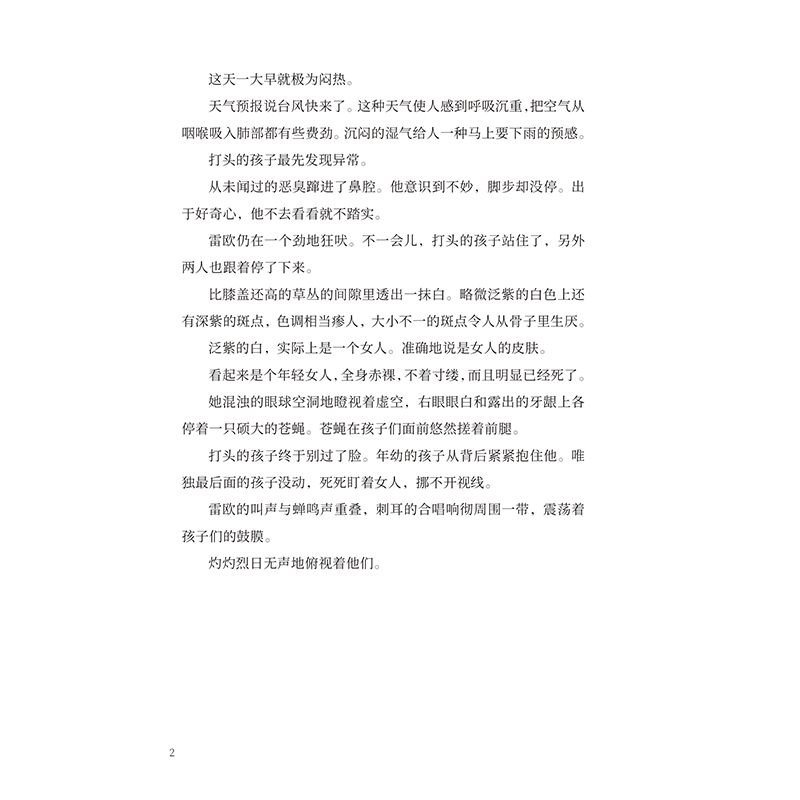 发现尸体的,是在树林里玩耍的三个孩子。那是暑假的最后一天。起因是其中最年幼的孩子听见了猛烈的狗叫声。;雷欧在这附近。雷欧是当地很有名的狗。这只宠物狗之所以出名,并非因为它被养在乡下少见的洋馆里,而是因为它有爱乱跑的毛病。不知是它太瘦还是项圈太松的缘故,它经常自己挣脱项圈,翻过栅栏跑得没影。雷欧在树林深处疯狂吼叫着。听见雷欧的叫声,年幼的孩子本能地感到害怕,便折回来喊年长的两人。;快,快过来。雷欧雷欧它;怎么了?年长的孩子一人在玩遥控直升机,另一人正忙着采集昆虫。;别问了,快来。年幼的孩子催促道。年长的两个孩子不情不愿地停止玩耍,循着雷欧的叫声走去。他们走过蜜蜂嗡鸣的花丛,拨开高高的杂草前进。这天一大早就极为闷热。天气预报说台风快来了。这种天气使人感到呼吸沉重,把空气从咽喉吸入肺部都有些费劲。沉闷的湿气给人一种马上要下雨的预感。打头的孩子最先发现异常。从未闻过的恶臭蹿进了鼻腔。他意识到不妙,脚步却没停。出于好奇心,他不去看看就不踏实。雷欧仍在一个劲地狂吠。不一会儿,打头的孩子站住了,另外两人也跟着停了下来。比膝盖还高的草丛的间隙里透出一抹白。略微泛紫的白色上还有深紫的斑点,色调相当瘆人,大小不一的斑点令人从骨子里生厌。泛紫的白,实际上是一个女人。准确地说是女人的皮肤。看起来是个年轻女人,全身赤裸,不着寸缕,而且明显已经死了。她混浊的眼球空洞地瞪视着虚空,右眼眼白和露出的牙龈上各停着一只硕大的苍蝇。苍蝇在孩子们面前悠然搓着前腿。打头的孩子终于别过了脸。年幼的孩子从背后紧紧抱住他。唯独最后面的孩子没动,死死盯着女人,挪不开视线。雷欧的叫声与蝉鸣声重叠,刺耳的合唱响彻周围一带,震荡着孩子们的鼓膜。灼灼烈日无声地俯视着他们。