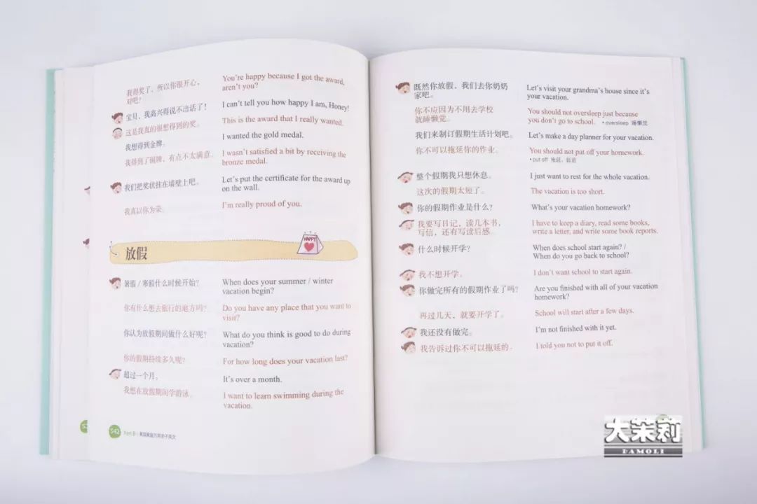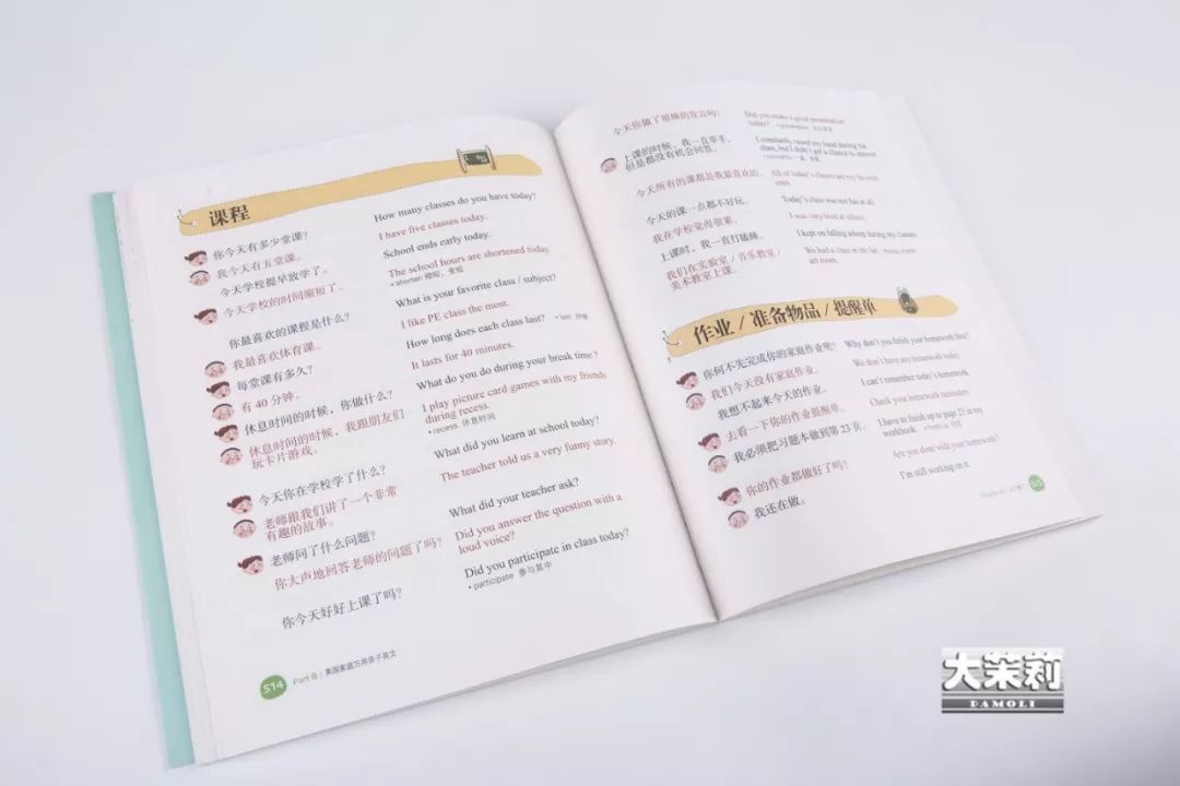 总而言之,这套书的8000句英文涵盖了46种生活场景、377种情境的日常对话,甚至可以说这是一本亲子英文的万用工具书,每一页都是高频率词汇集锦。