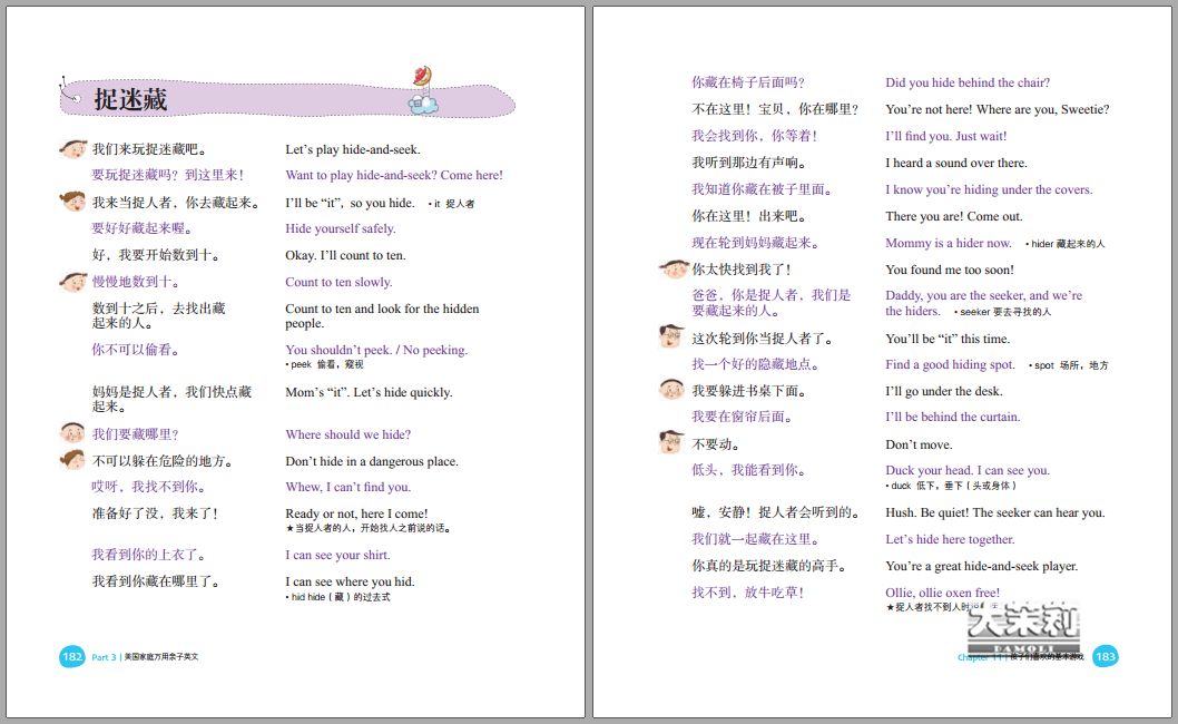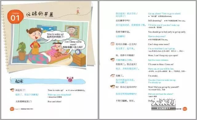 这本书就是以美国家庭为学习对象,将美国家庭中所有的情况全都整理在一起,孩子不仅可以学到字正腔圆、纯正地道的英文,还有各种美国文化的描述解说,家长在慢慢教孩子学习语言的同时,还能渗透给孩子原汁原味的美国文化和最真实的美国家庭的种种生活习惯。