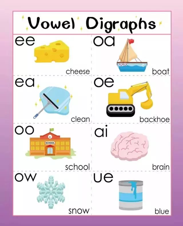 Vowel Digraphs(复合元音表),指两个元音字母组成但只发一个音,表格中列出的是最常见的一些组合。