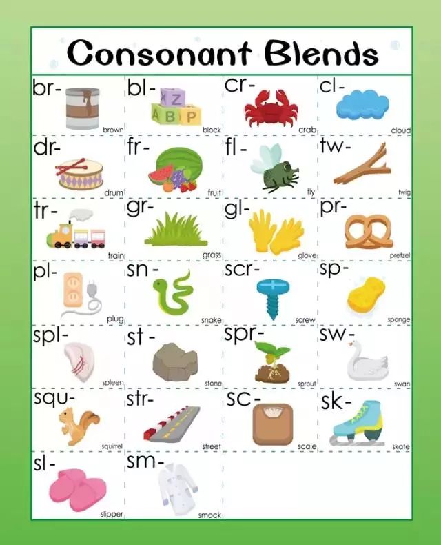 Consonant Blends(辅音连读),此表列的是常见的辅音连读组合,两个字母都发音,但需要连读。
