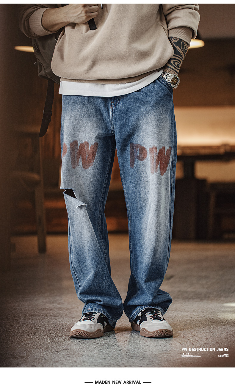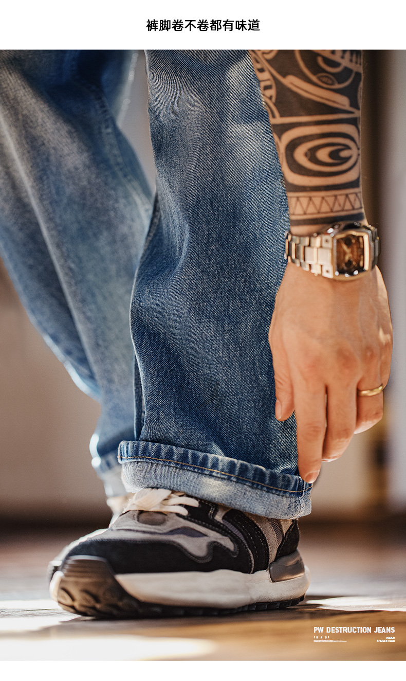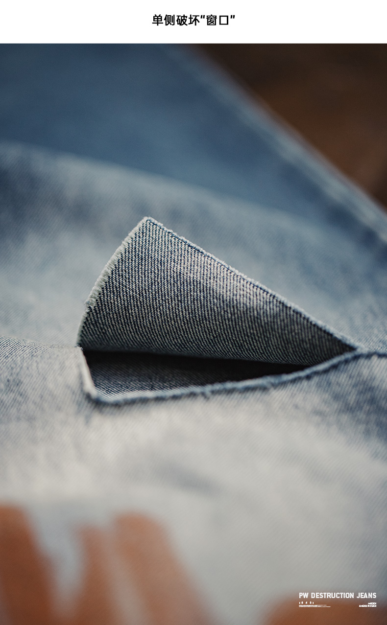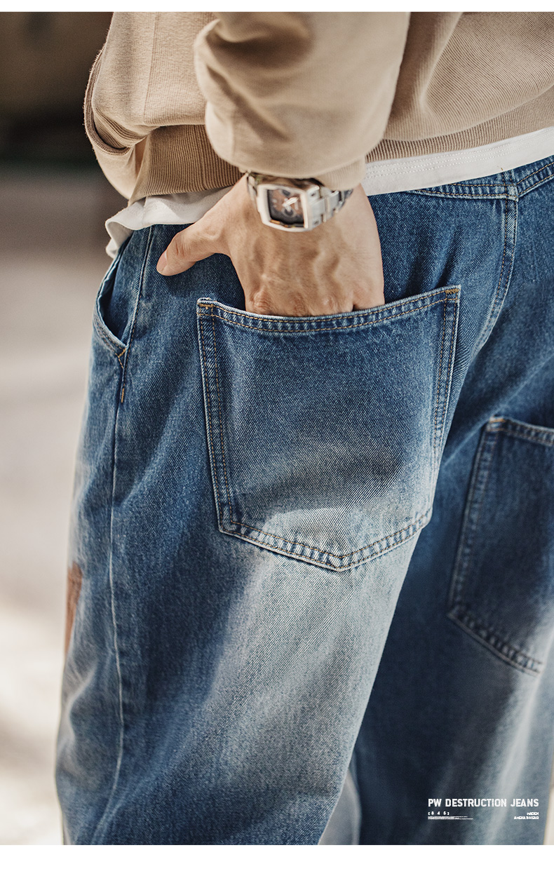 工装优选 美式复古磨白破坏牛仔裤vibe破洞水洗丹宁宽松直筒裤男秋
