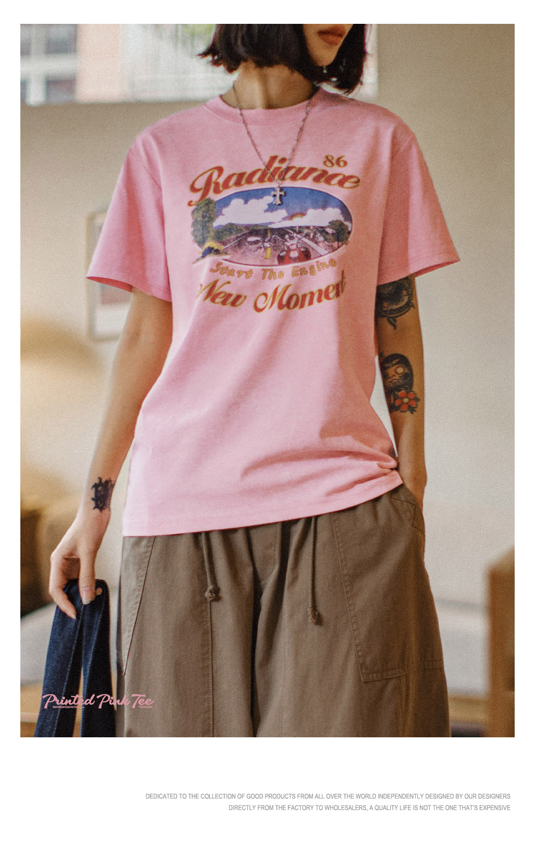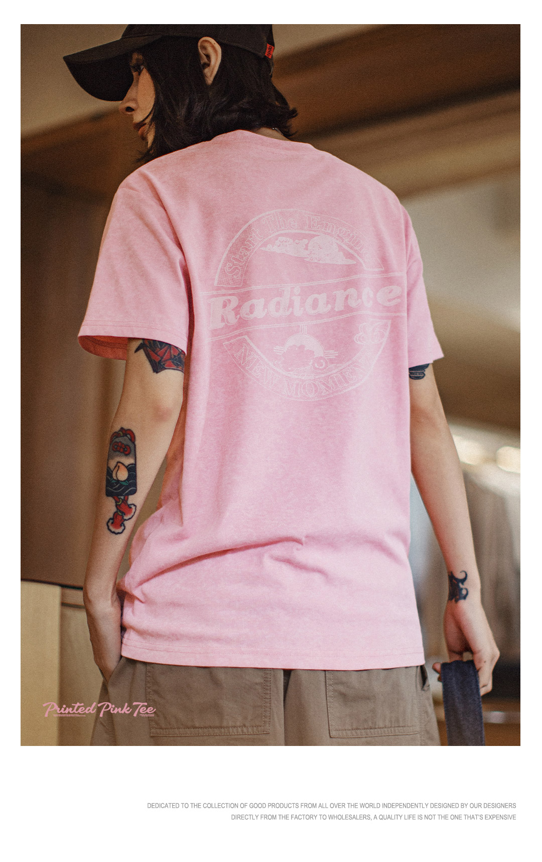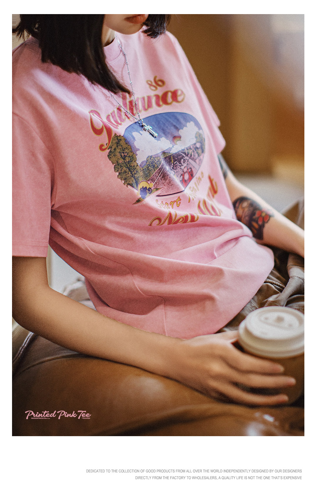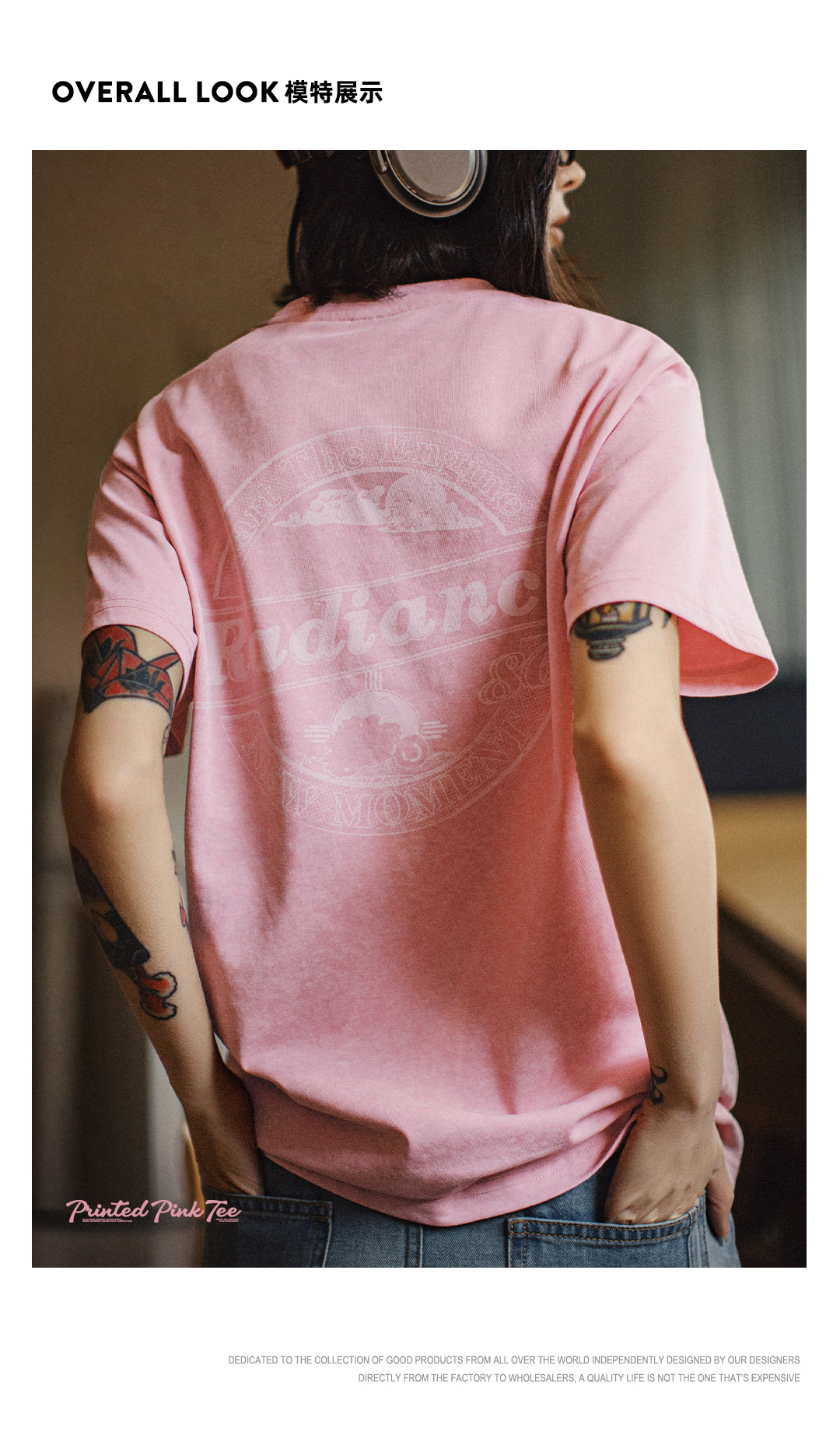 马登夏日仿蜡染粉色印花短袖美式复古机车慵懒显瘦遮肉落肩T恤女