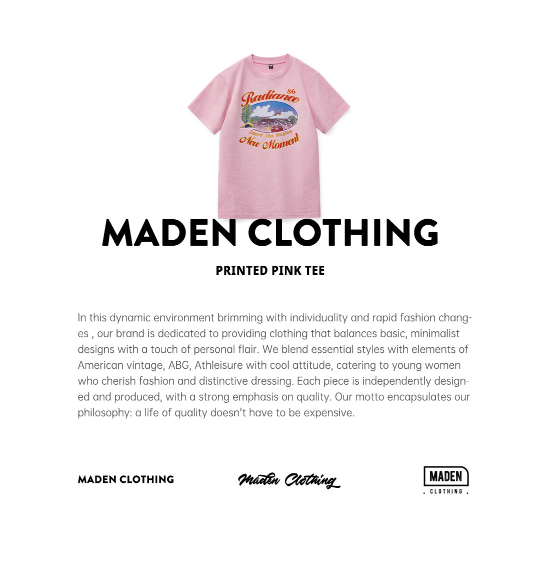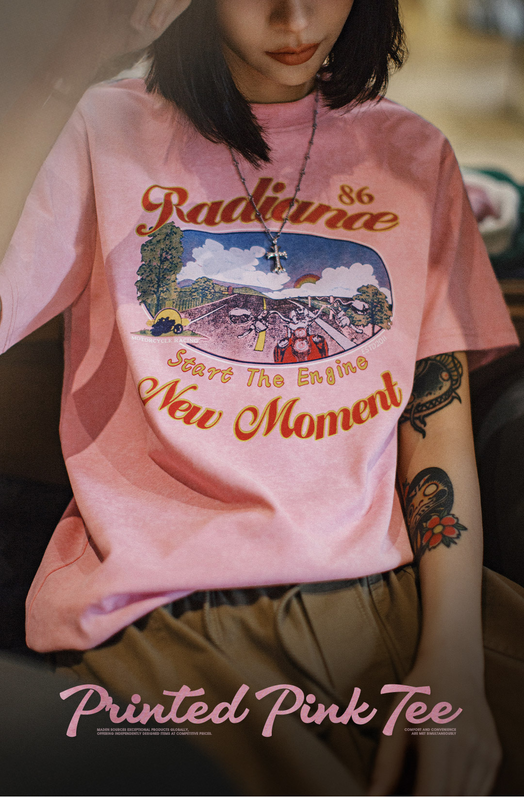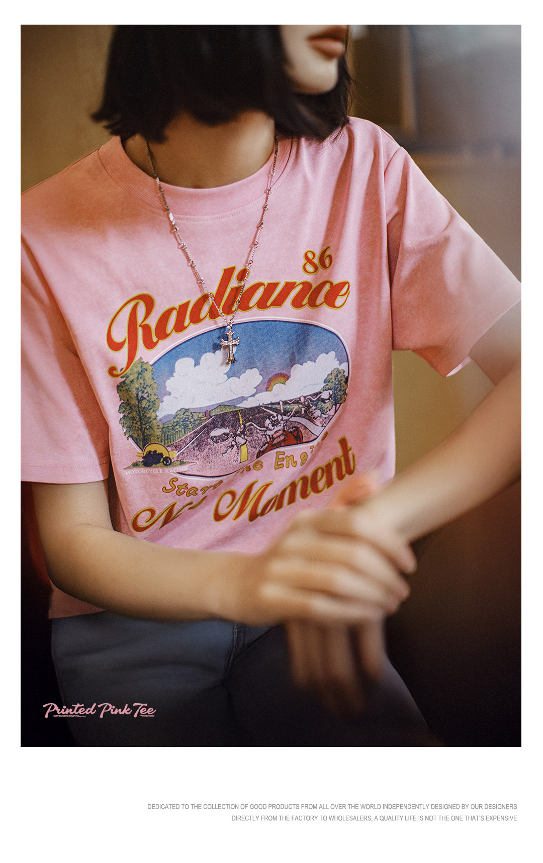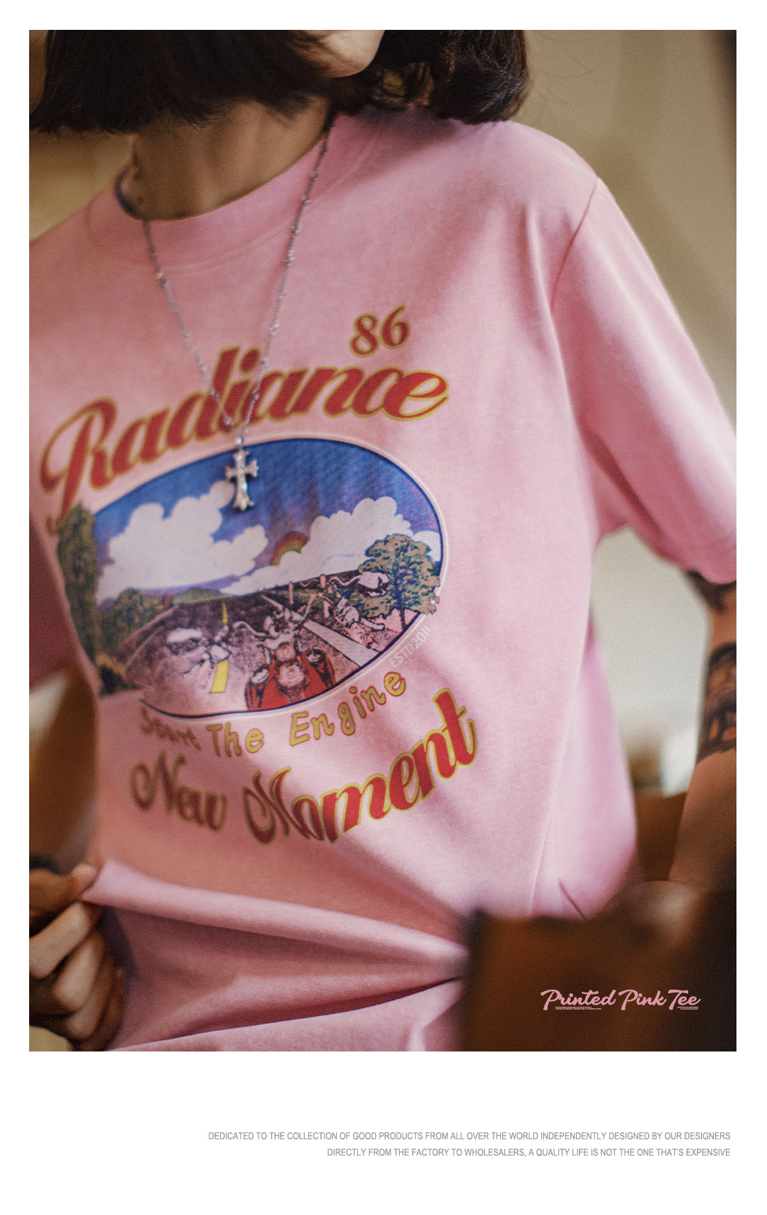 马登夏日仿蜡染粉色印花短袖美式复古机车慵懒显瘦遮肉落肩T恤女