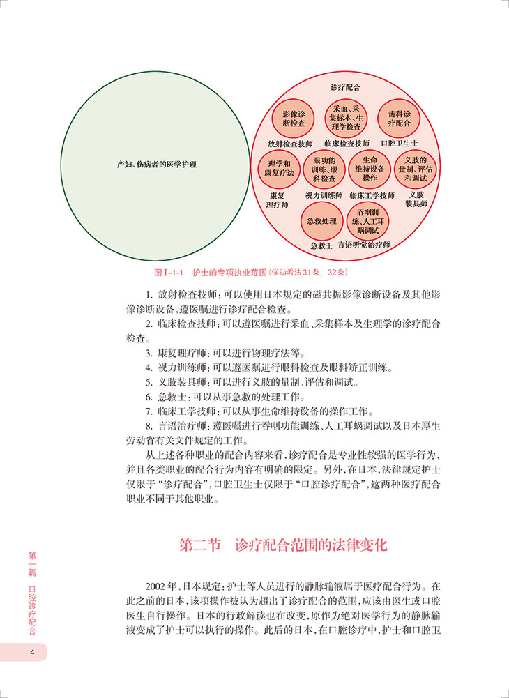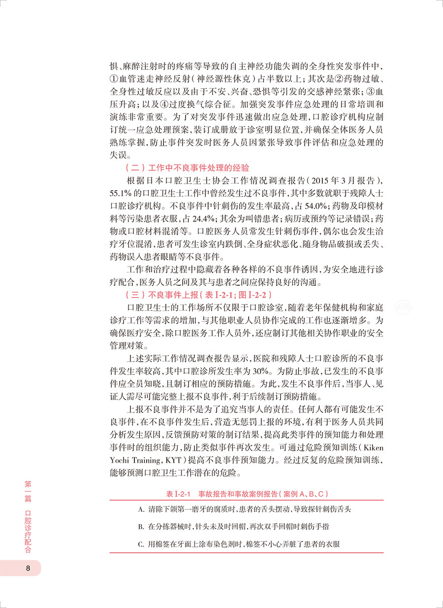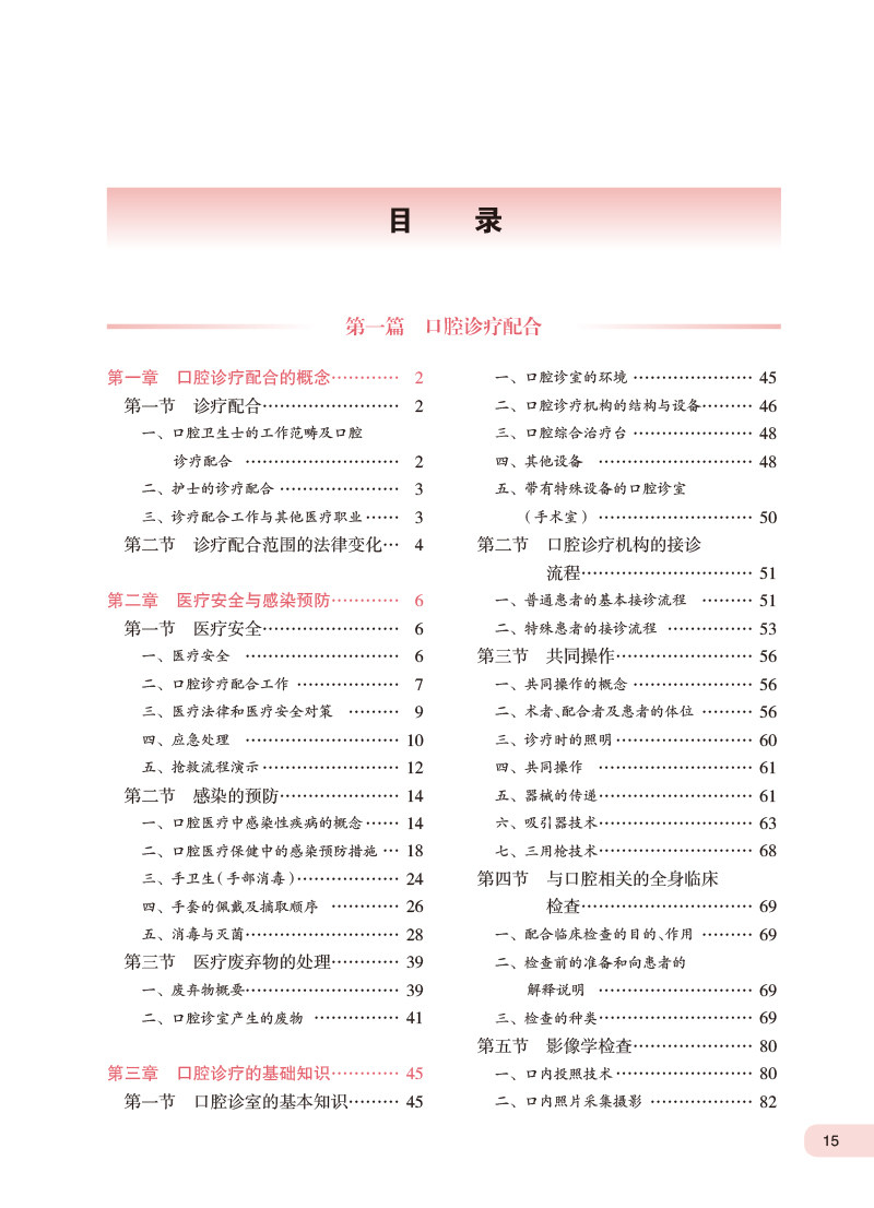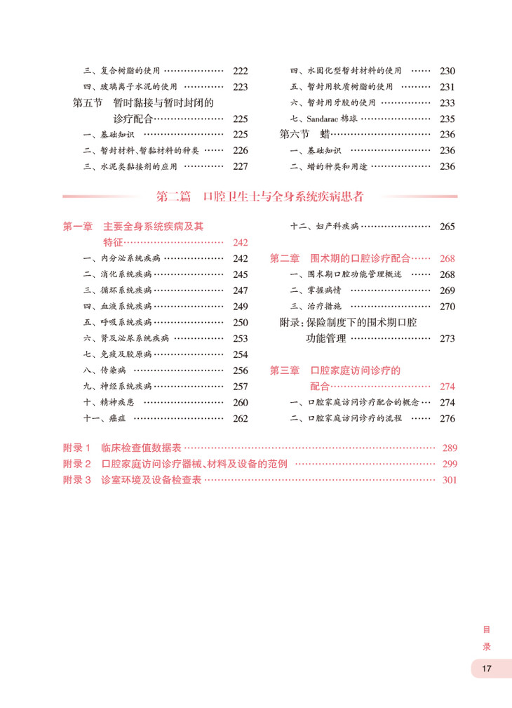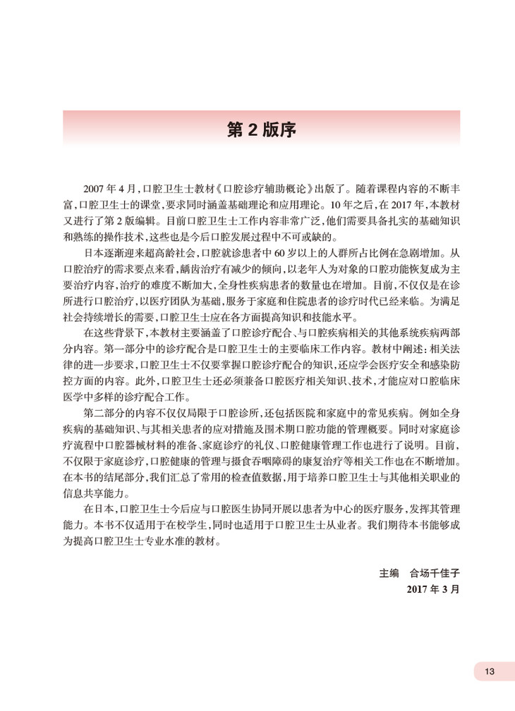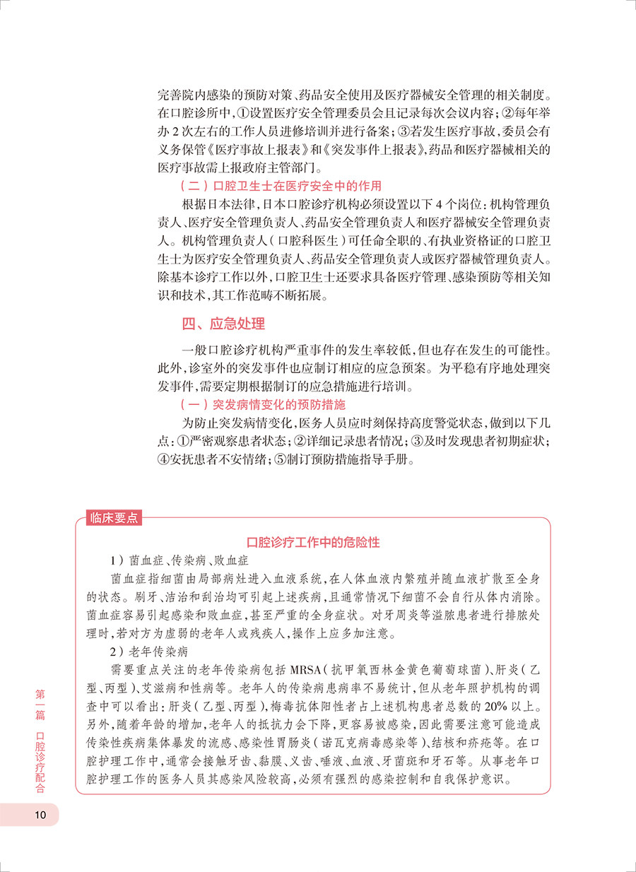 本书是日本齿科卫生士培养系列教材中的一本,是培养日本齿科卫生士普遍使用的教材,内容组织更灵活,与口腔护士的工作内容也能贴合,是非常优秀的专科培训教材。全书分两篇,第一篇详细介绍了齿科卫生士的概念、职责内容、感染预防、诊疗辅助的具体内容等;第二篇主要介绍全身各系统的疾病及围手术期的诊疗辅助等。全书兼顾了专业性及实用性,图、表、数据丰富,利于初学者理解掌握。每章附带对生僻内容注释的笔记栏以及操作要点的提示,有助于拓展读者的知识面,引导读者专注于关键点,提高读者的思维能力。