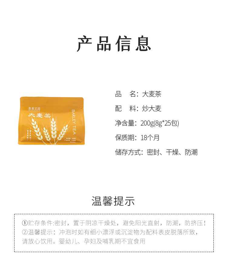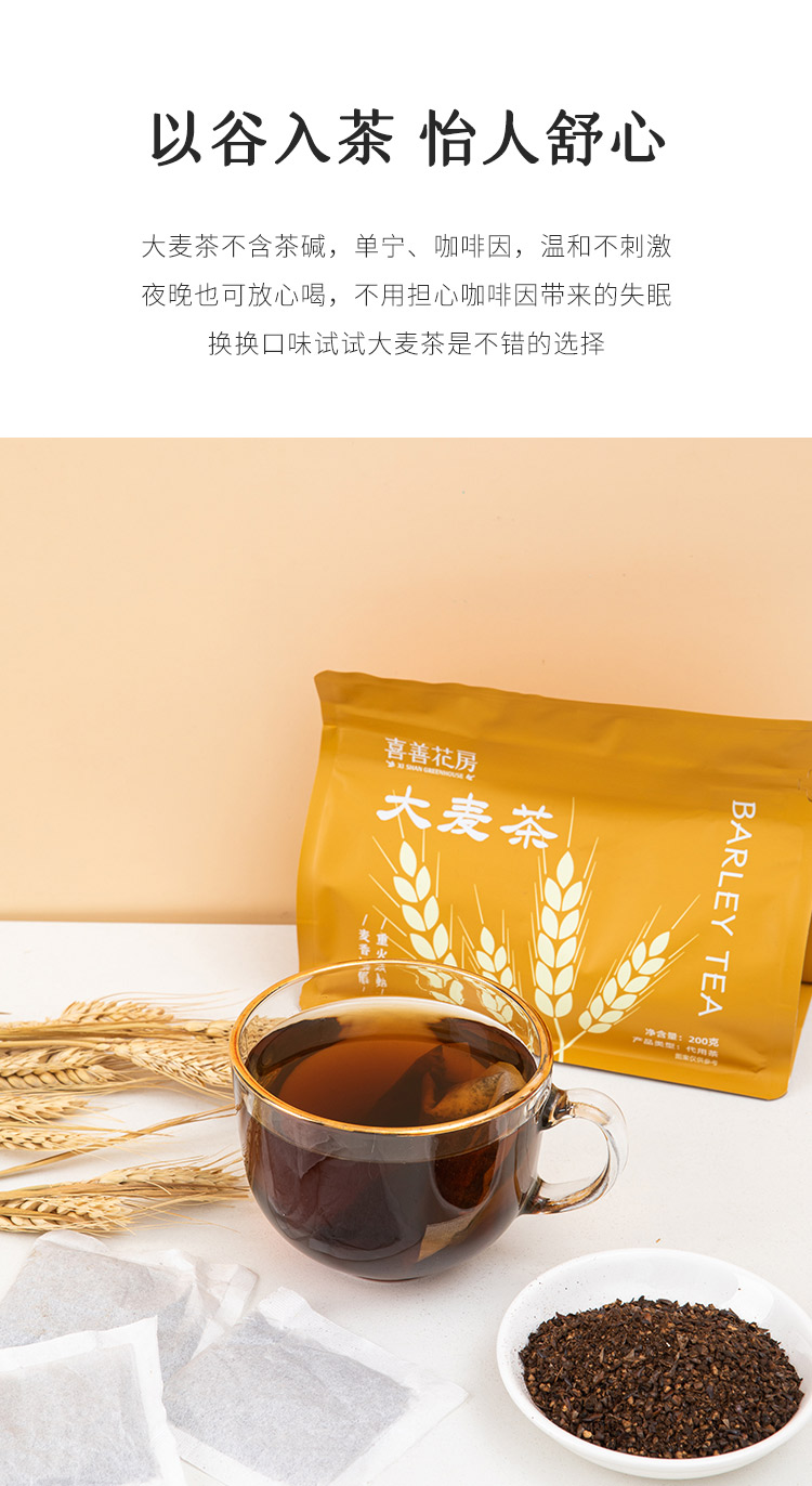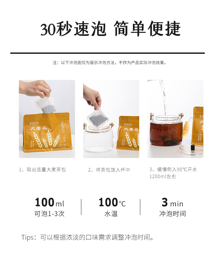 使用方法: 1.取出适量大麦茶包;2.将茶包放入杯中;3.缓慢倒入开水。