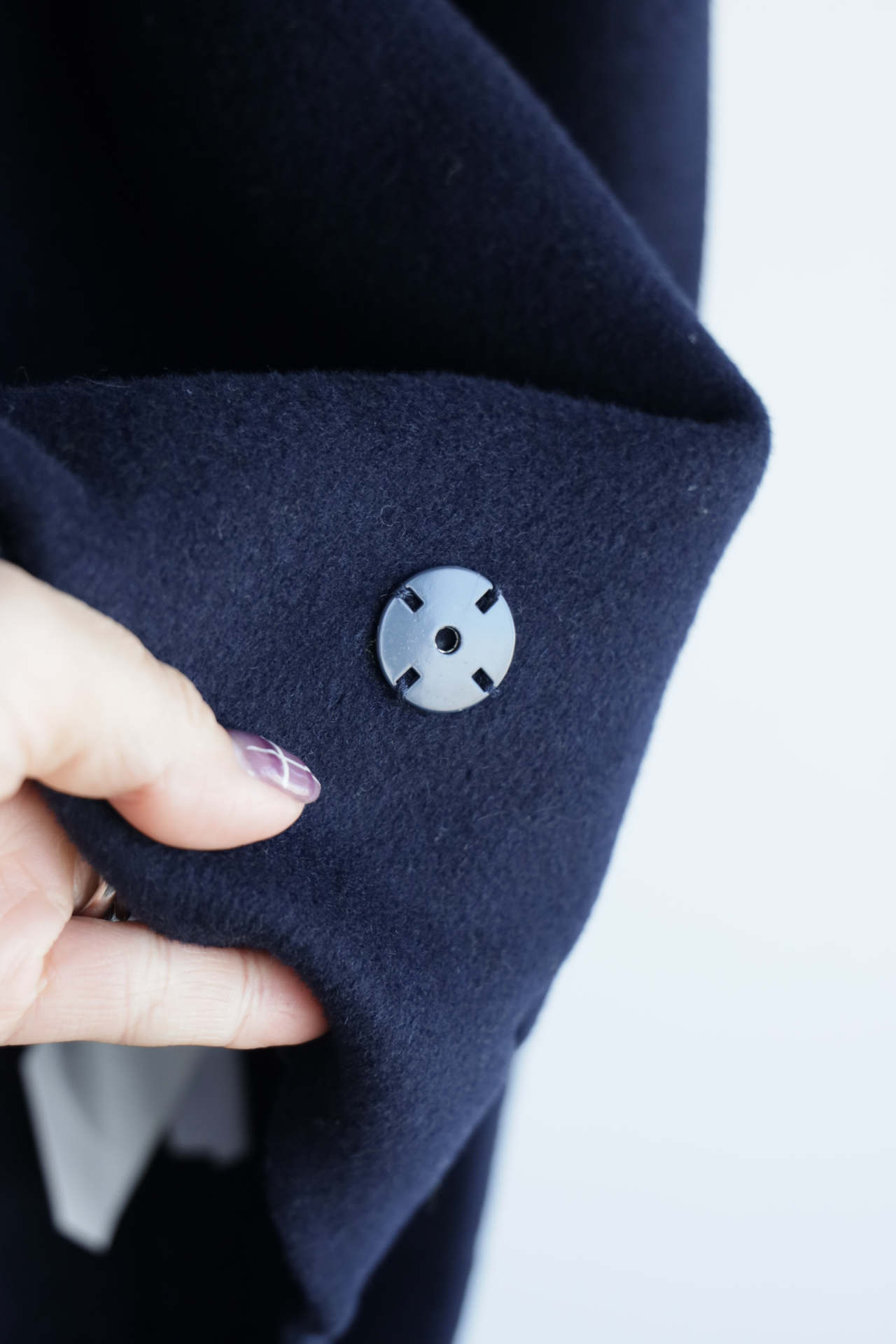 超大翻领,隐形双排扣,双侧大口袋,配以立体裁剪的廓形设计,每个细节都充斥着时髦洋气
