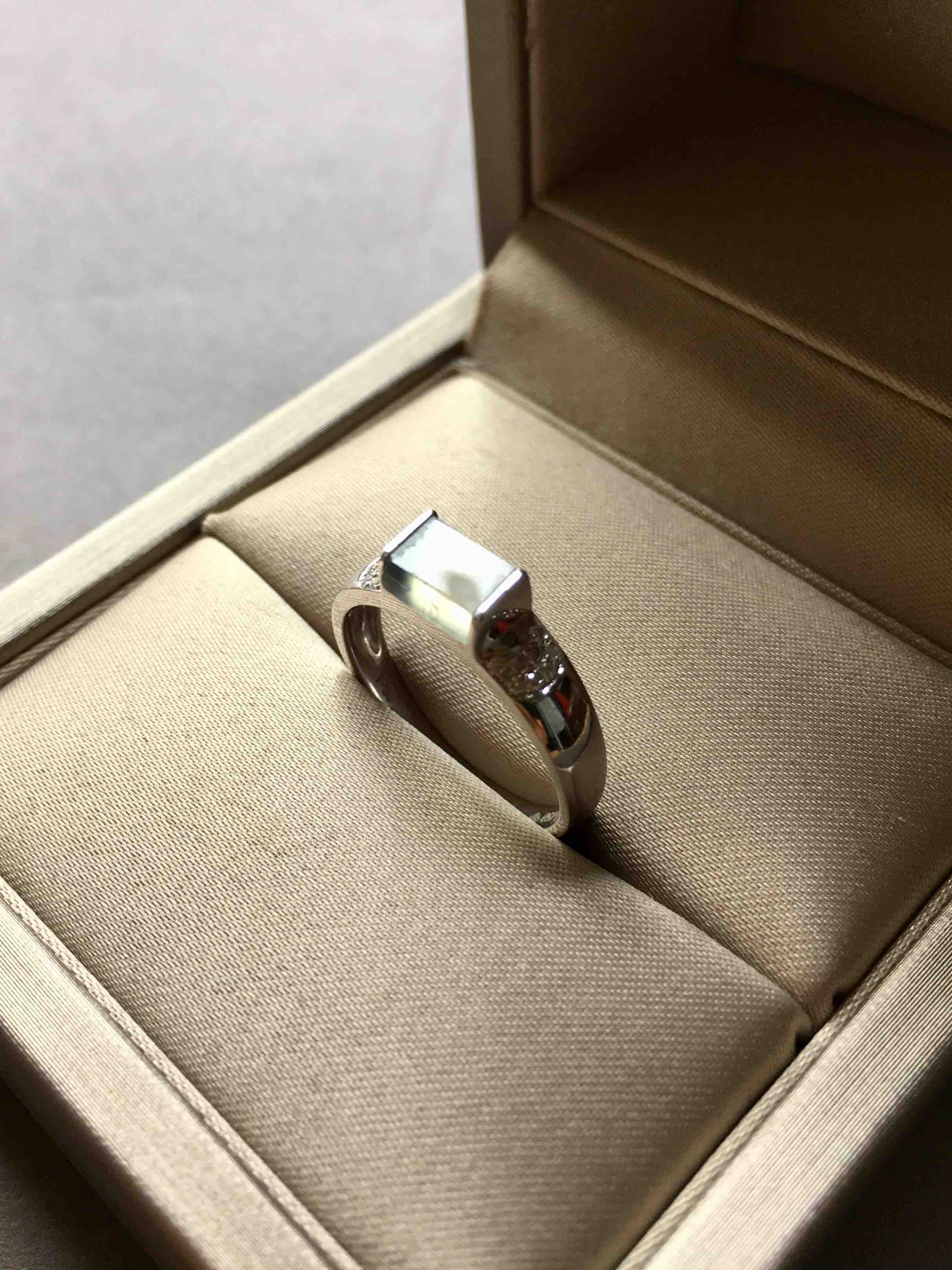 好特别,玻璃种飘花翡翠戒指,戒面6.1×4.6×2.6mm,方形的戒面,棱角分明,荧光四射的种水强刚性表现,18k白金钻石镶嵌,款式时尚简约,上手效果干练,非常特别,只要小四价位,推荐,圈号13,可改大小