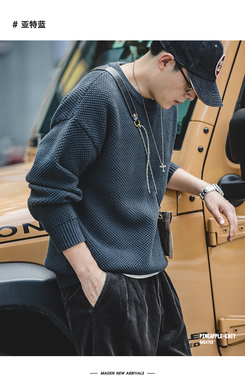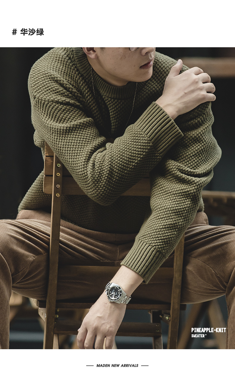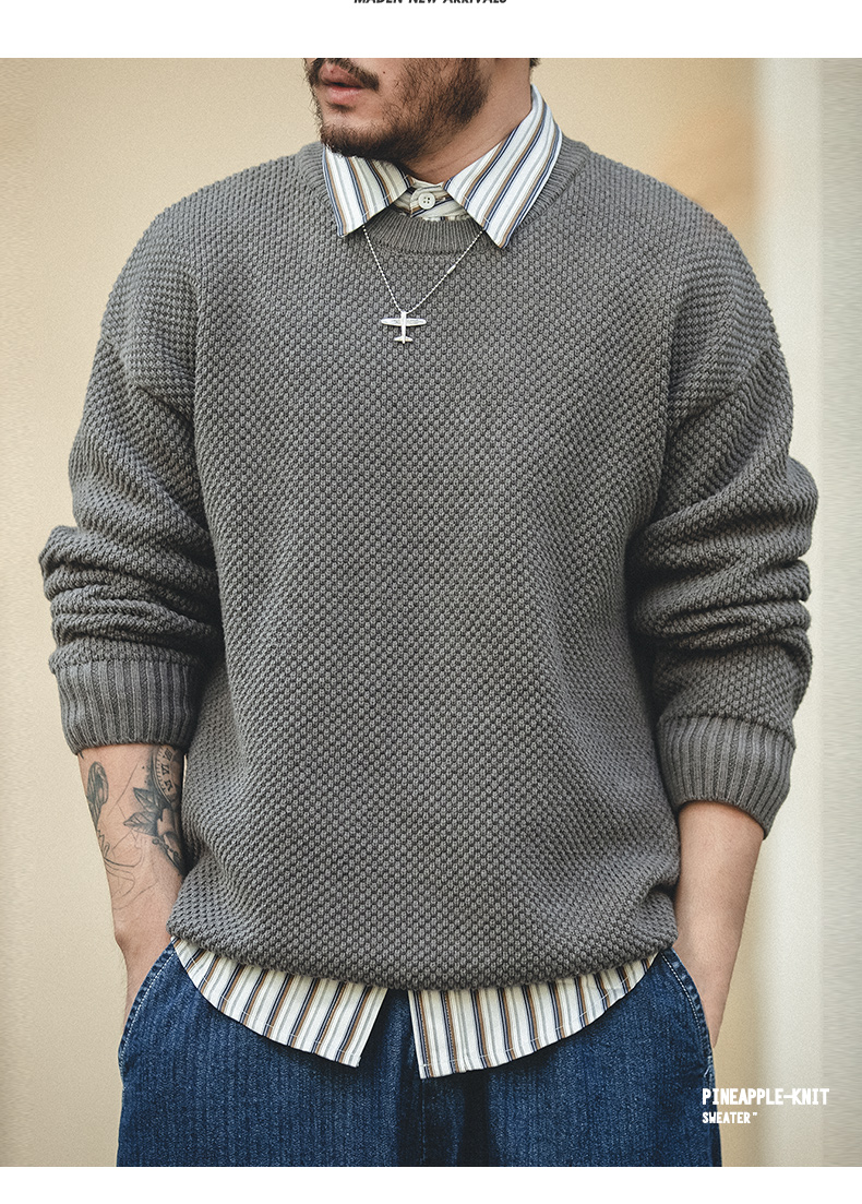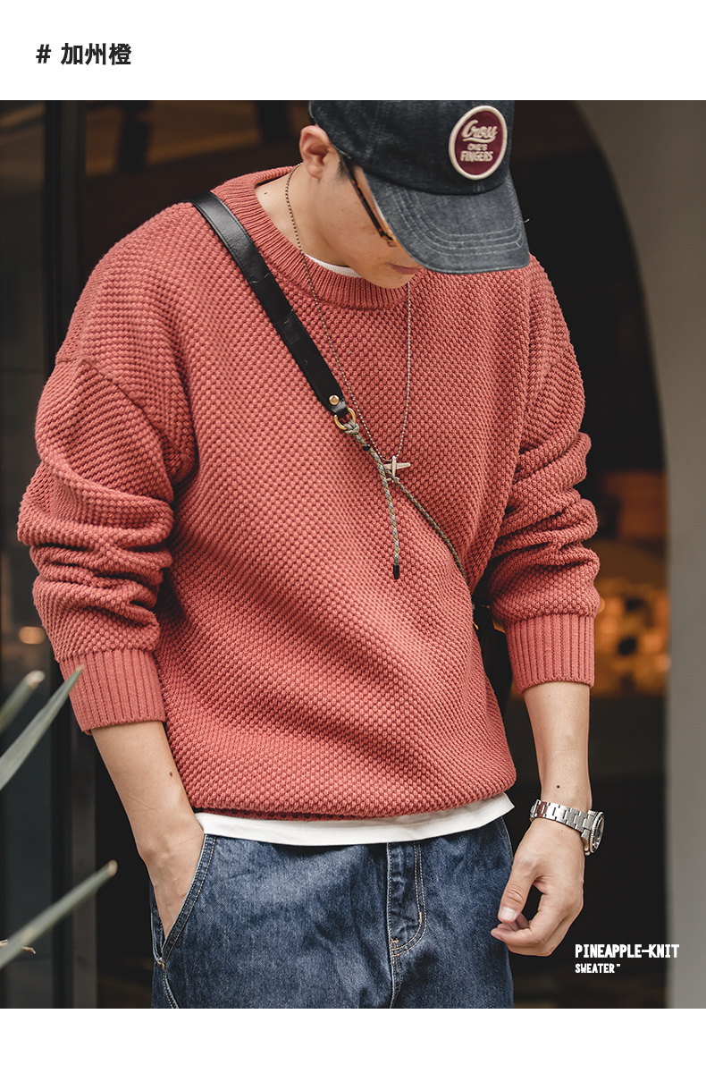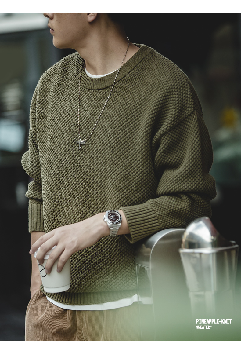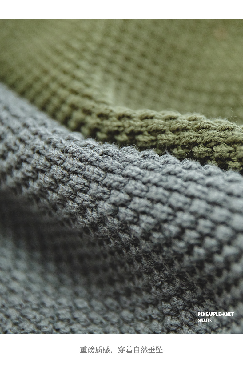 工装优选 美式复古重磅菠萝纹毛衣加厚圆领内搭慵懒针织衫男衣春季