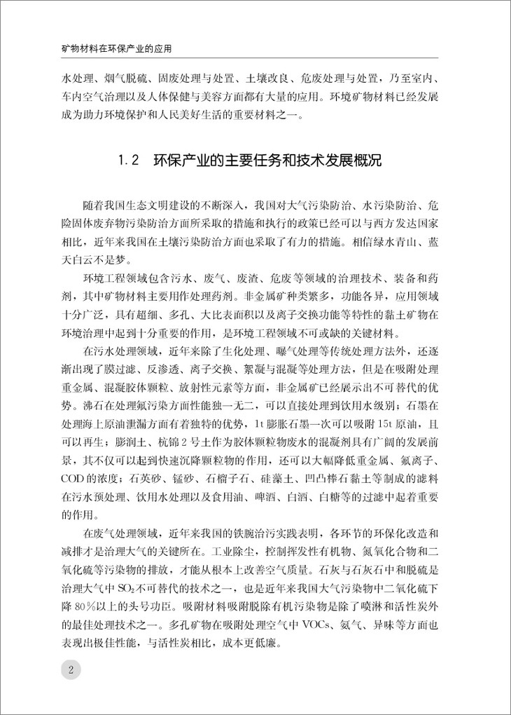 随着我国经济的发展和技术的进步,非金属矿和矿物材料在环境工程、室内和车内环境净化方面起着越来越重要的作用。为了弄清楚哪些非金属矿和矿物材料在环境工程中有实际应用,又分别起到什么作用,以及相关非金属矿资源的保障能力,自然资源部信息中心于2019年1月开始委托中国地质大学(北京)、北京工业职业技术学院、中国粉体技术网和中国绿色建材产业发展联盟全国非金属矿专业委员会开展了矿物材料在环境工程中应用状况的调查研究。该调查研究工作和本书的撰写、统稿由杜高翔副教授负责,北京工业职业技术学院王佼教授、中国地质大学(北京)谢艳博士以及北京依依星科技有限公司刘莉、朱红龙、冯文祥等同志参与了项目的调查研究和书稿的编撰工作。本书是以这次系统调查研究工作为基础整理而成的。书中引用了中国矿业大学(北京)郑水林教授、中国地质大学(北京)丁浩教授、中国科学院兰州化学物理研究所王爱勤教授等众多同行科研团队的科研成果,参考了中国粉体技术网和粉体技术网公众号7年来发表的相关文章,也参考了本书后面列出的文献中作者的成果,借鉴了非金属矿同行提供的关键数据。项目研究过程中得到自然资源部信息中心多位领导和非金属矿行业同行的支持,本书在编写过程中还得到中国建材工业出版社的大力支持和帮助。在此,向以上提到的个人和单位表示感谢!