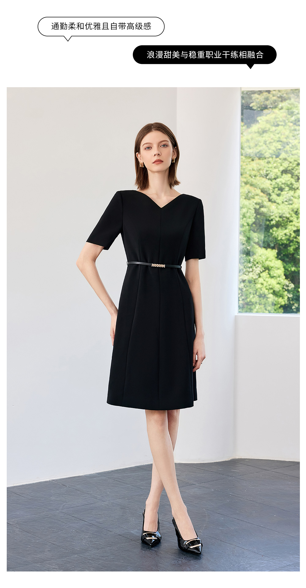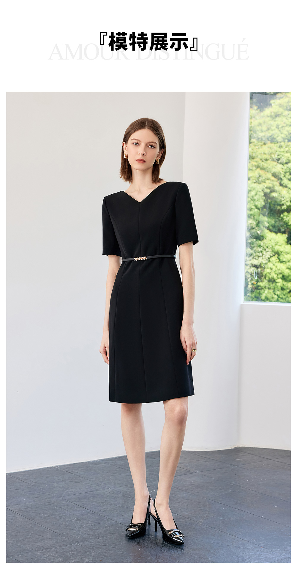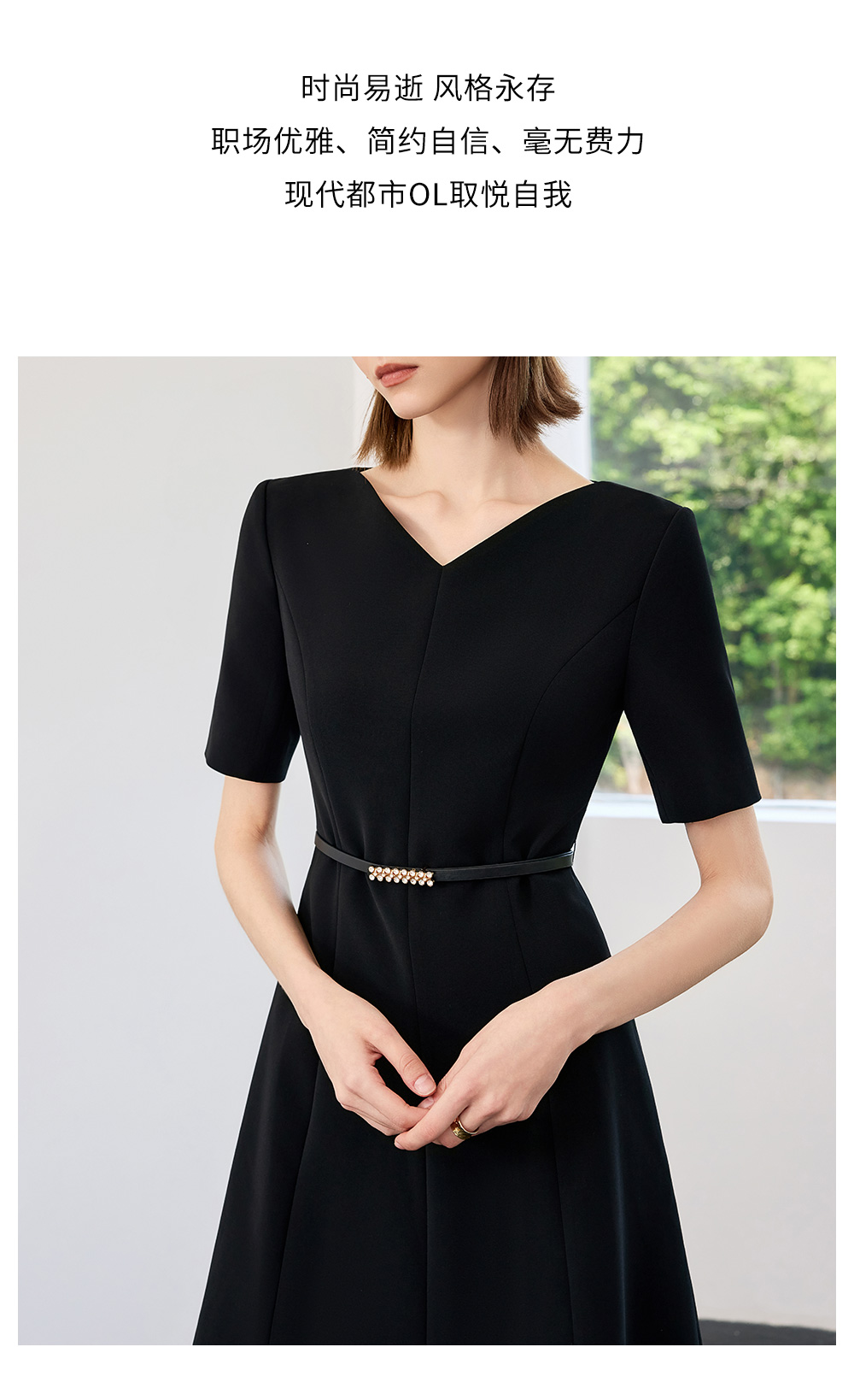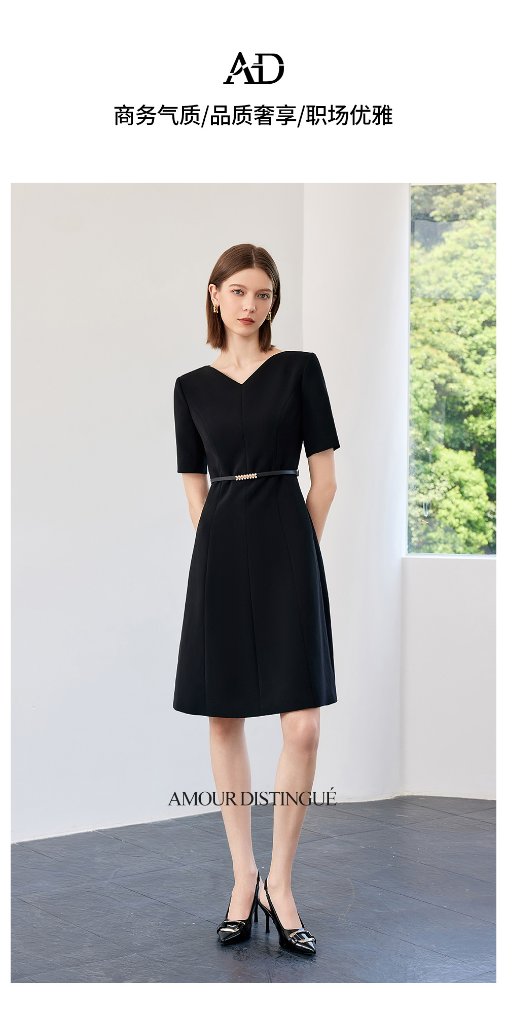 AD高端轻奢黑色连衣裙女2025新款夏季通勤气质收腰显瘦短袖裙子